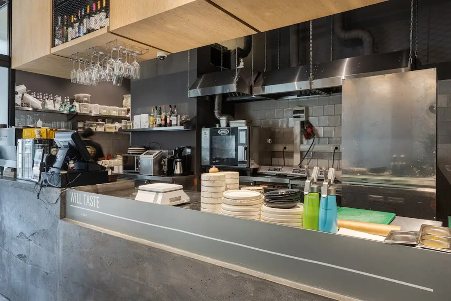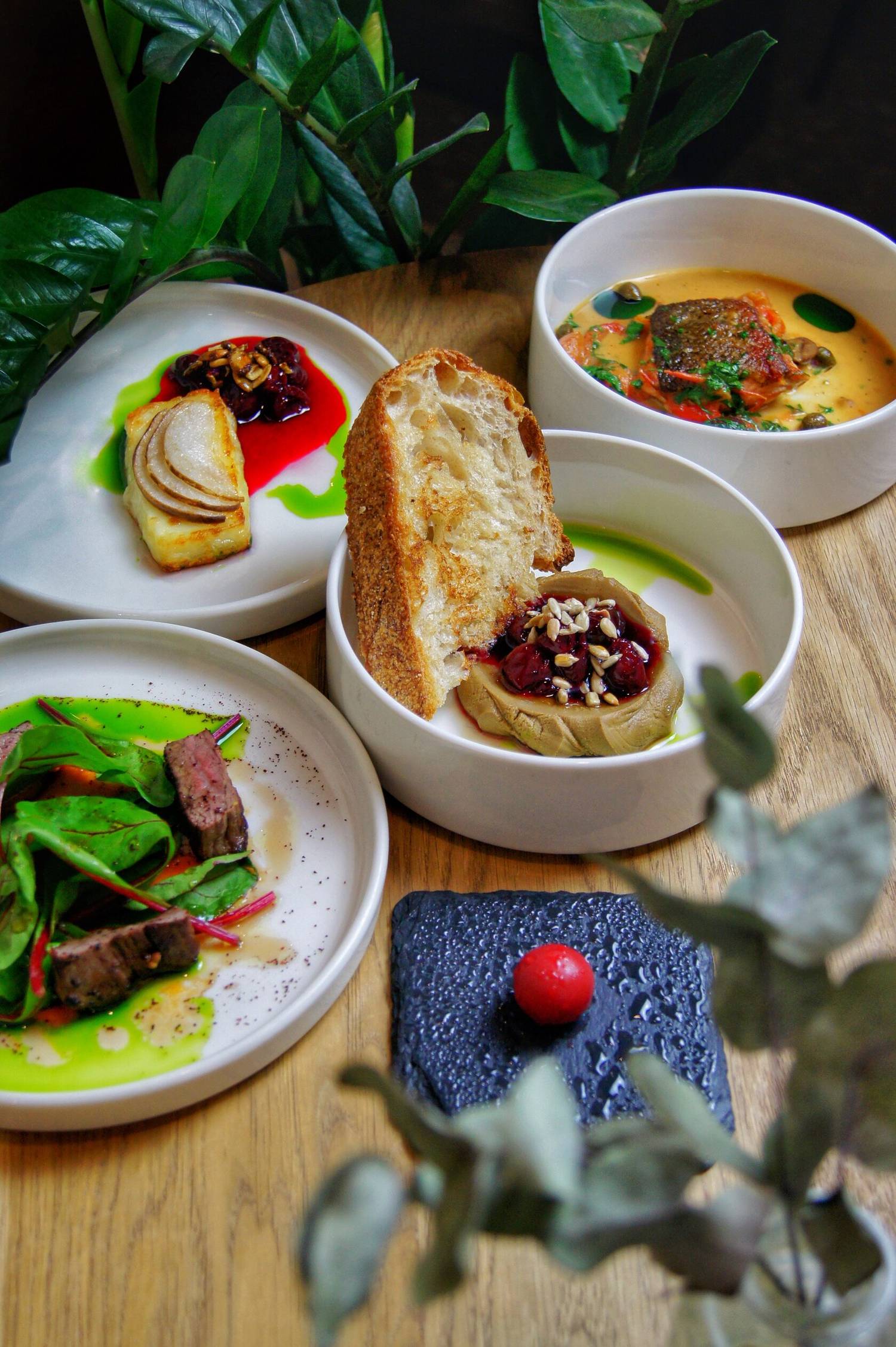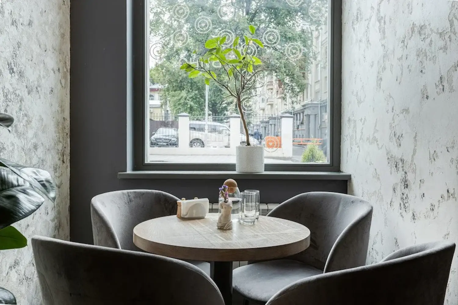 Атмосфера. Светлое пространство с панорамными окнами и спокойной палитрой серо-бежевых тонов создает ощущение легкости. Интерьер дополняют изумрудные акценты, высокие растения в кадках и авторская керамика. На полках расставлены миниатюрные фигурки, а открытая кухня и несколько зон — от уютных столиков у окон до общей лаунж-зоны — позволяют каждому гостю найти комфортный уголок.