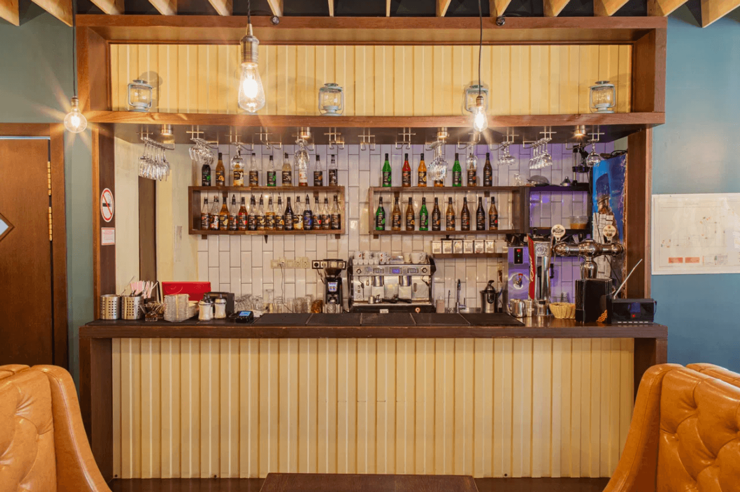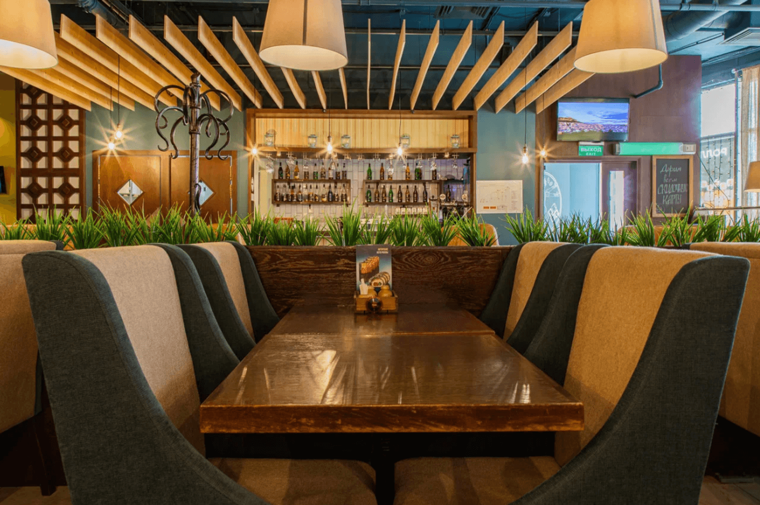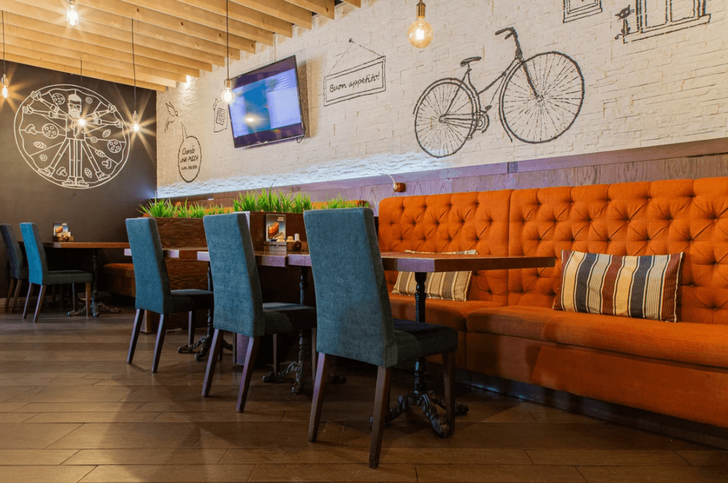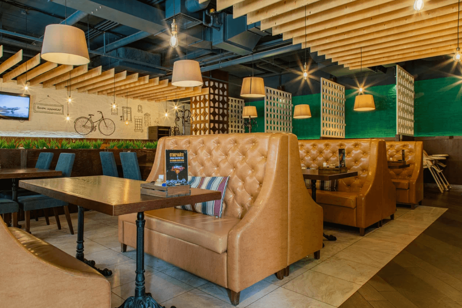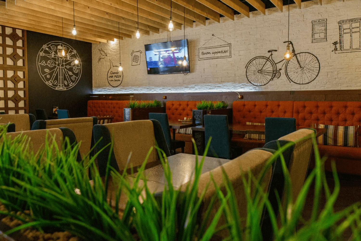 Атмосфера. Интерьер в фирменном стиле сети с акцентом на контрасты: светлое и темное дерево, кремовые стены и бирюзовые акценты. Колонны с резными панелями, подсветка, живые растения и черные графичные рисунки велосипеда, вывесок и пиццы добавляют изюминки. Летом открывается терраса.