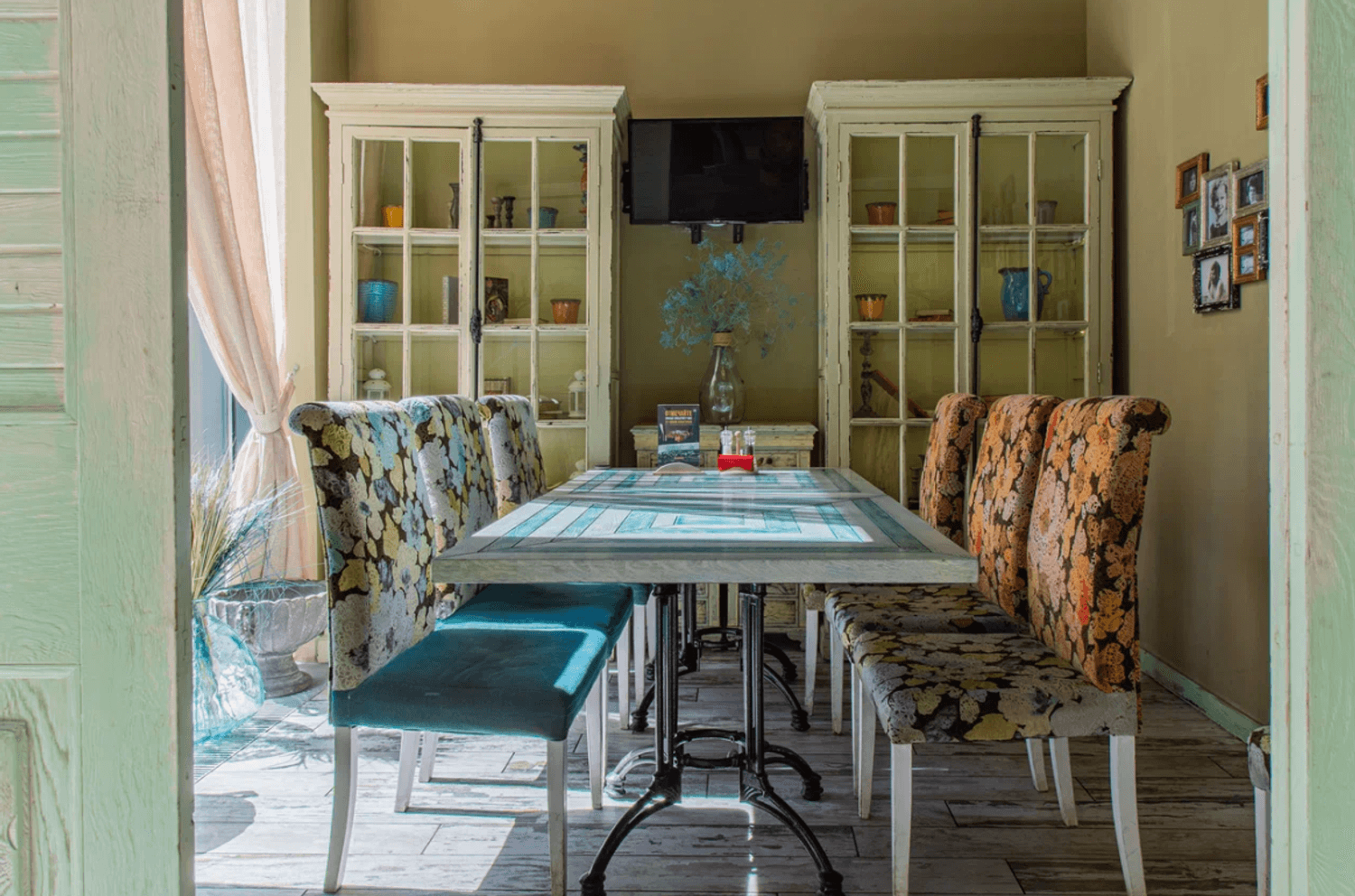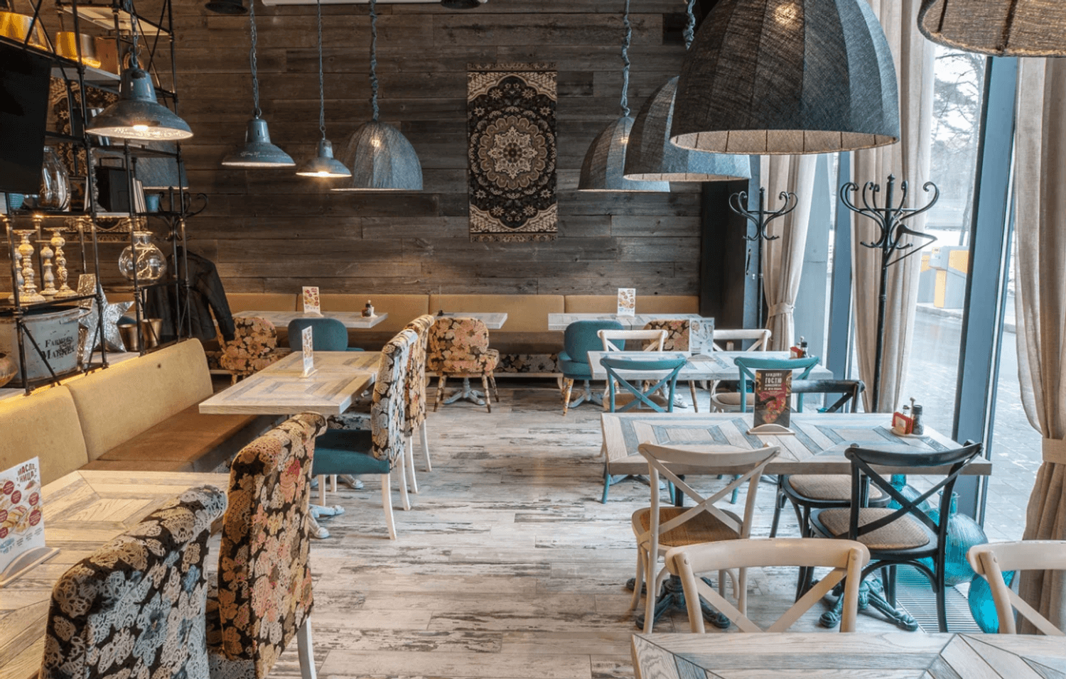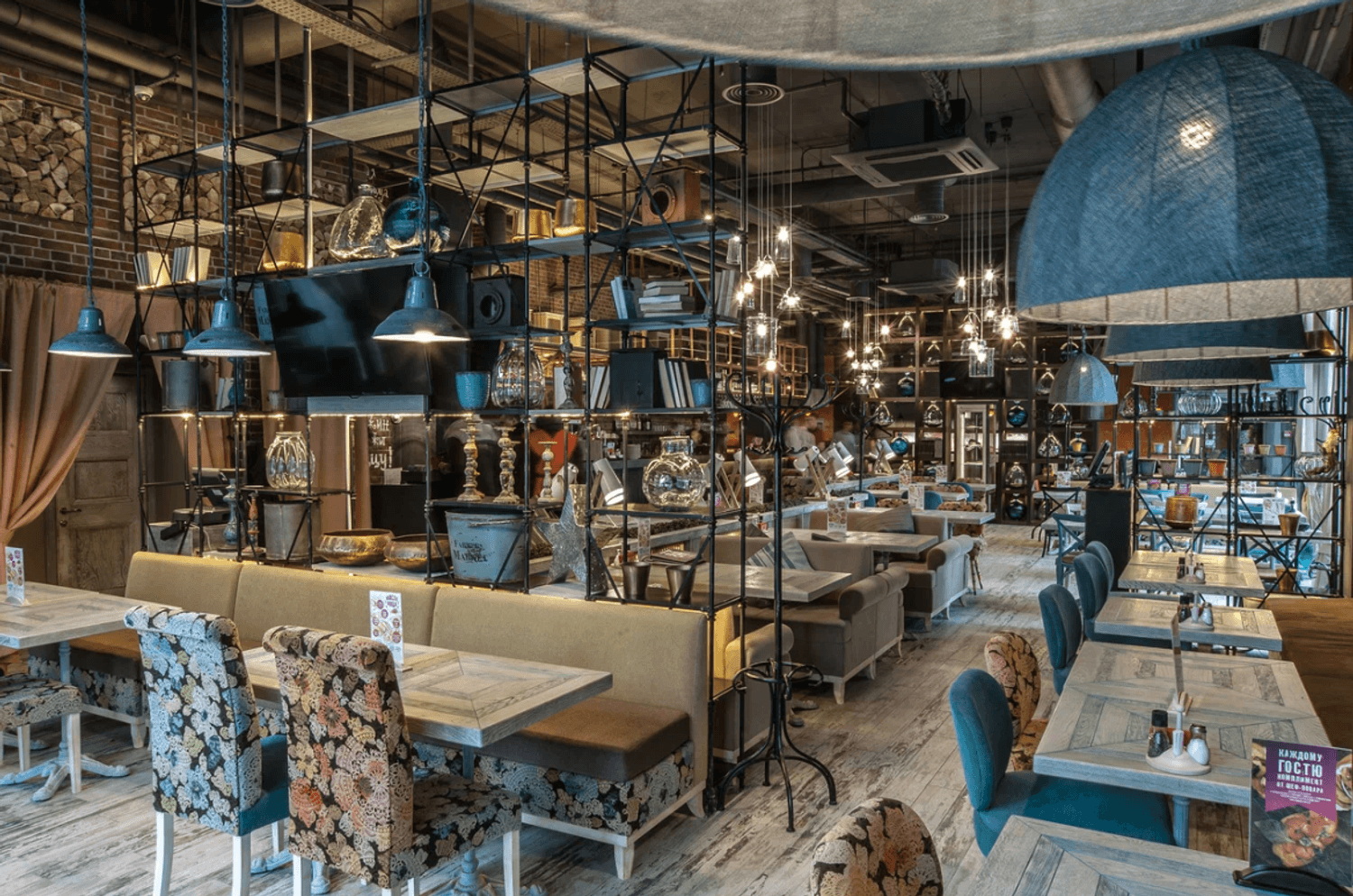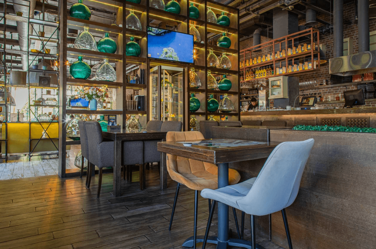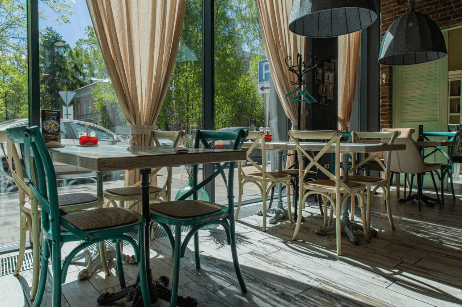 Атмосфера. В заведении просторный светлый зал с высокими потолками и панорамными окнами. Элегантную обстановку в спокойных тонах дополняют яркие акценты — голубые абажуры светильников и кресла с цветочным принтом. Здесь будет комфортно как большим компаниям на мягких диванах, так и парам за уединенными столиками.