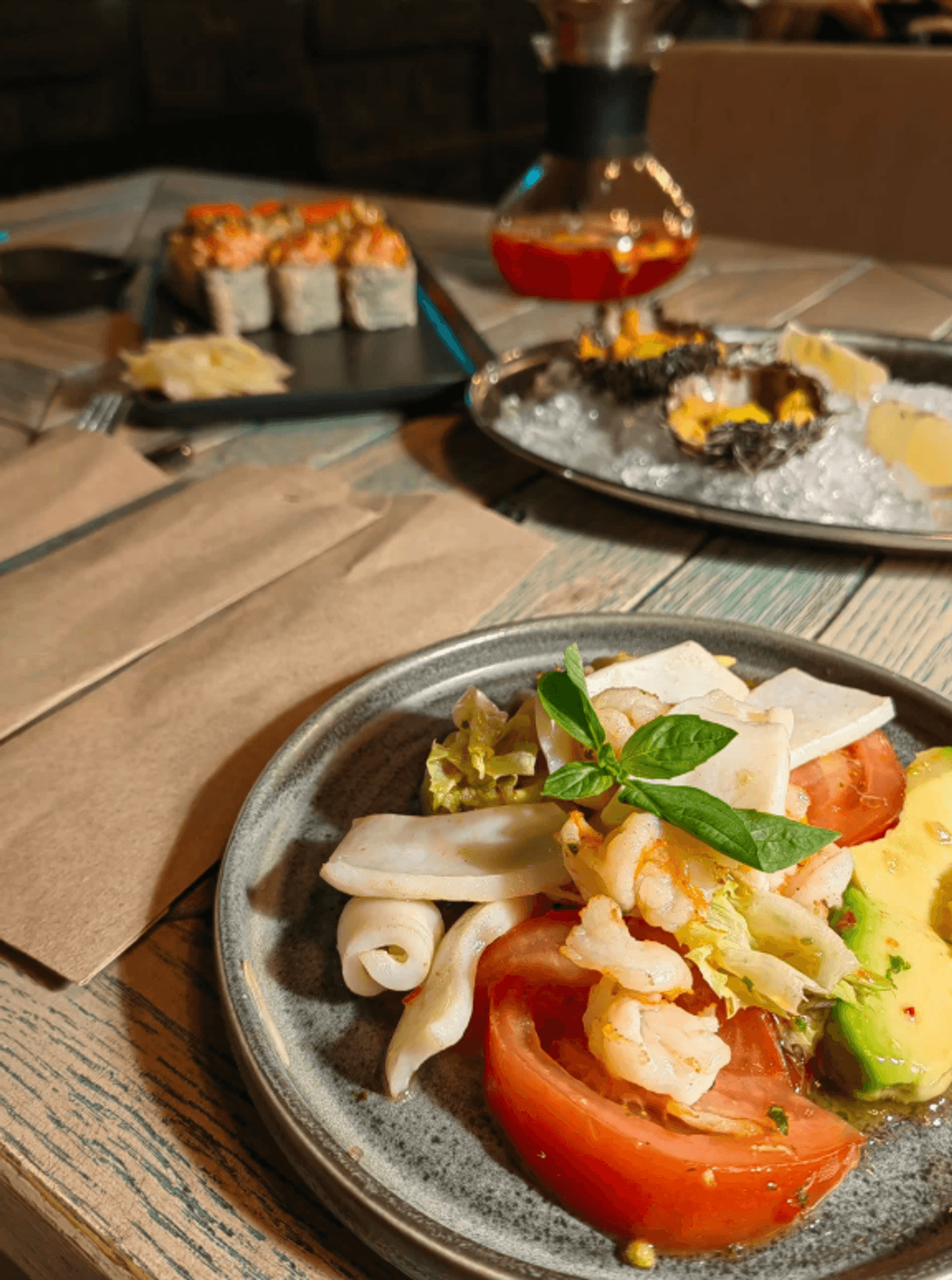 Еда и напитки. Здесь гармонично сочетаются японская кухня и европейские гастрономические традиции. В меню — как классические роллы «Калифорния» и «Филадельфия», так и авторские, например, «Абури» или «Блю Кюрасаю» с голубым кремом. К еде можно заказать крафтовые напитки, отдельно представлены завтраки, вегетарианские позиции и детское меню.