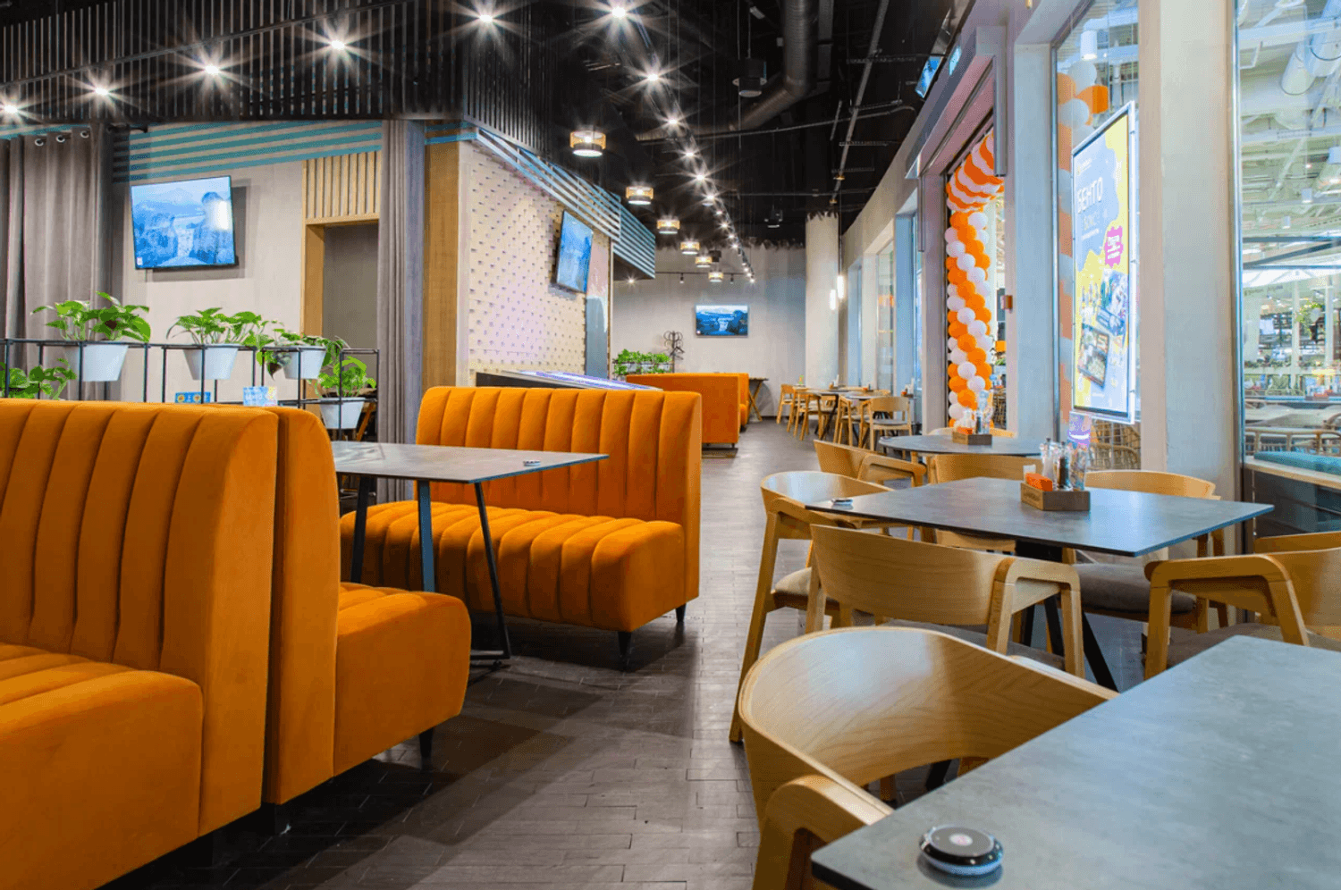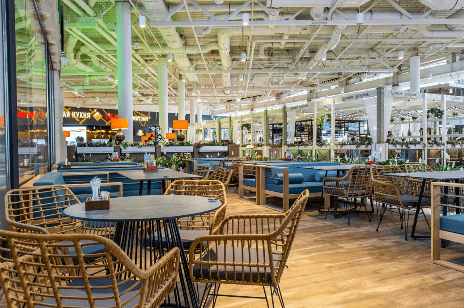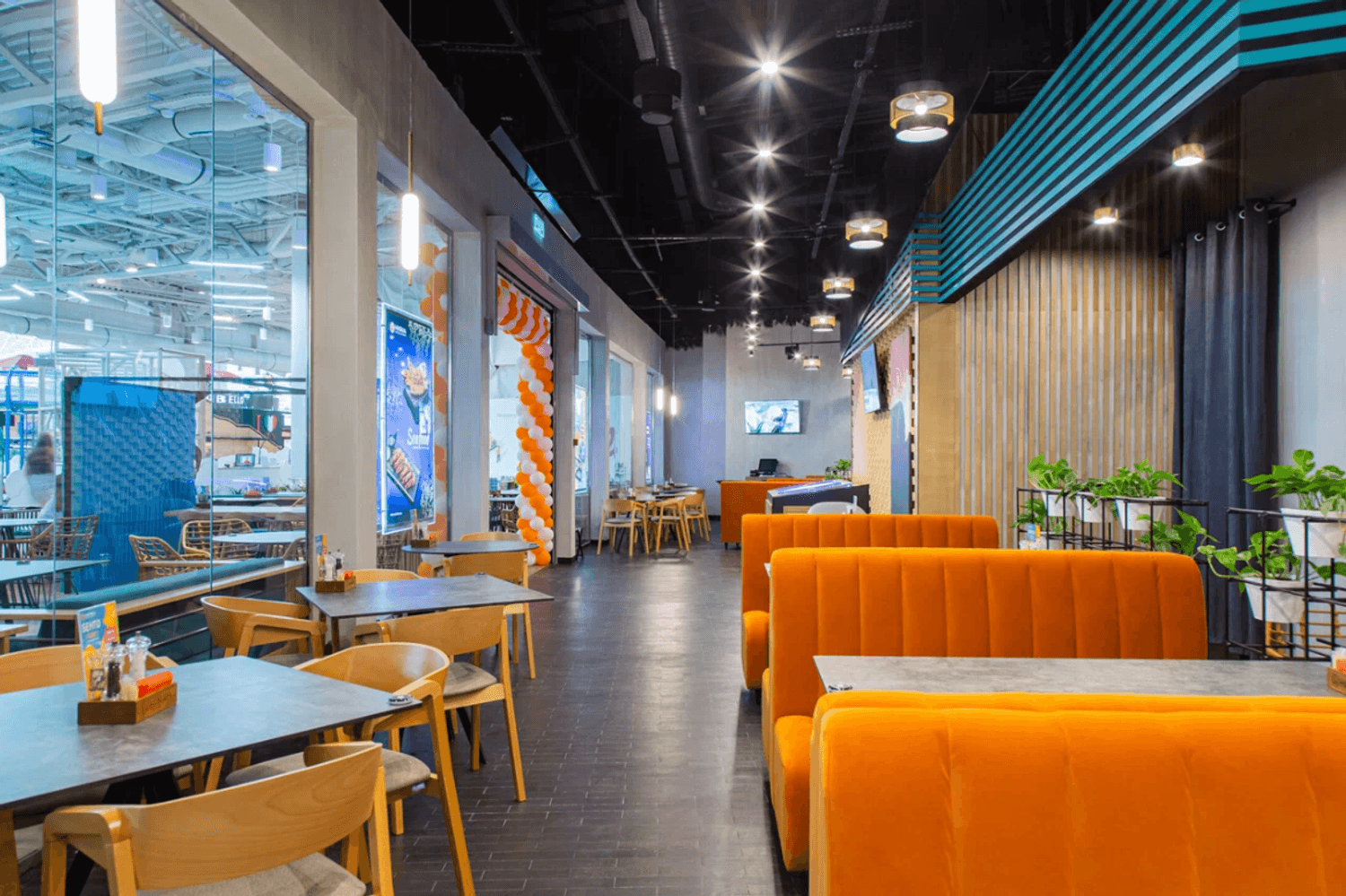 Атмосфера. Просторный зал на четвертом этаже поражает разнообразием зон: можно сесть у панорамных окон, наблюдать за работой поваров на открытой кухне или расположиться в зеленой части с видом на атриум. Здесь яркие оранжевые диваны, бирюзовые акценты и декоративные панно в азиатском стиле задают энергичный и жизнерадостный тон.