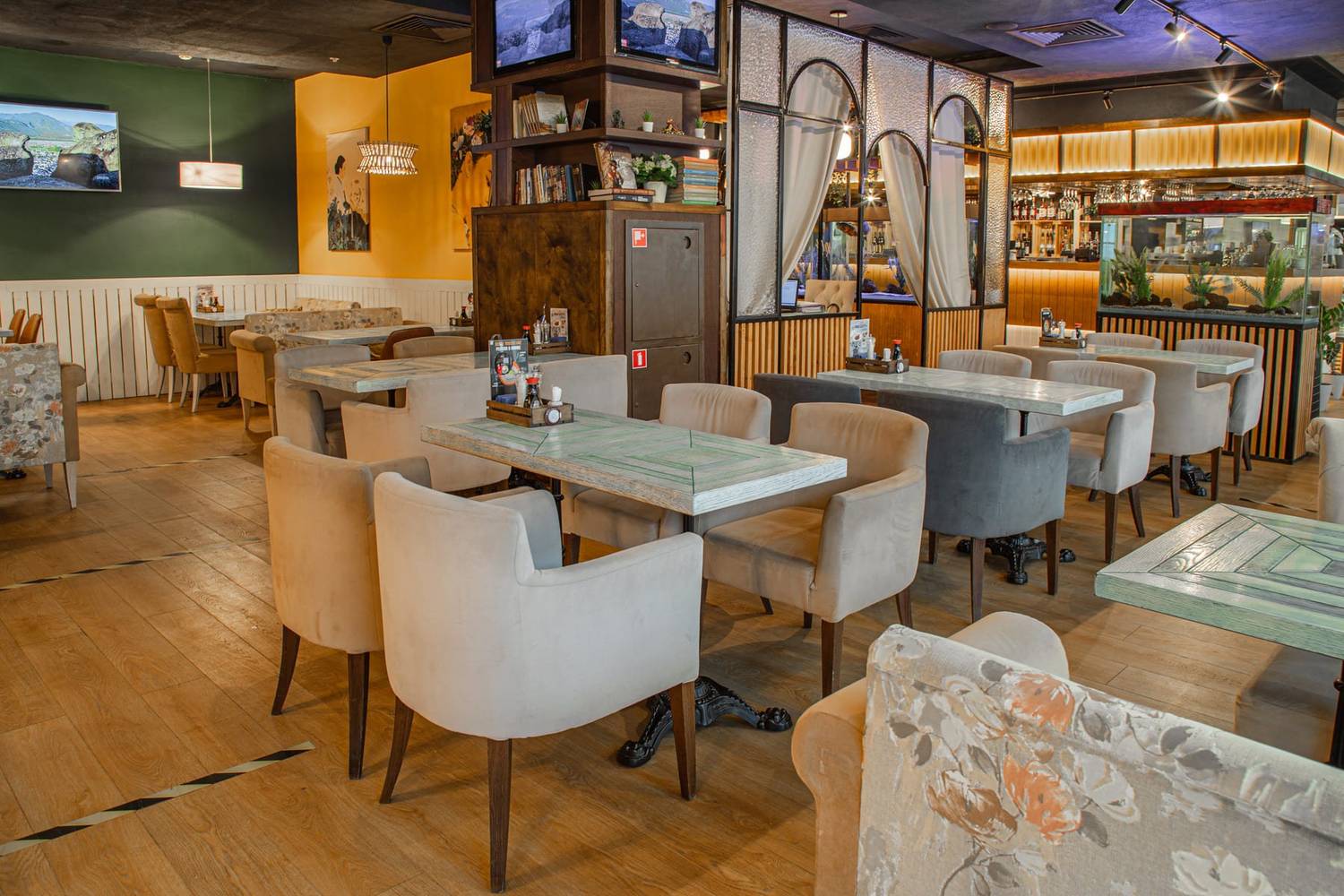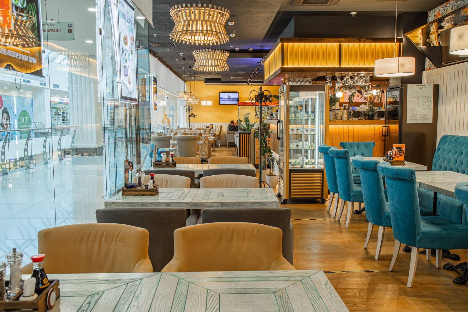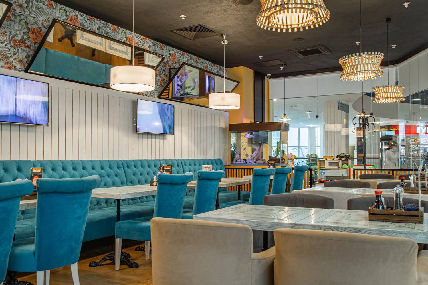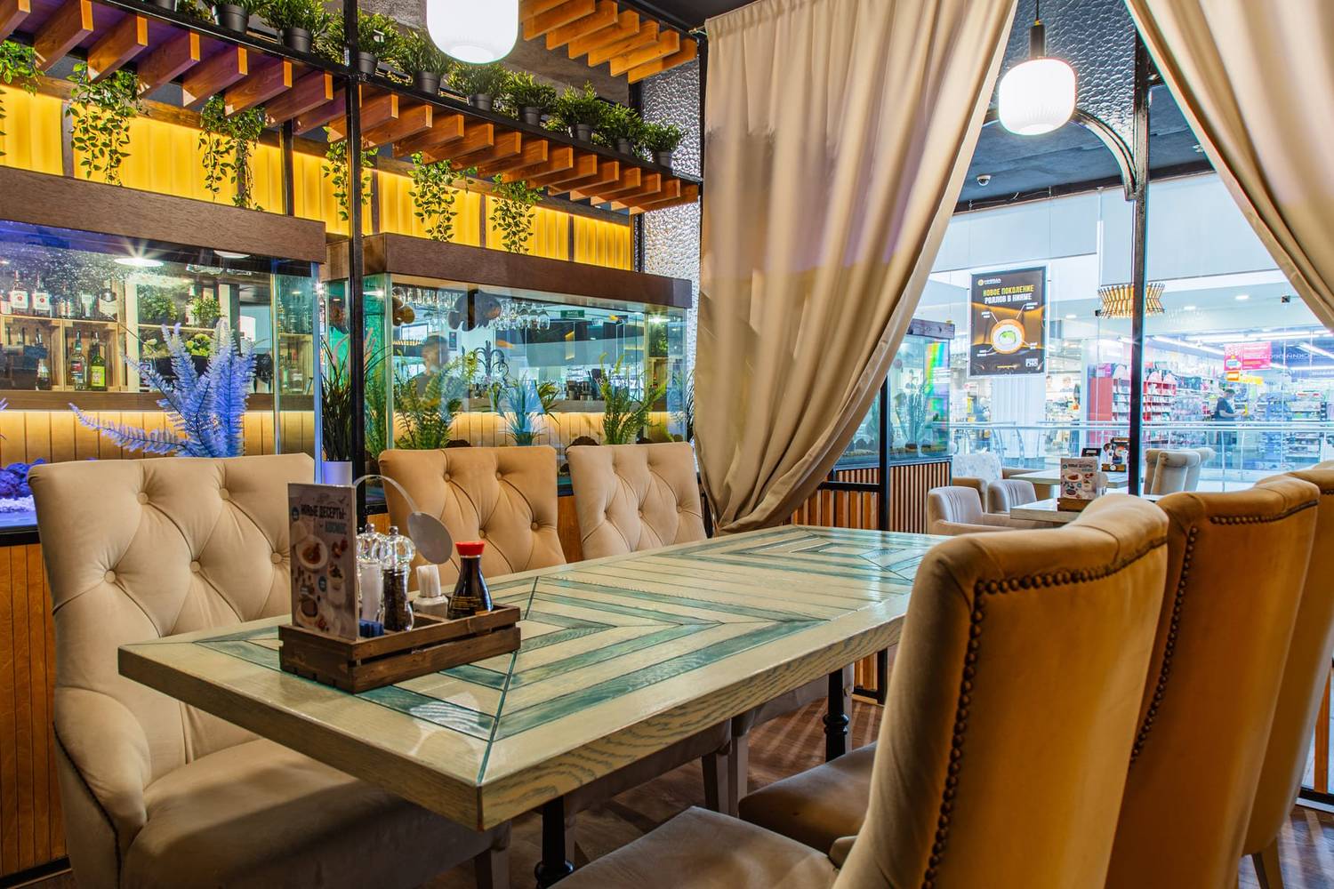 Атмосфера. Интерьер выдержан в гармонии: светлое дерево, кремовые тона и сочная бирюза. Панорамные окна, уютные диванчики, резные панели и живые зеленые акценты создают спокойную и стильную обстановку. Настоящим украшением зала является тропический аквариум у барной стойки, добавляющий пространству динамики и цвета.