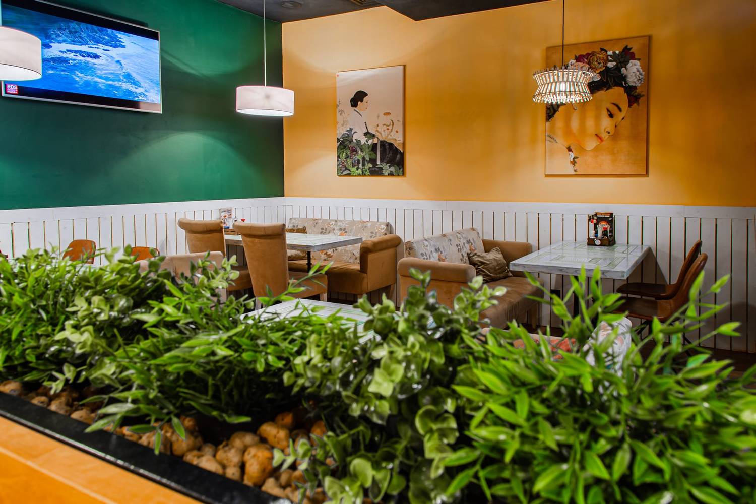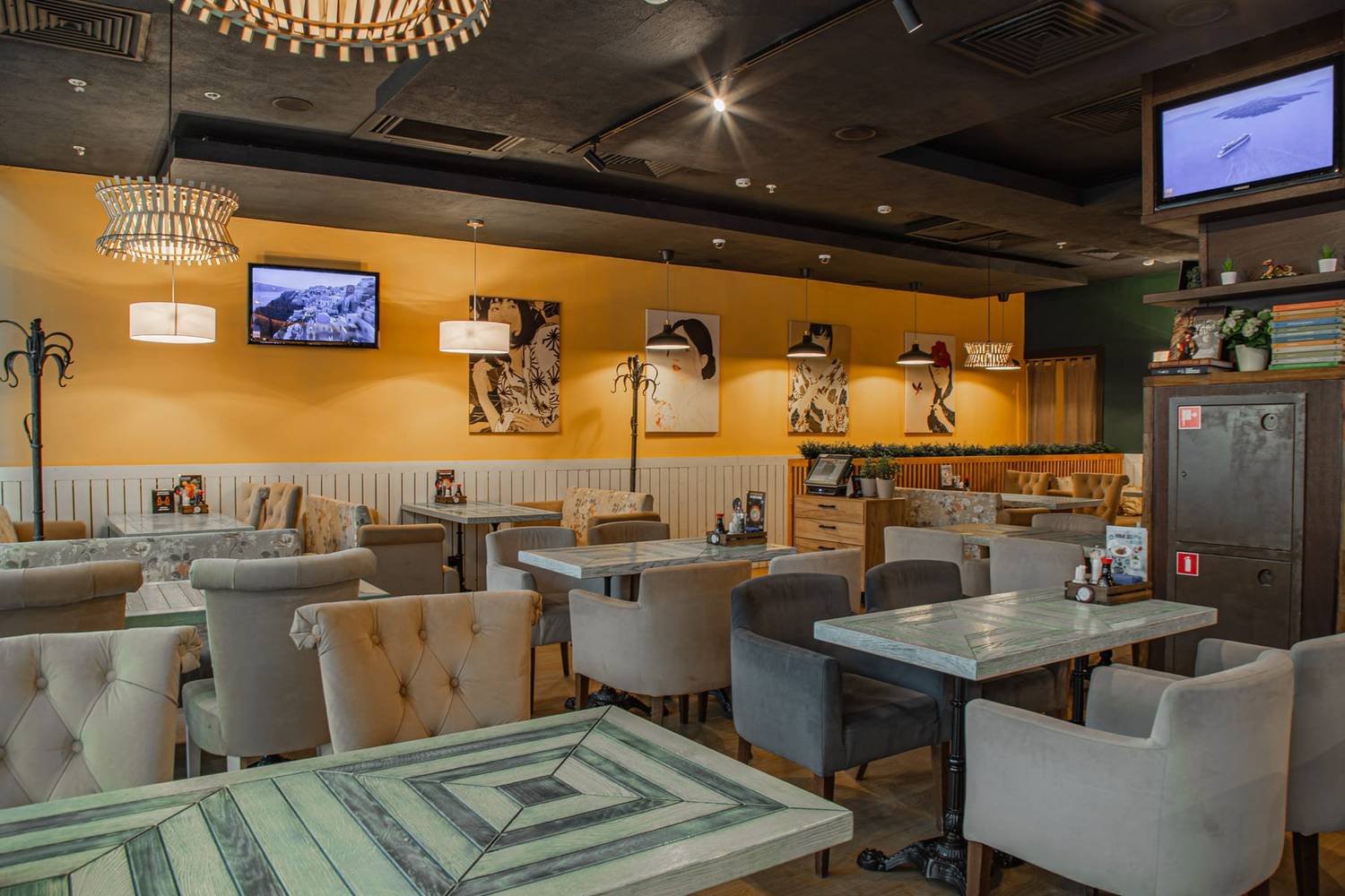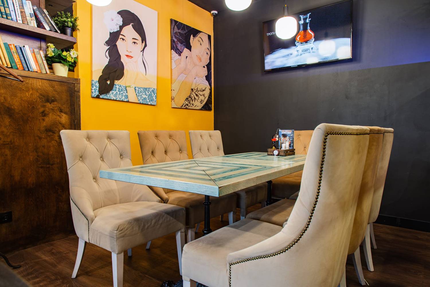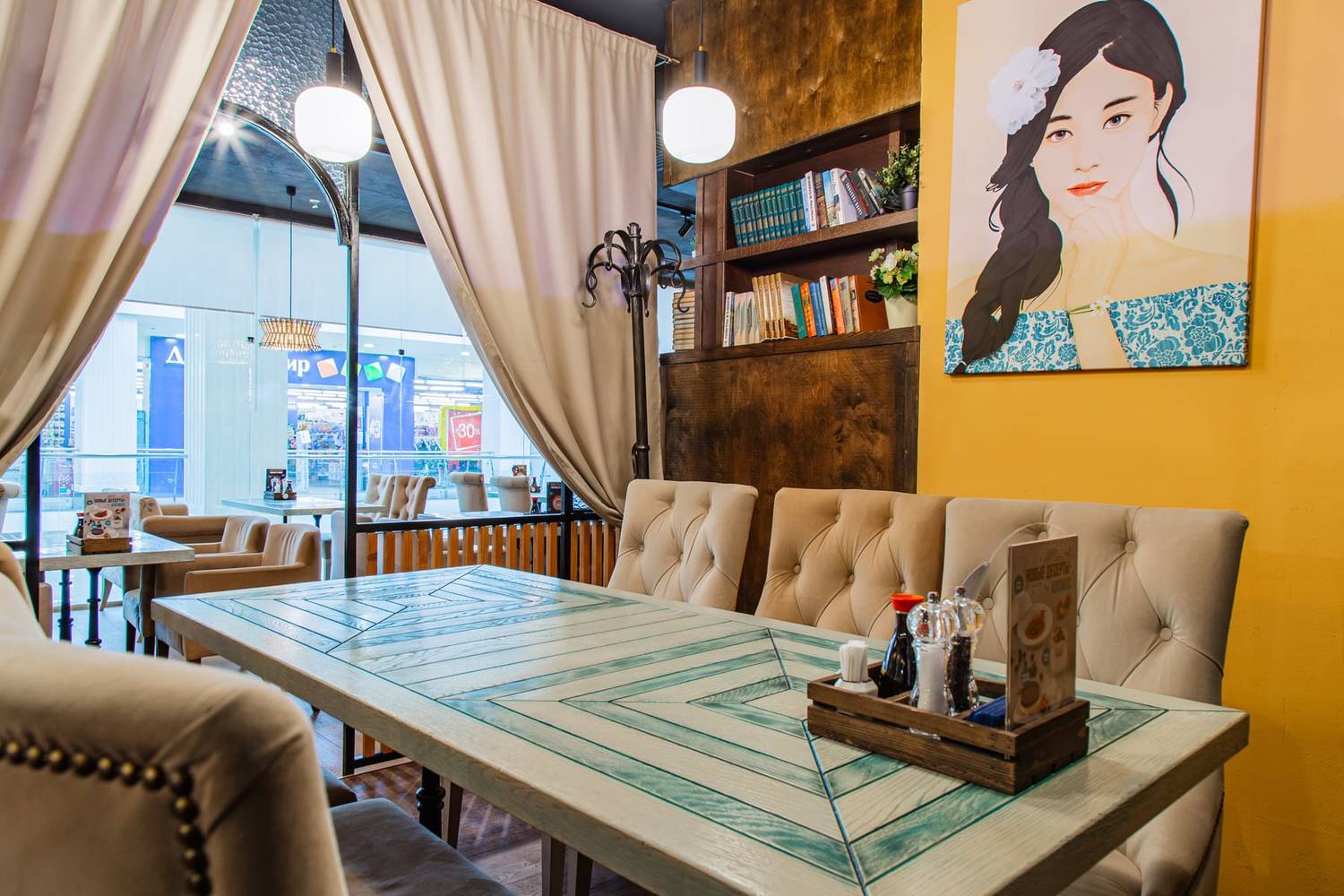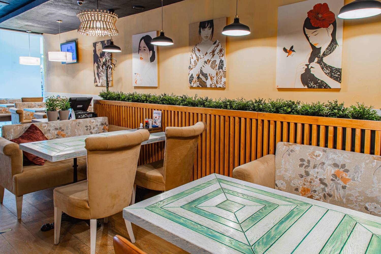 Атмосфера. Интерьер выдержан в гармонии: светлое дерево, кремовые тона и сочная бирюза. Панорамные окна, уютные диванчики, резные панели и живые зеленые акценты создают спокойную и стильную обстановку. Настоящим украшением зала является тропический аквариум у барной стойки, добавляющий пространству динамики и цвета.