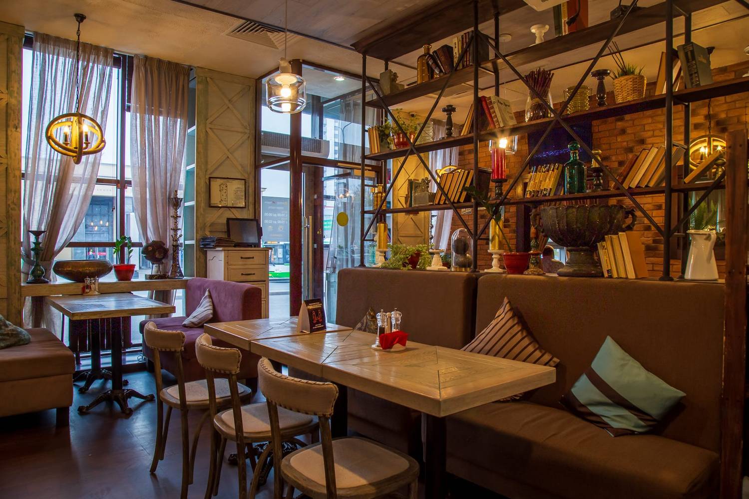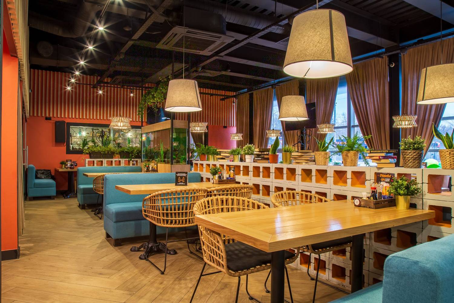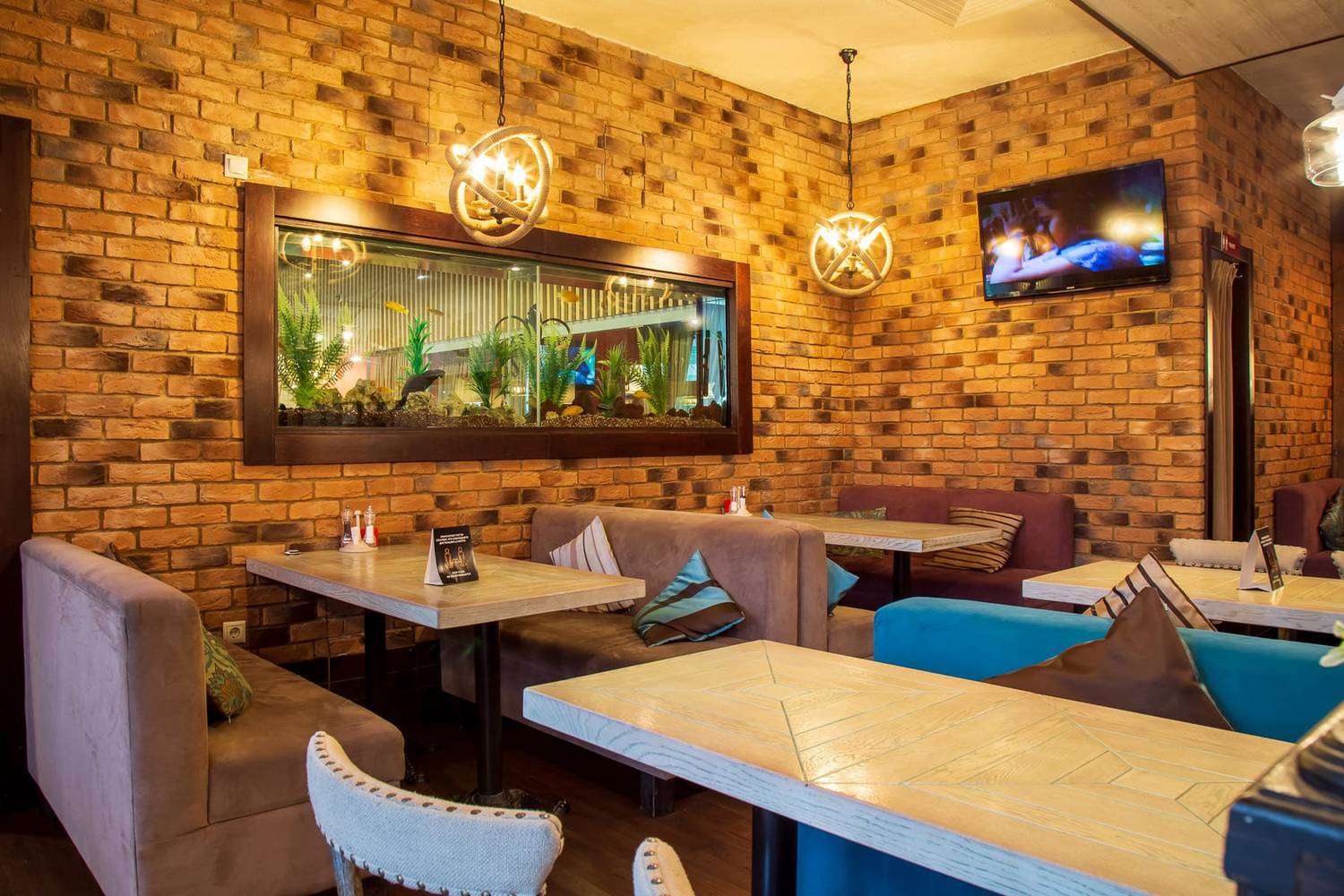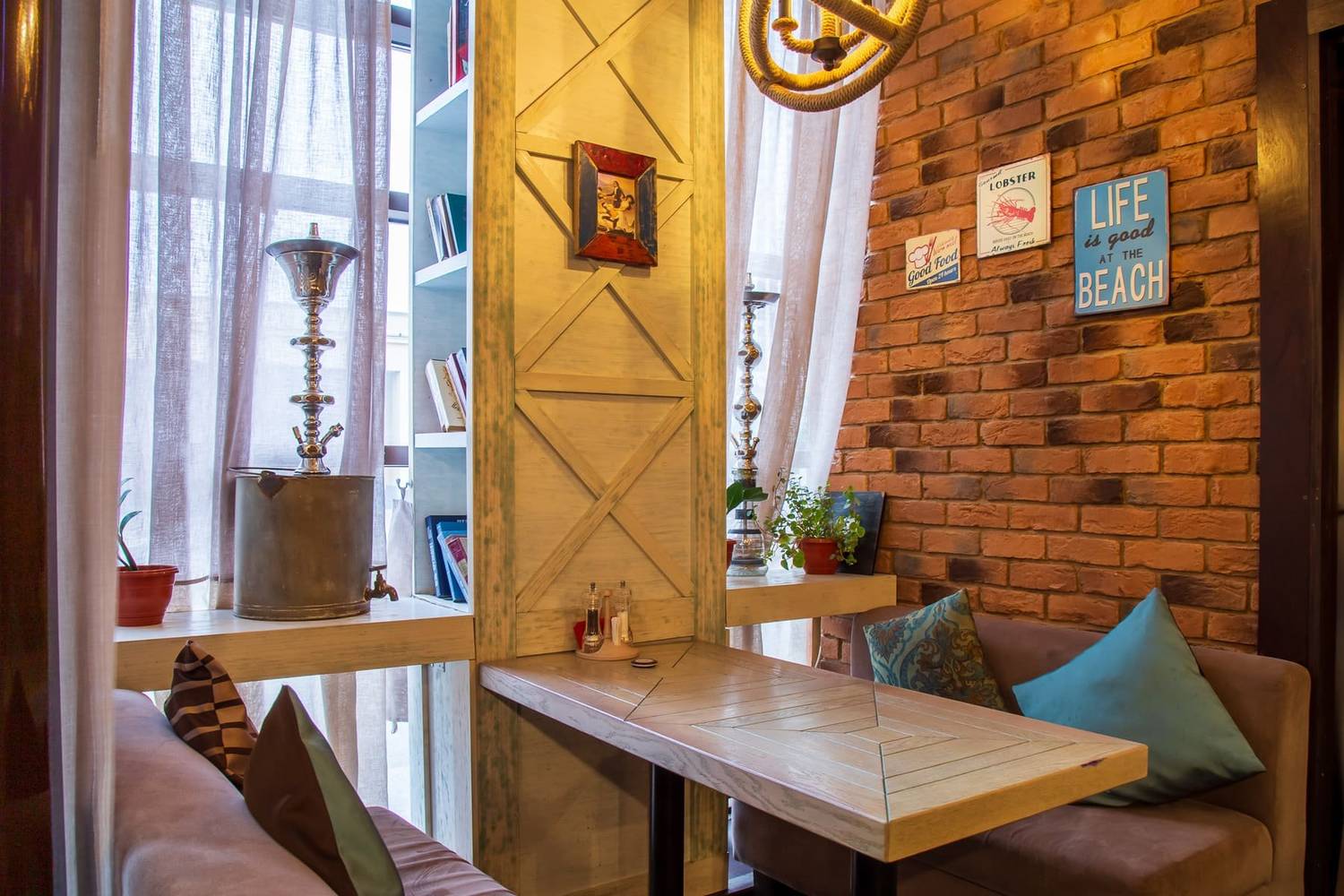 Атмосфера. Пространство разделено на несколько зон: зал с кирпичными стенами и светлыми диванами, яркий зал в рыжих тонах и зона с голубыми диванчиками и креслами из ротанга. Текстильные абажуры, стеллажи с книгами и растения создают домашнюю обстановку, а в теплое время года открывается просторная веранда.