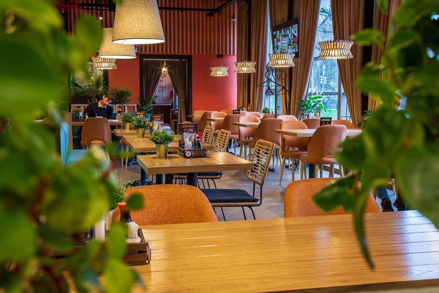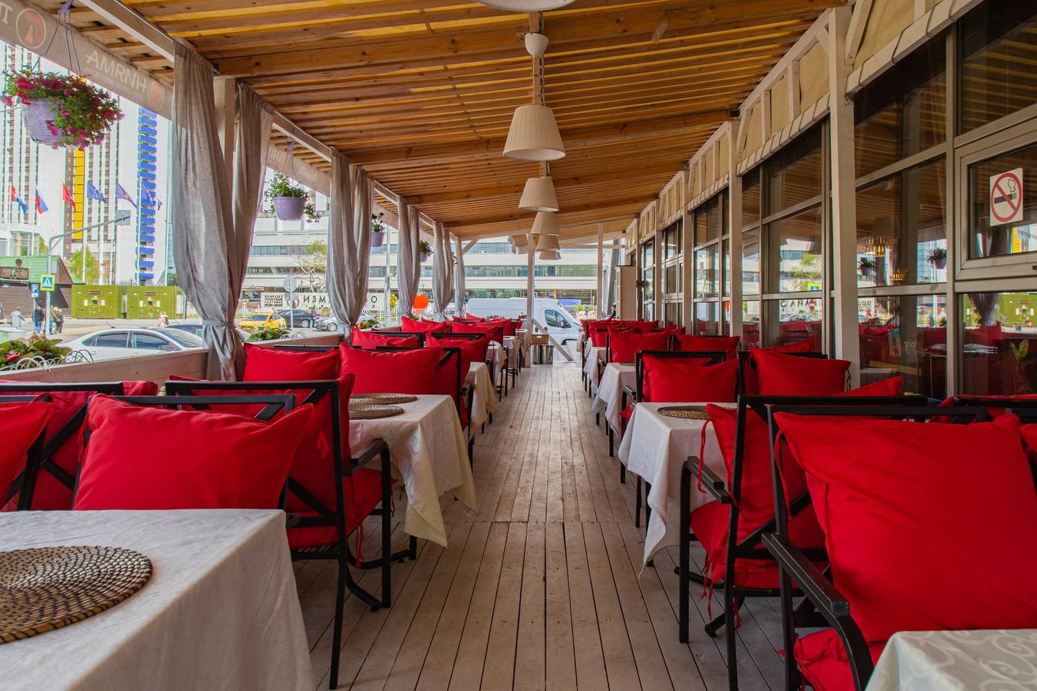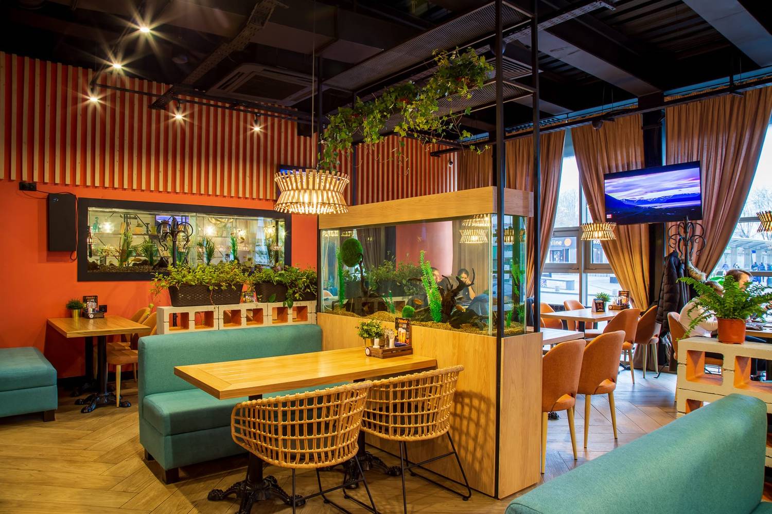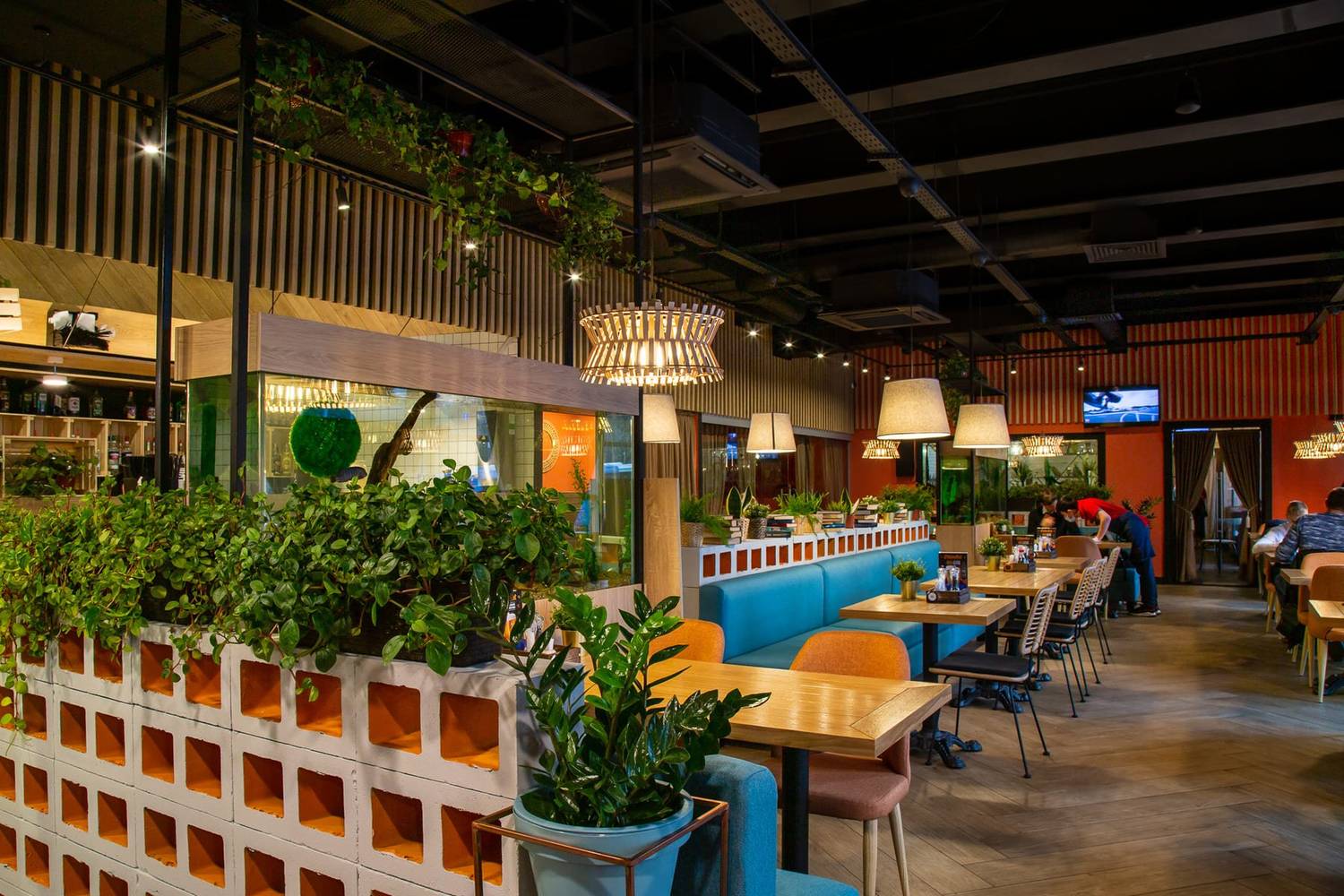 Атмосфера. Пространство разделено на несколько зон: зал с кирпичными стенами и светлыми диванами, яркий зал в рыжих тонах и зона с голубыми диванчиками и креслами из ротанга. Текстильные абажуры, стеллажи с книгами и растения создают домашнюю обстановку, а в теплое время года открывается просторная веранда.