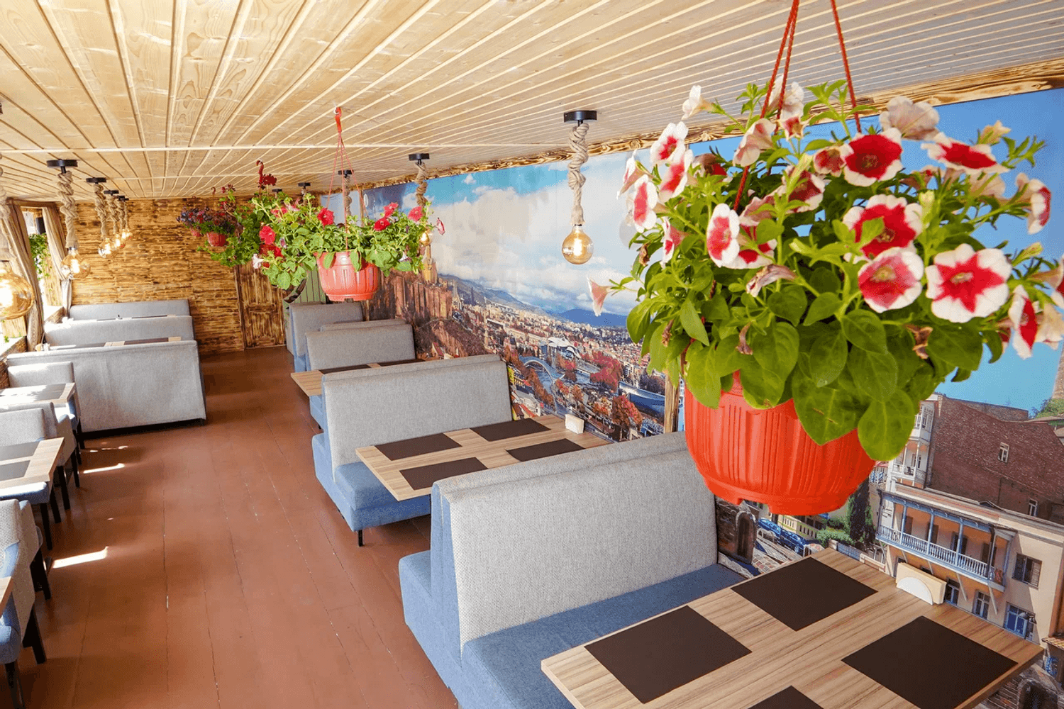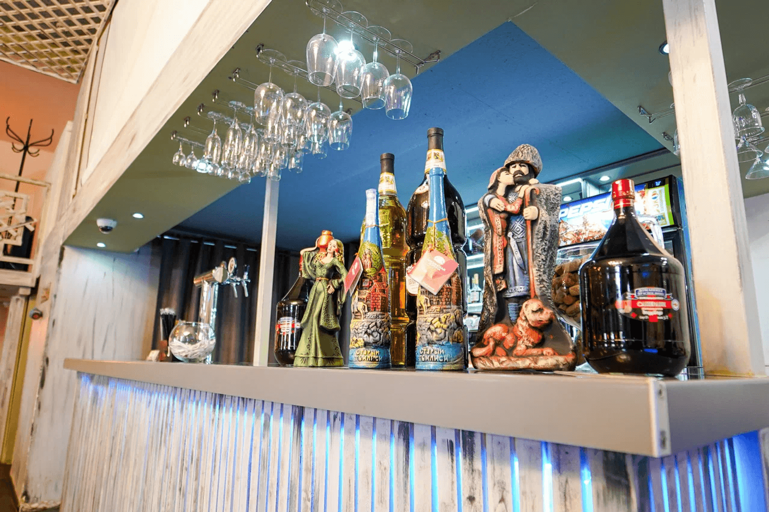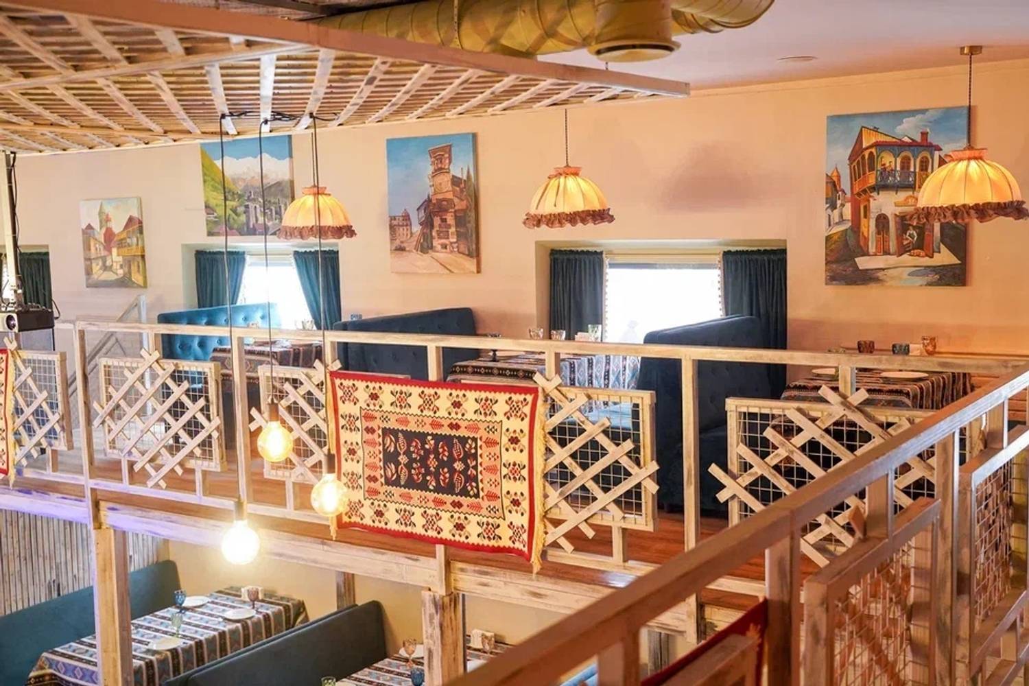 Атмосфера. Пространство разделено на общий зал, отдельные кабинеты и балкон с посадкой. В интерьере преобладают дерево, текстиль и теплый свет, что создает ощущение уюта традиционного грузинского дома.