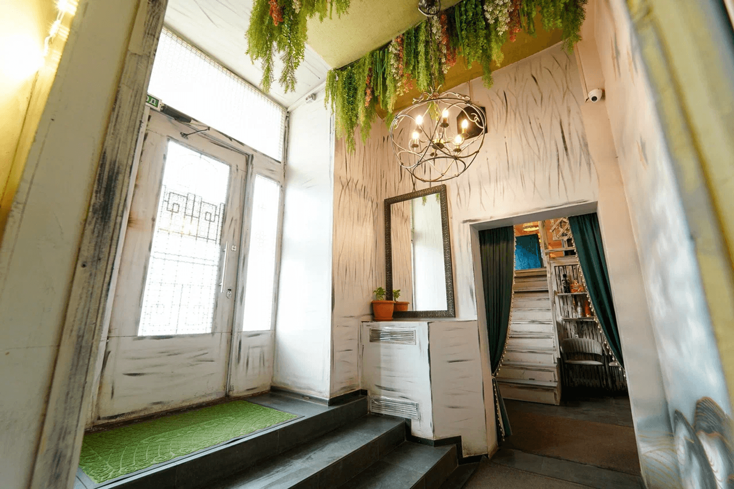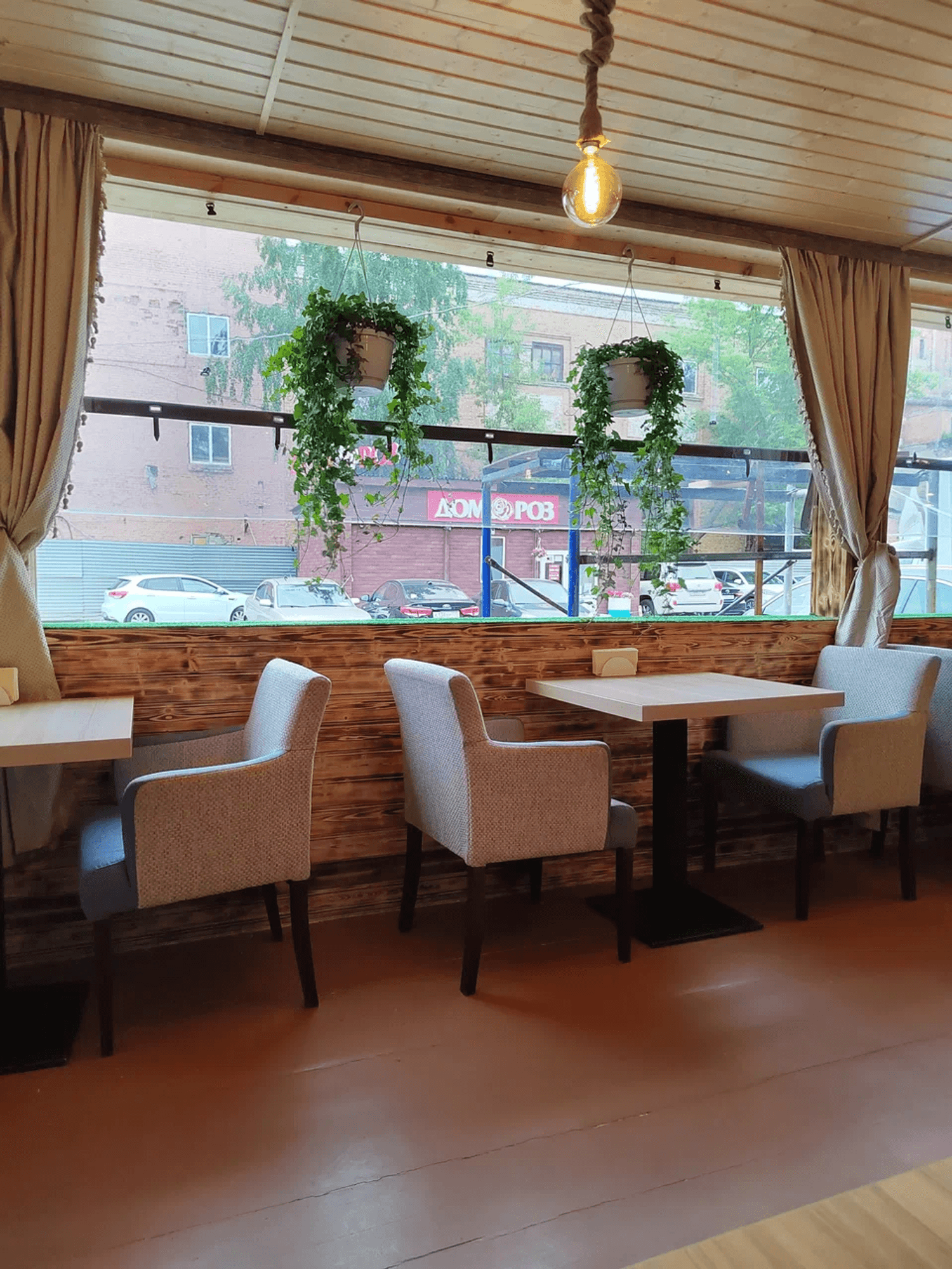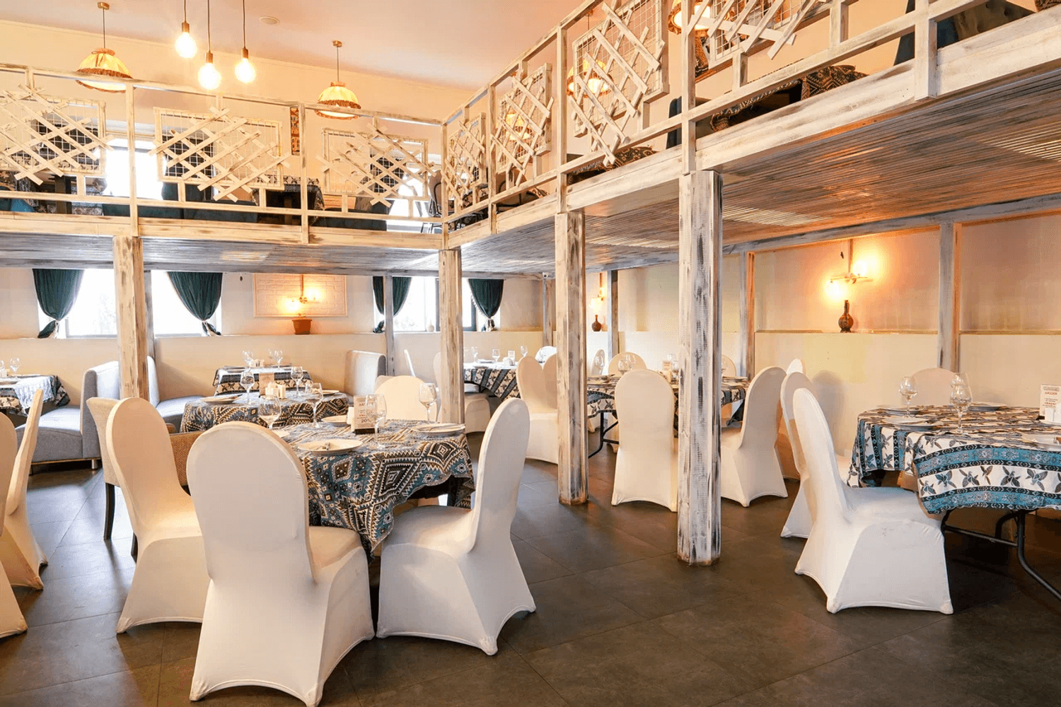 Атмосфера. Пространство разделено на общий зал, отдельные кабинеты и балкон с посадкой. В интерьере преобладают дерево, текстиль и теплый свет, что создает ощущение уюта традиционного грузинского дома.