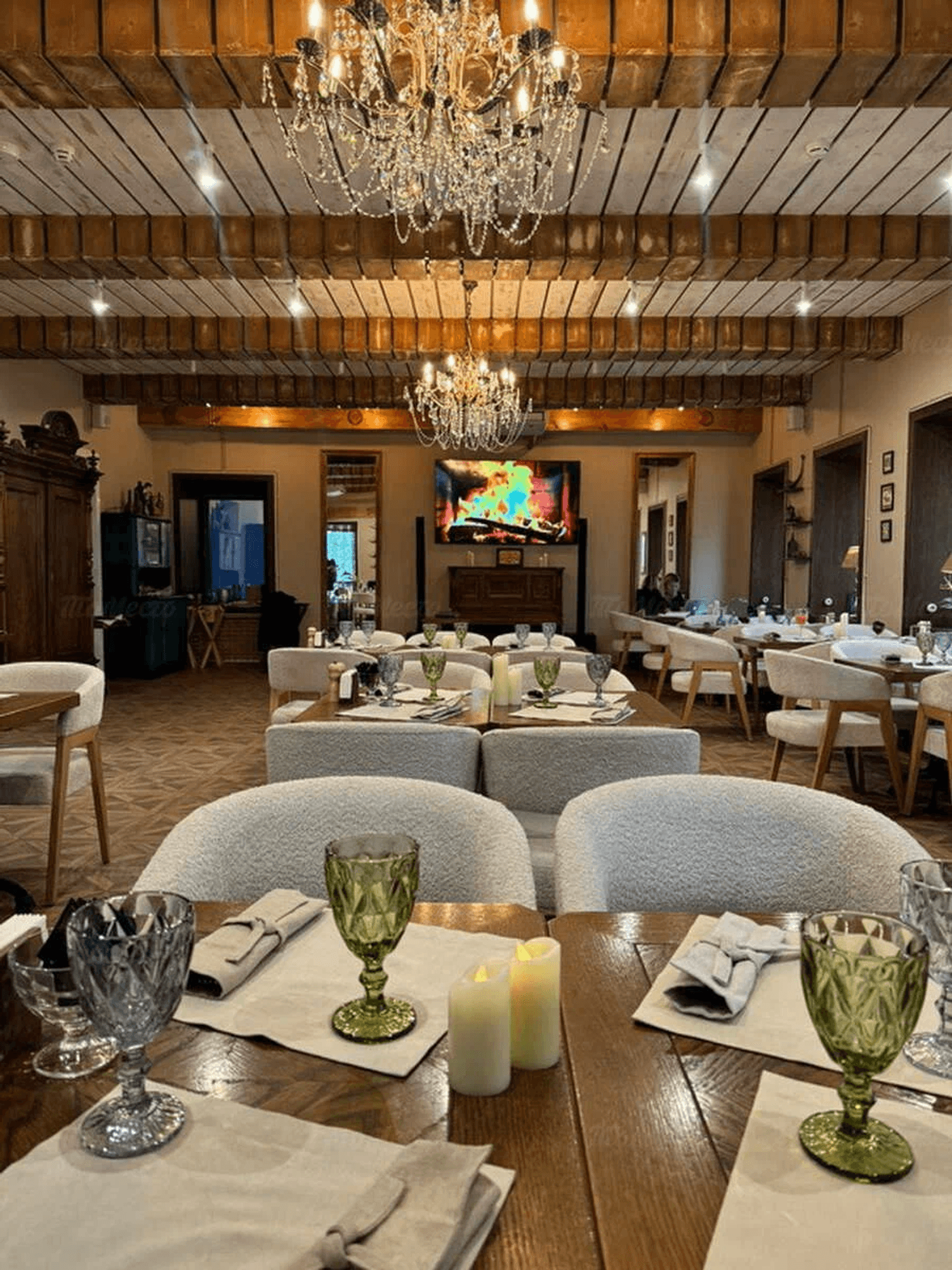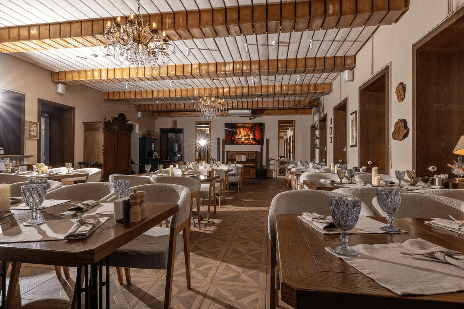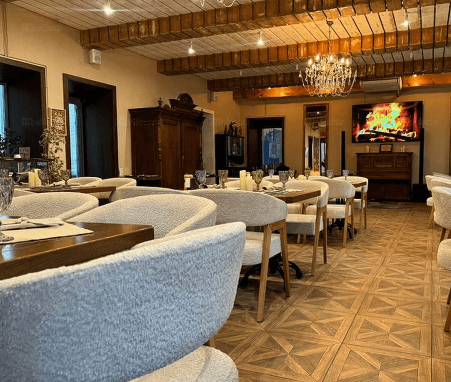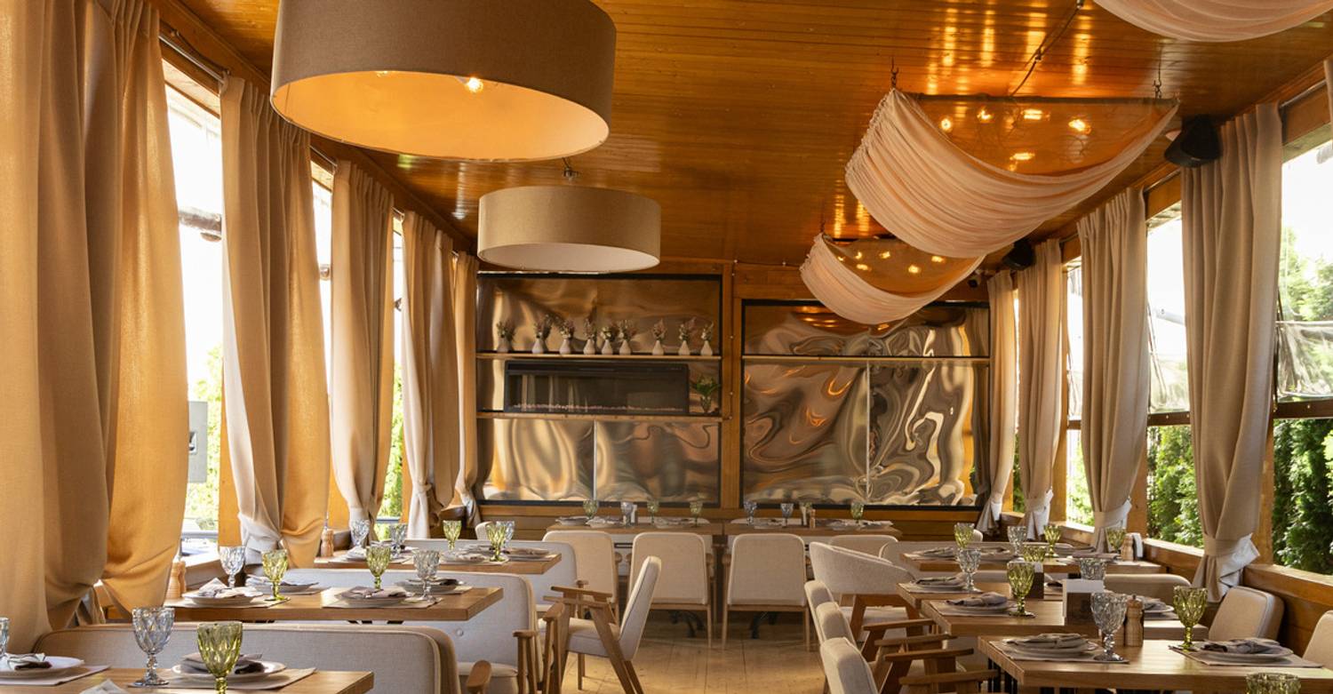 Атмосфера. Пространство оформлено в спокойной цветовой гамме: здесь современный интерьер в бежево-серых тонах, мягкие диваны, расписные ковры на полу и открытая кухня. Планировка заведения позволяет наблюдать за работой поваров, что добавляет атмосфере в заведении дополнительной динамики.