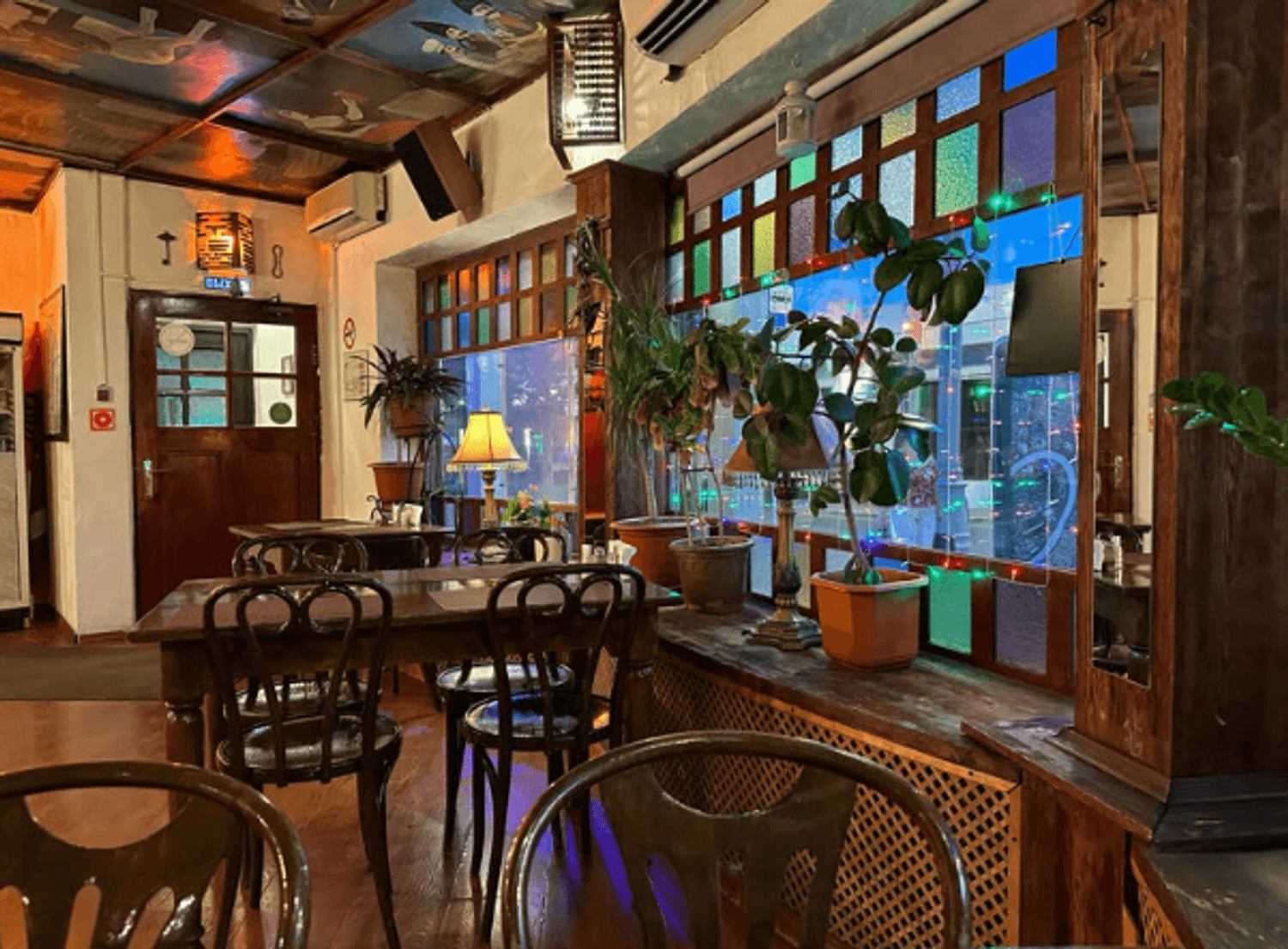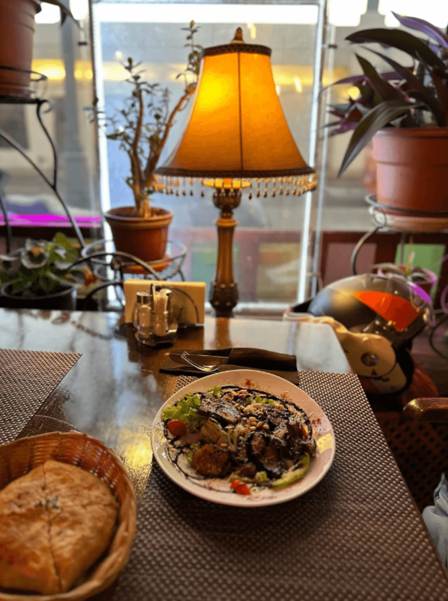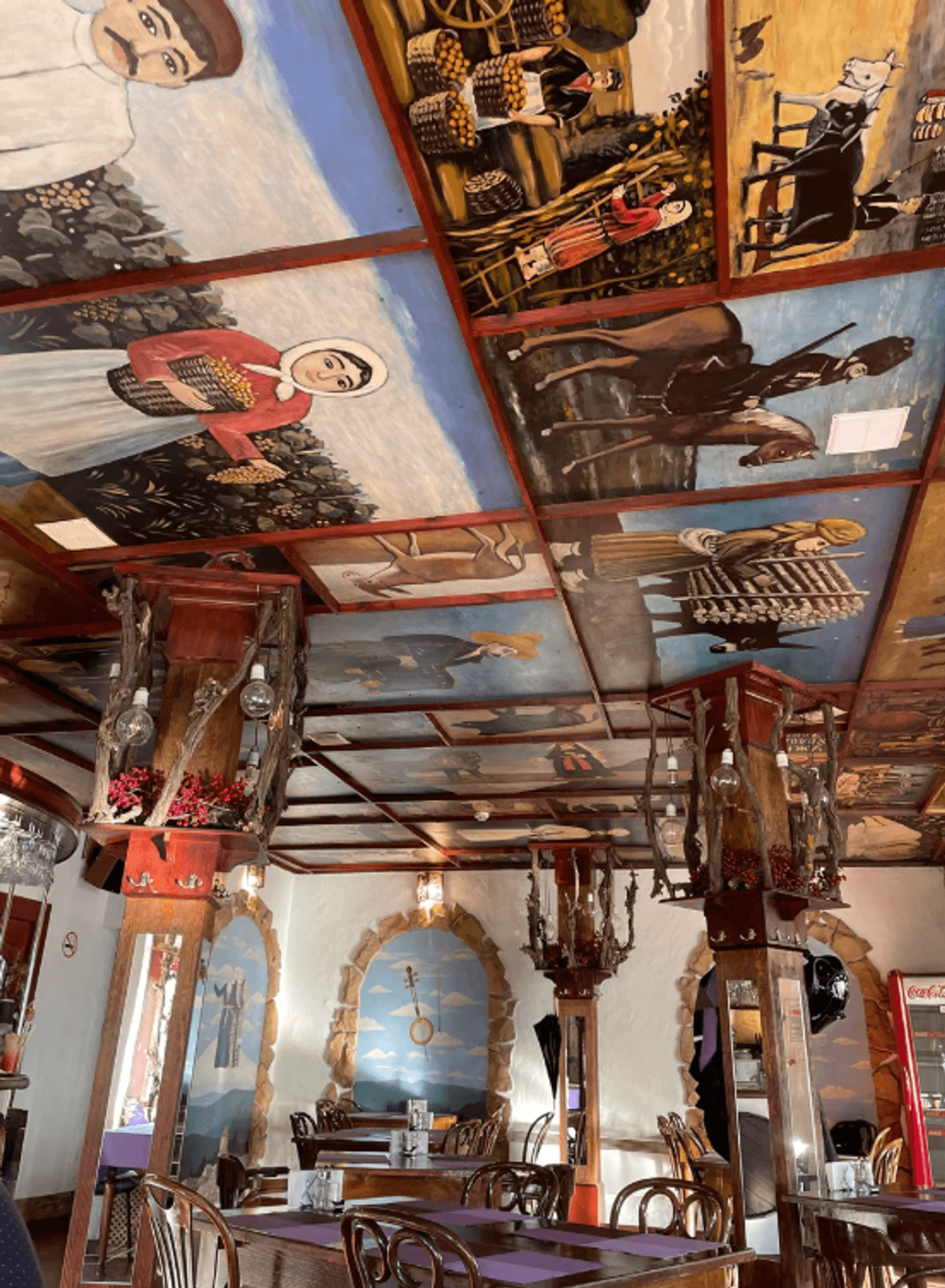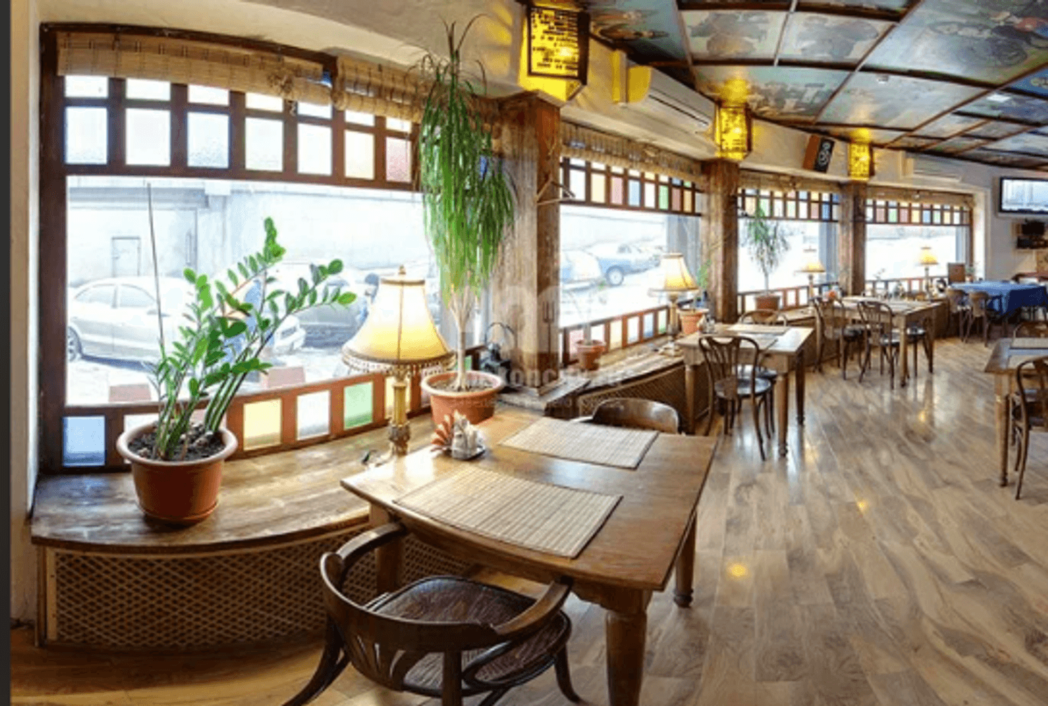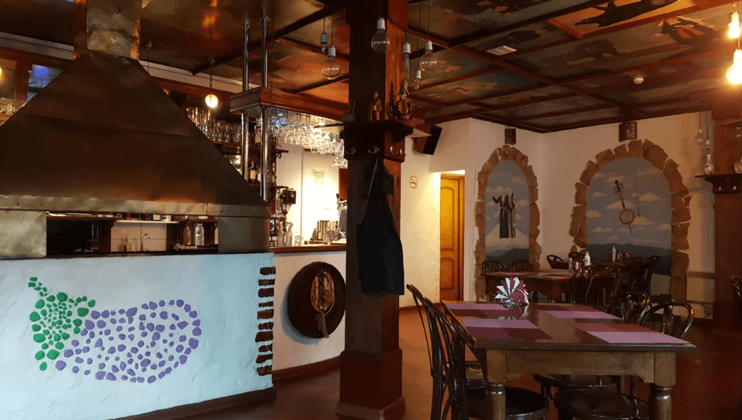 Атмосфера. Интерьер выполнен в стиле, который сочетает традиционные кавказские мотивы с современным минимализмом: стены из камня, деревянные элементы и грубая штукатурка, сводчатый потолок с росписями в национальных мотивах. Вдоль стен расставлены удобные стулья и диваны, а витражные окна наполняют пространство светом.