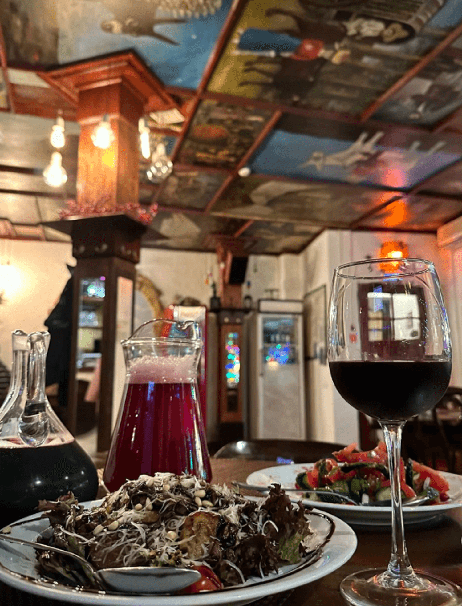 Еда и напитки. В меню — классическая кавказская кухня: шашлыки, хачапури, суп харчо, баранина с пророщенным горохом и другие традиционные блюда, приготовленные по авторским рецептам. В винной карте ресторана — широкий выбор грузинских вин, которые идеально дополнят блюда.