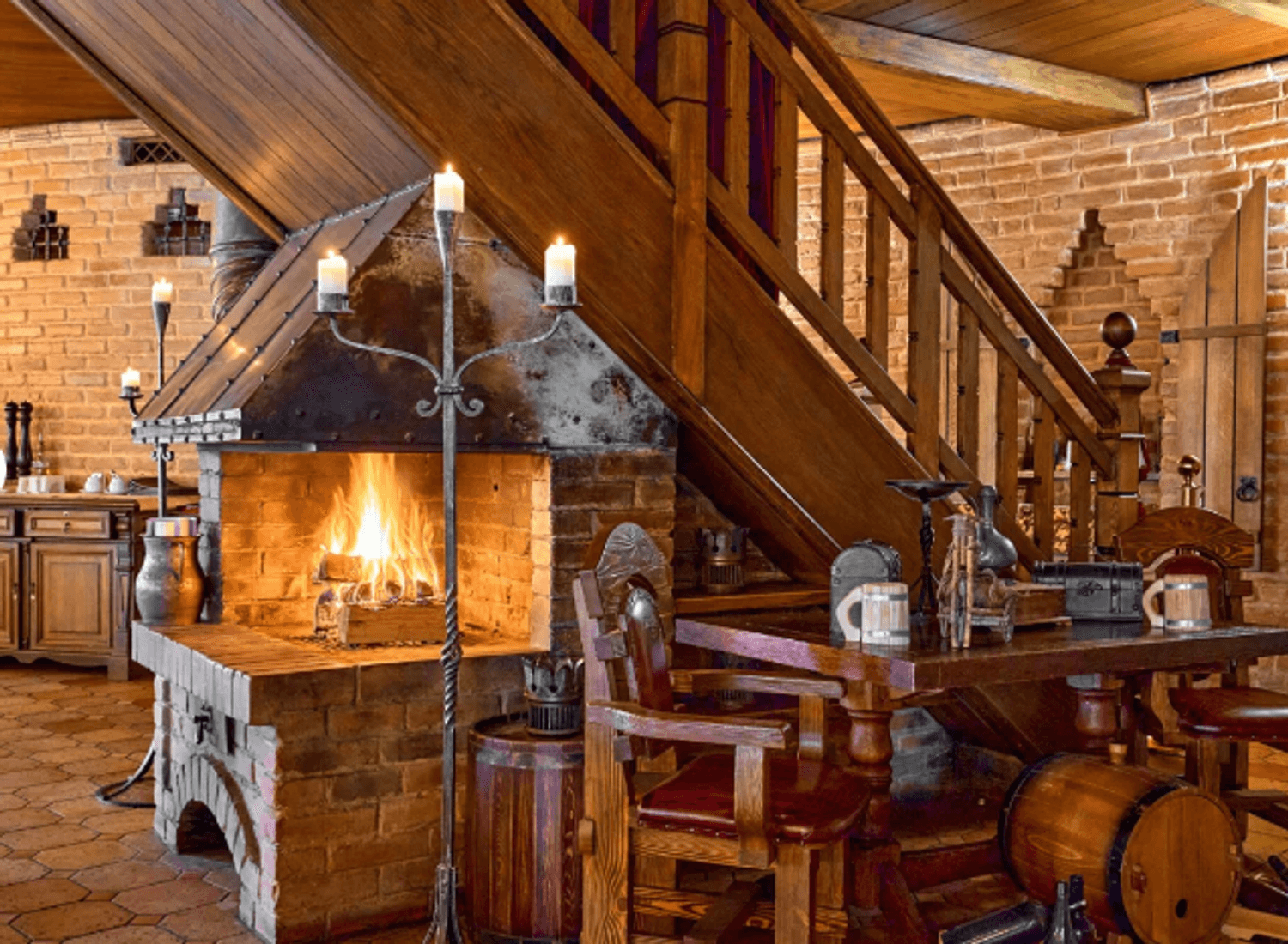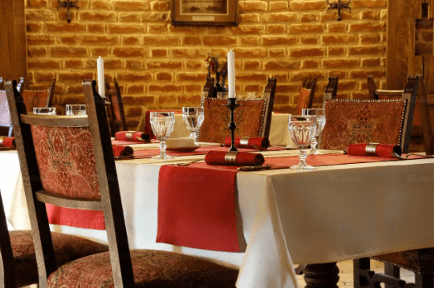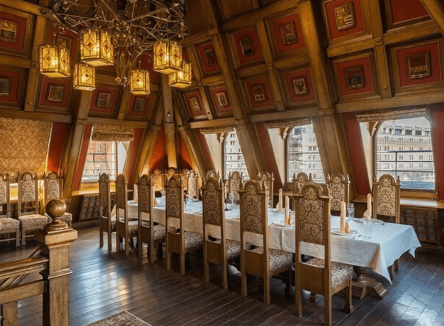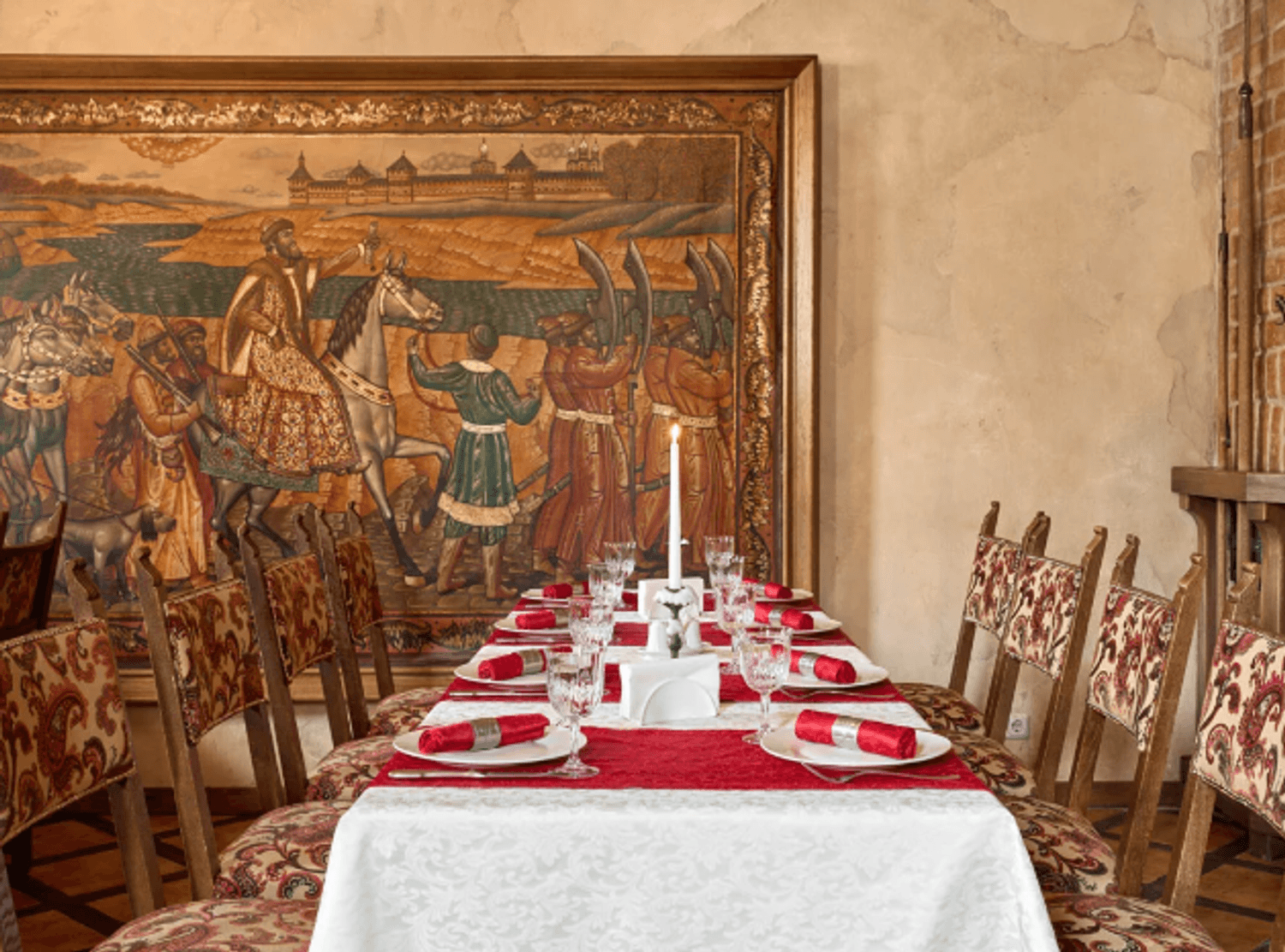 Атмосфера. Четыре уровня ресторана в стиле княжеских палат: сводчатые потолки из натурального камня, дубовые ставни на окнах, кованые люстры и тяжелая мебель из дерева. На верхнем этаже расположен шатер с панорамной верандой, откуда открывается вид на исторический центр города.