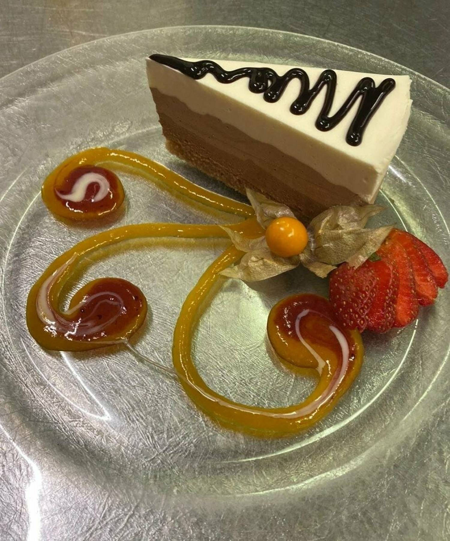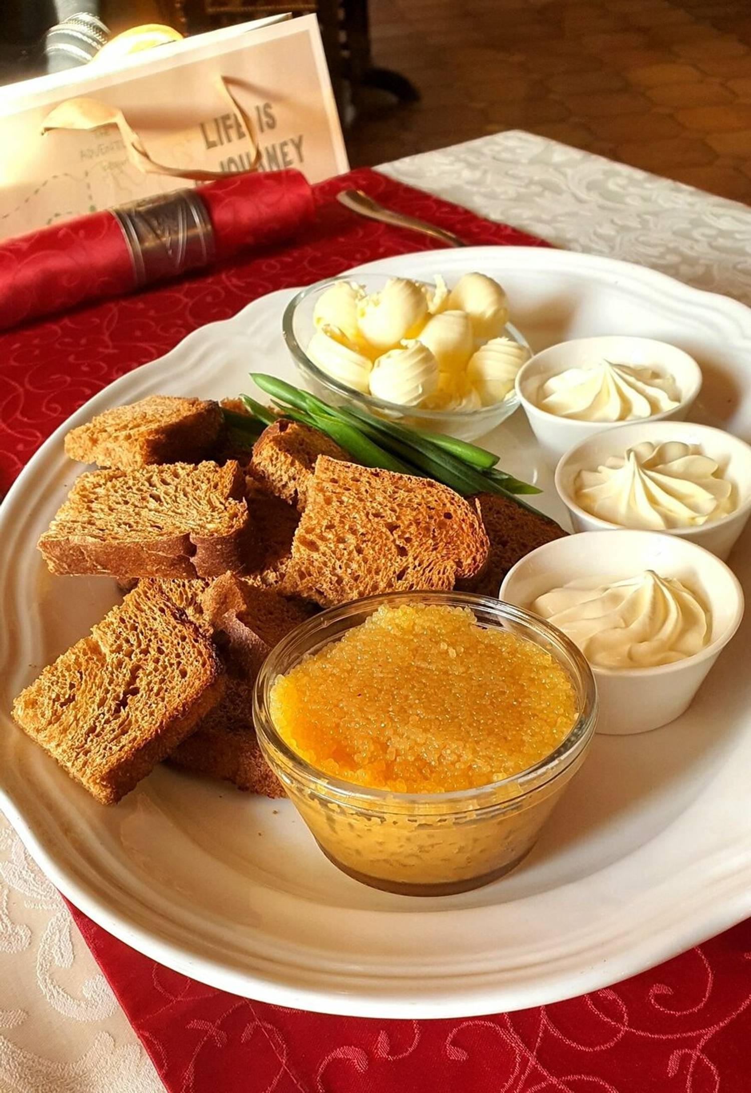 Еда и напитки. В меню — блюда русской кухни: жареная оленина с грушей, суточные щи, сельдь с картофелем и салат с копченой утиной грудкой. На десерт подают блинные мешочки с лесными ягодами и штрудель грушевый с медовым пряником.