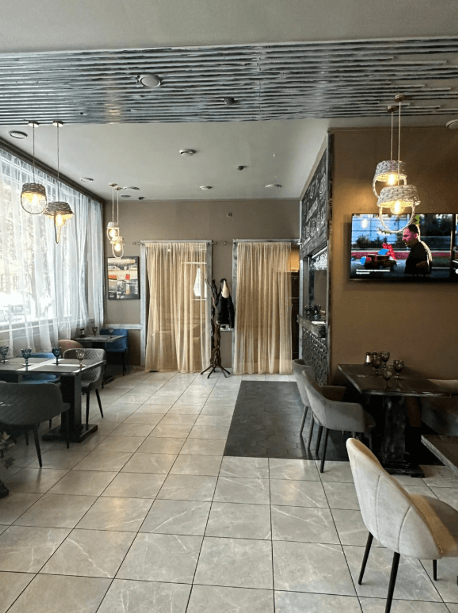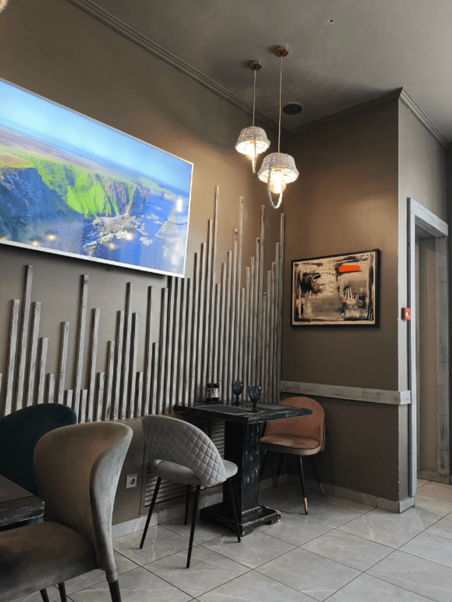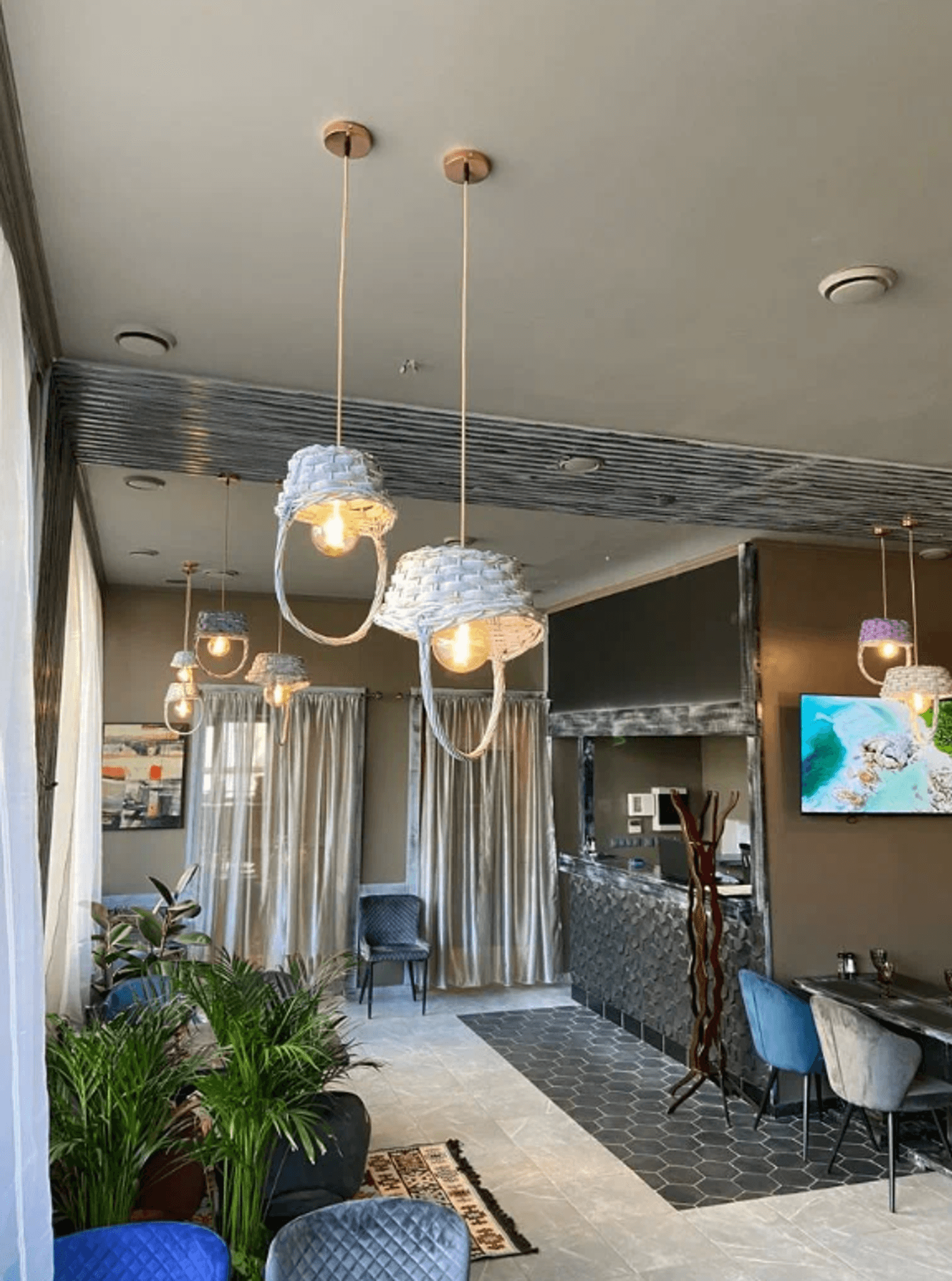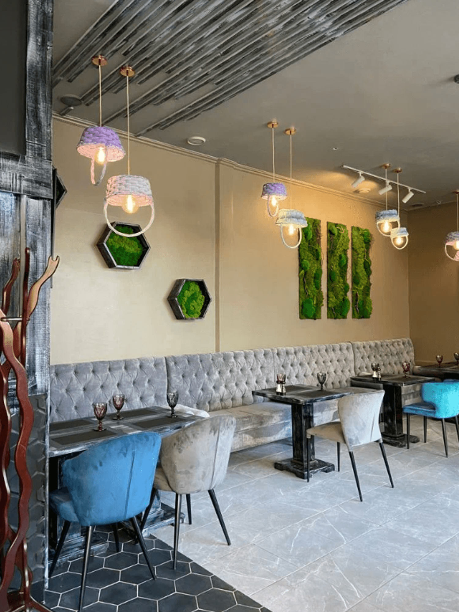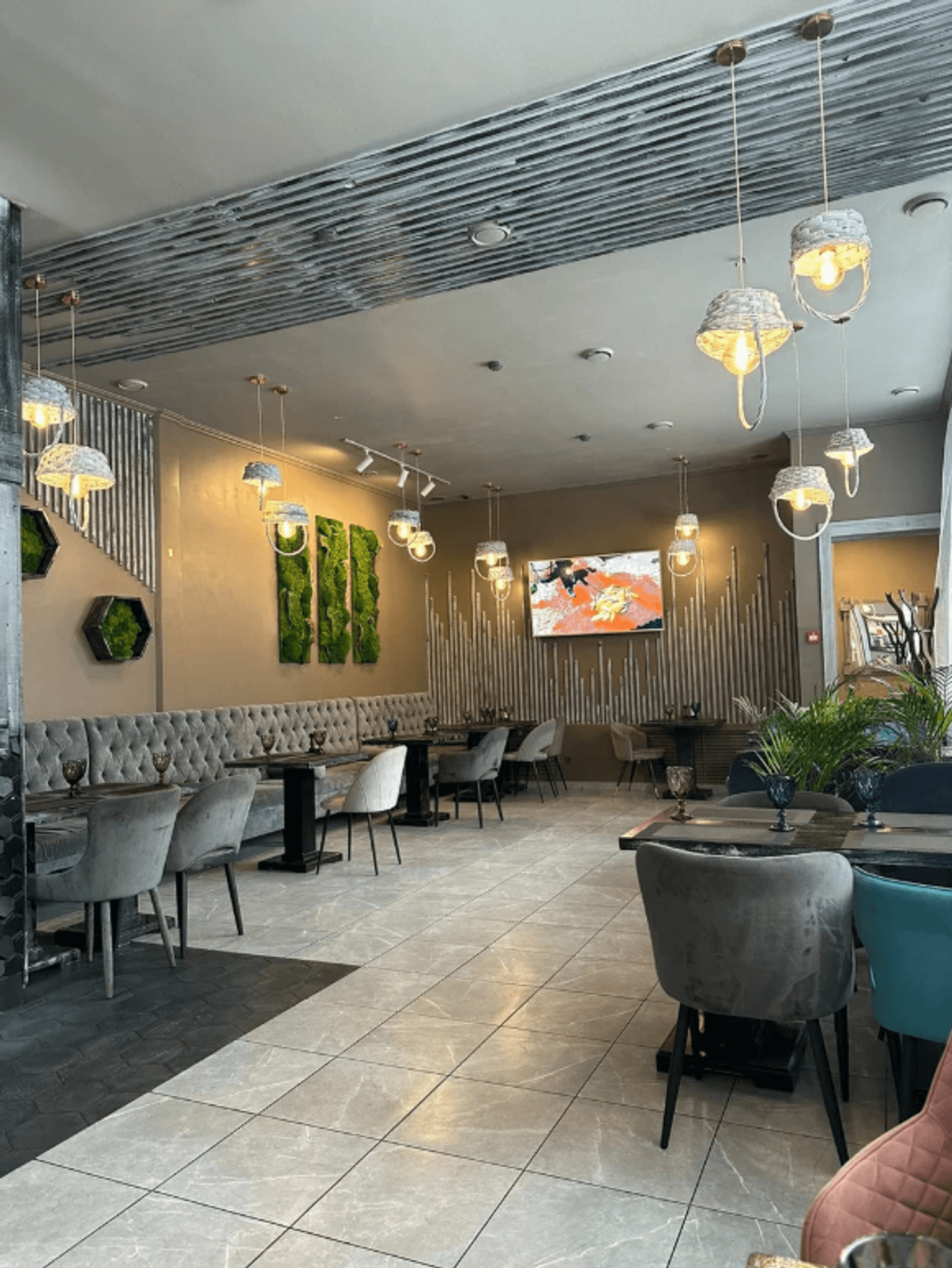 Атмосфера. Дизайн с современным декором: панно из искусственной травы геометрических форм, фактурная барная стойка из серых шестиугольников. Также из необычных элементов люстры-корзины, а из традиционных — ковры с орнаментами под столами.