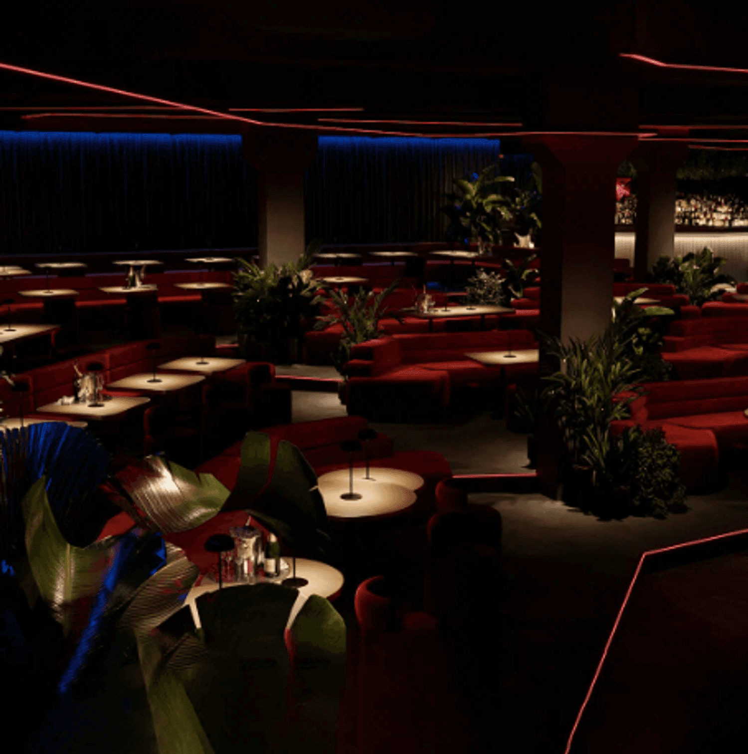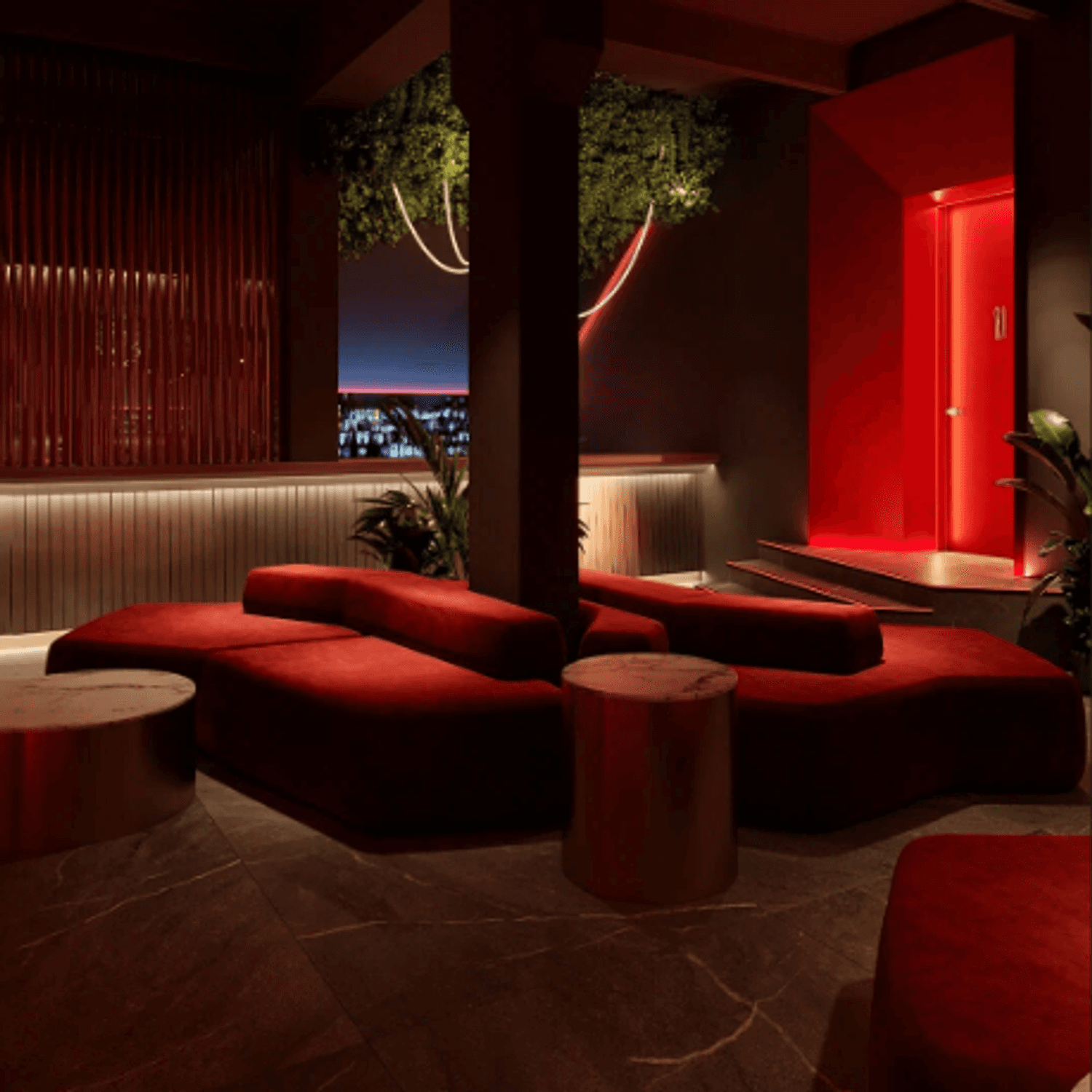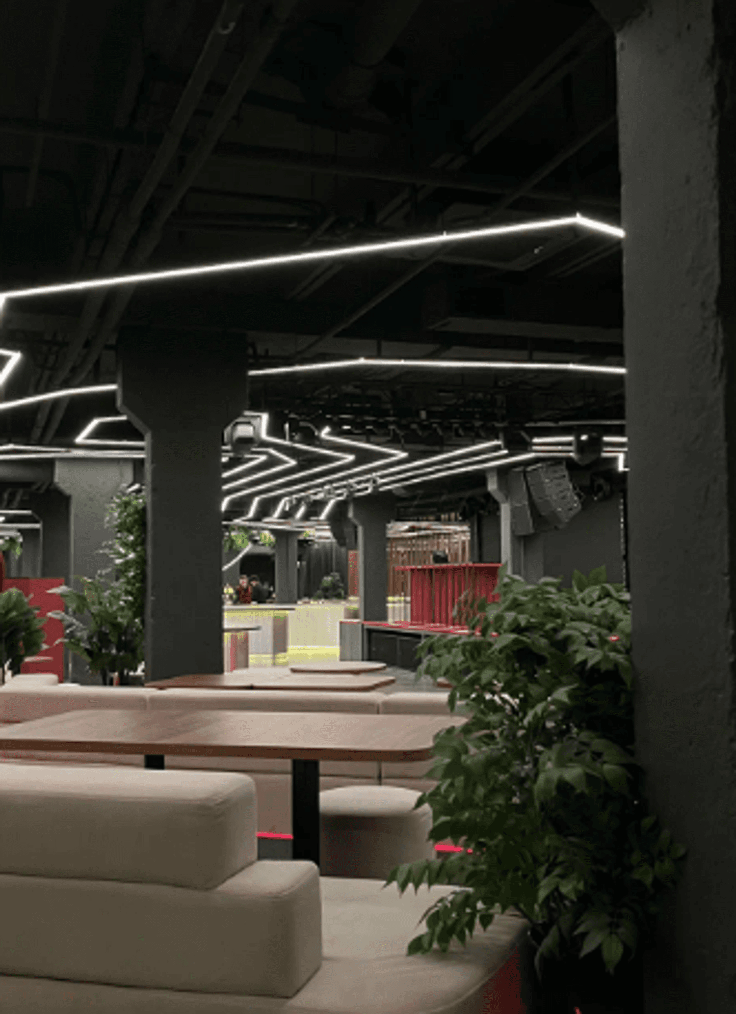 Интерьер оформлен в современном стиле: ярко-красные тона, светодиодные ленты и живая зелень. На площади более 1000 квадратных метров разместились столики с мягкими диванами, овальная барная стойка, просторный танцпол и сцена.