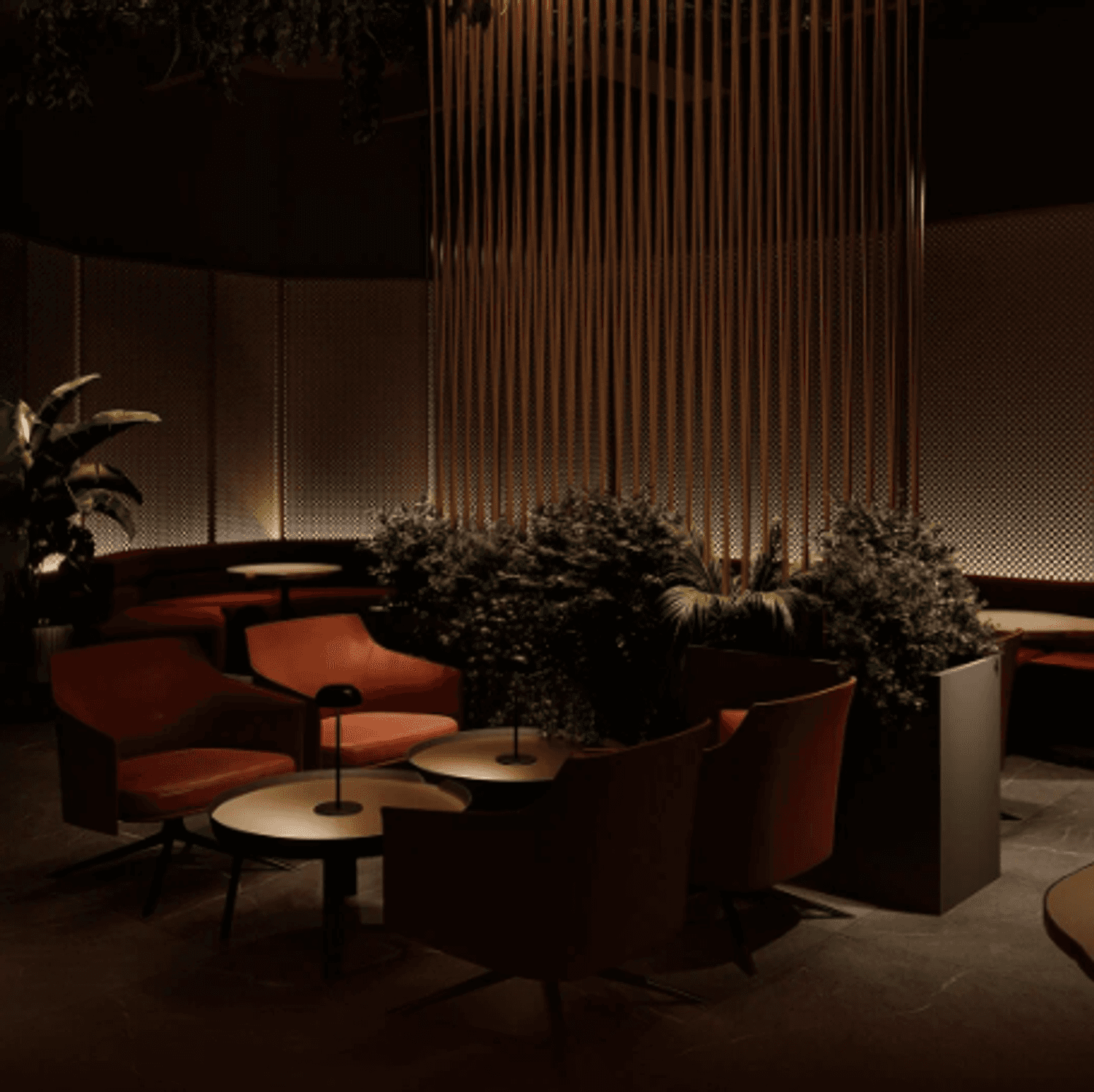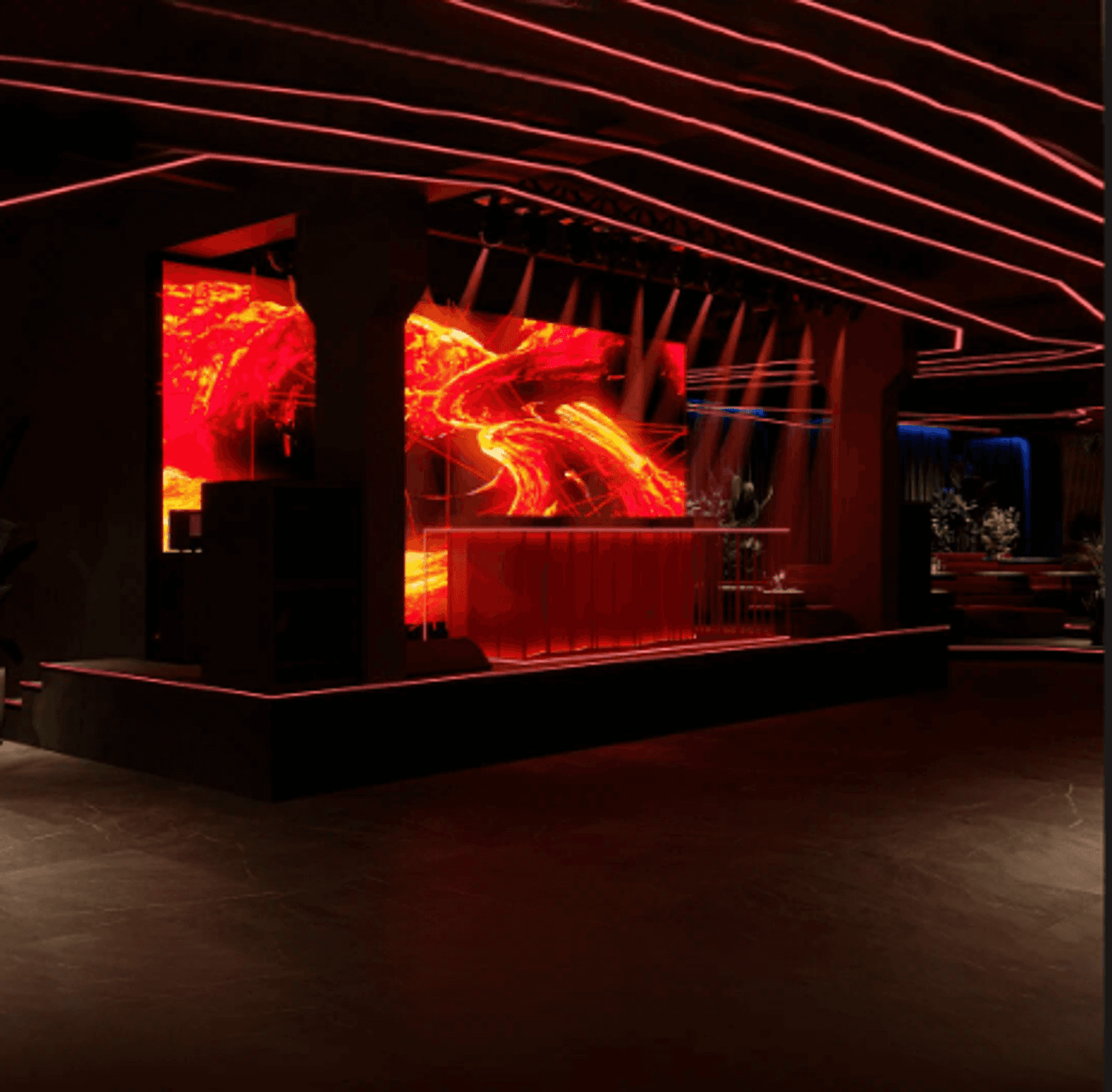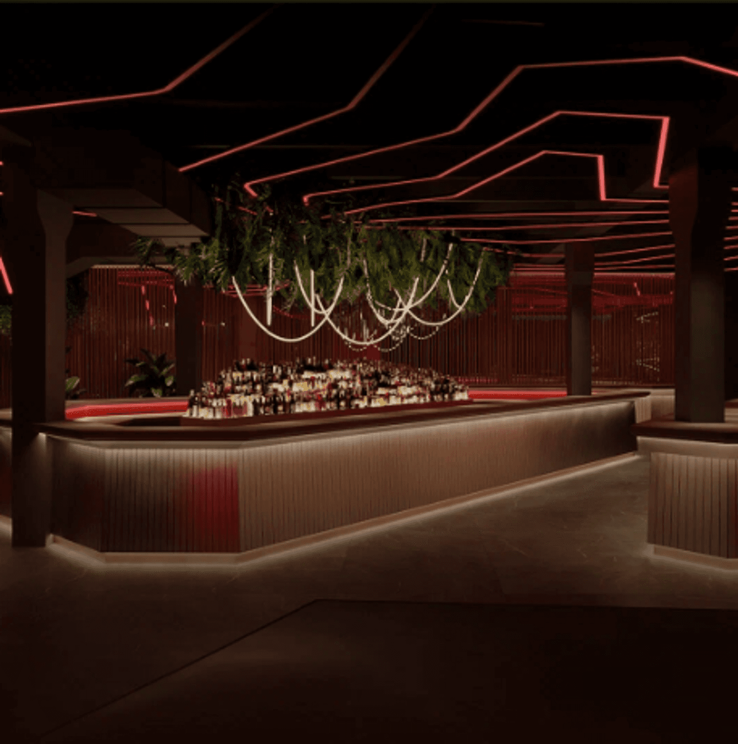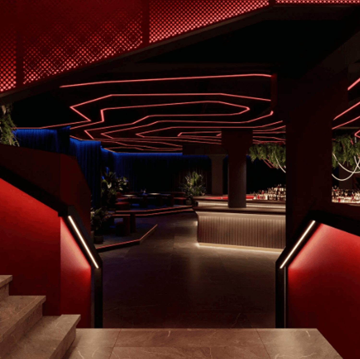 Интерьер оформлен в современном стиле: ярко-красные тона, светодиодные ленты и живая зелень. На площади более 1000 квадратных метров разместились столики с мягкими диванами, овальная барная стойка, просторный танцпол и сцена.