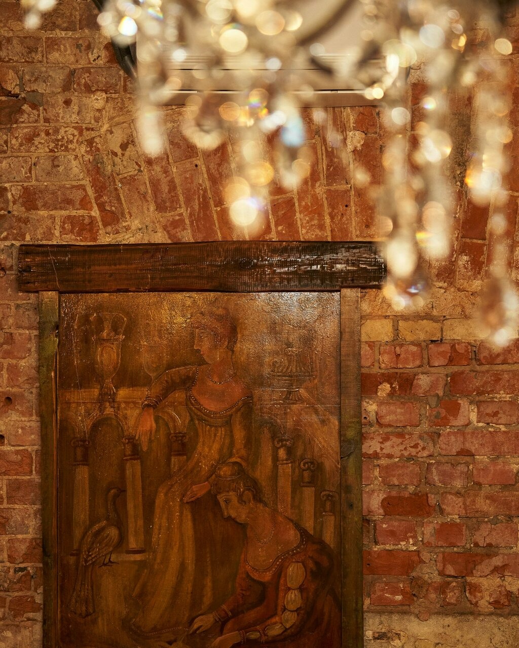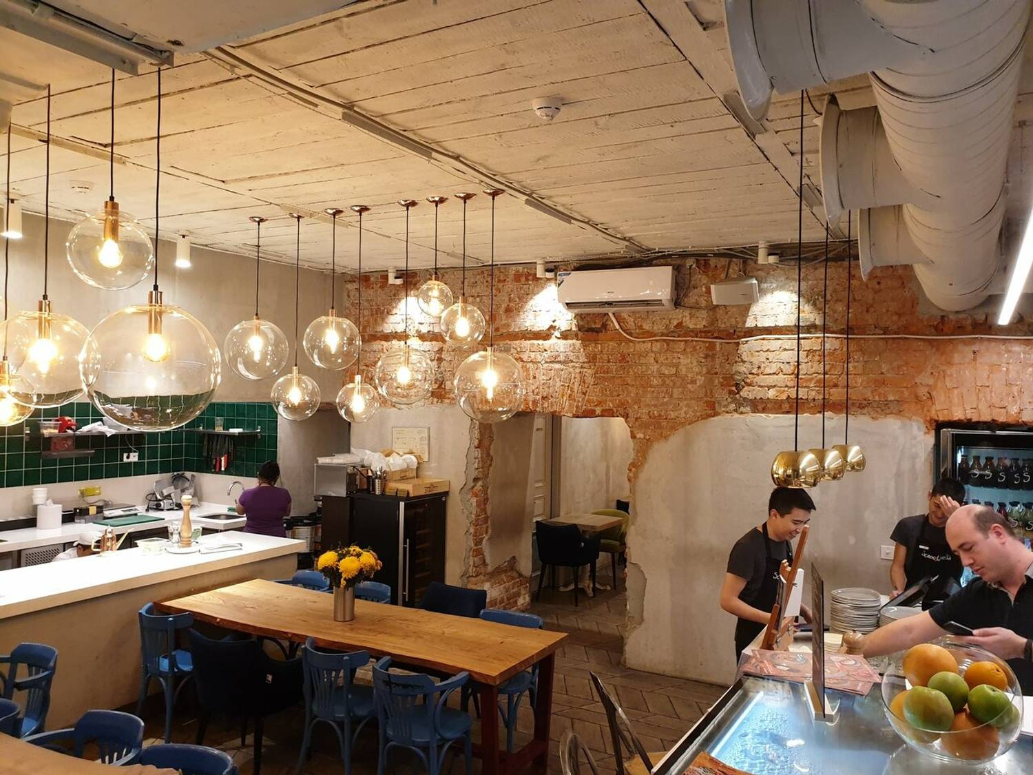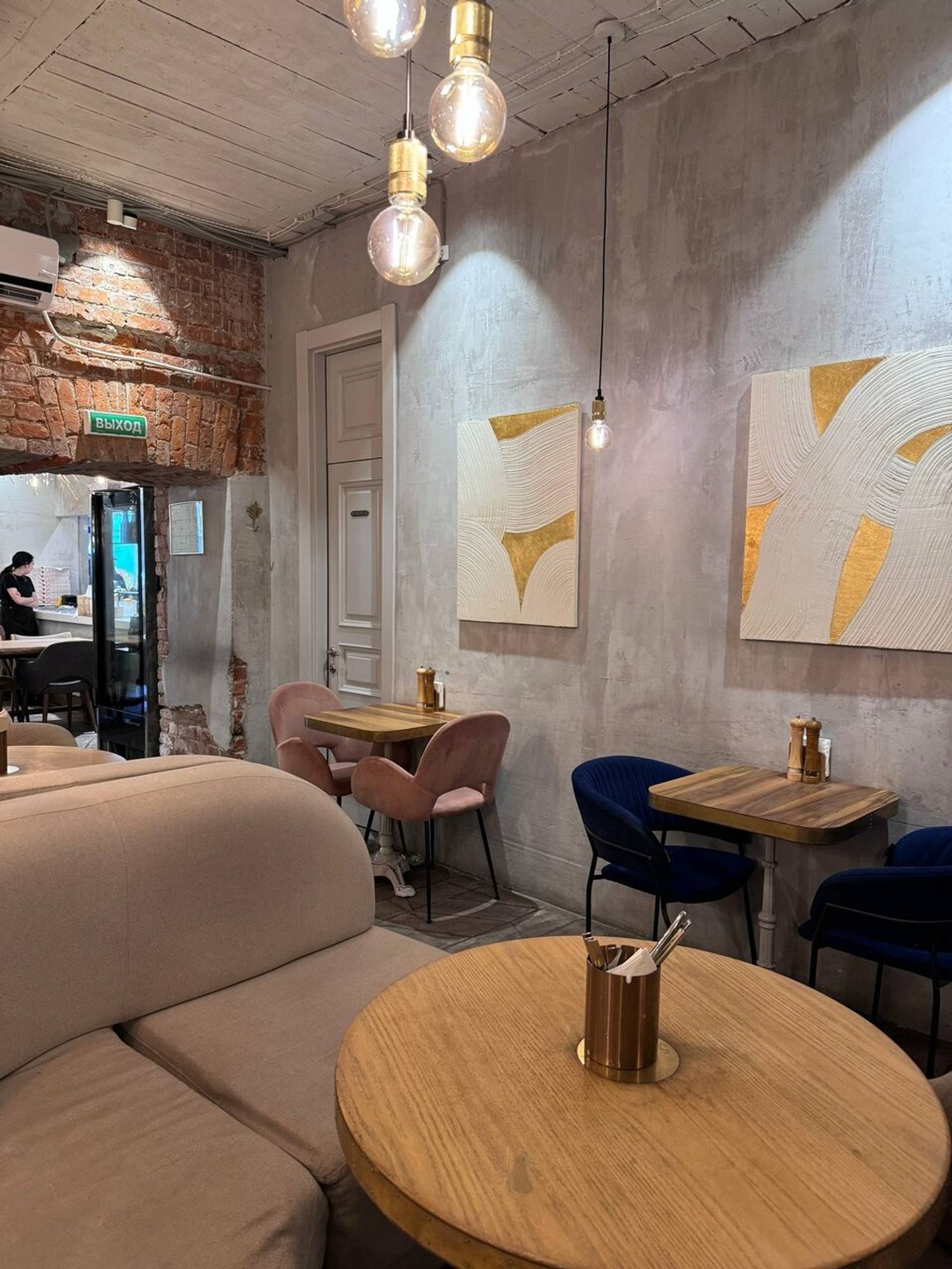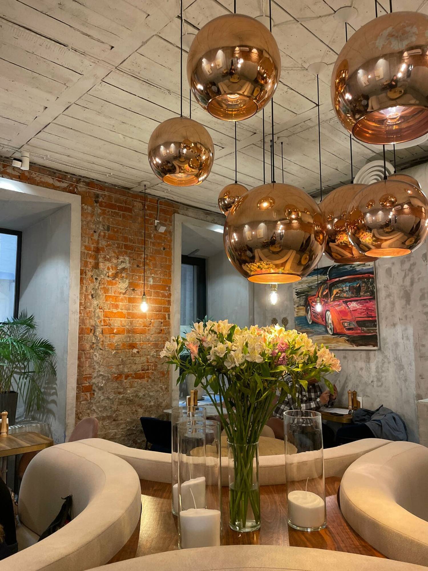 Атмосфера. Здесь дизайн в пастельных тонах с люстрами-шарами с открытыми лампами. Чтобы добавить ярких красок, повесили стильную картину с красной машиной.