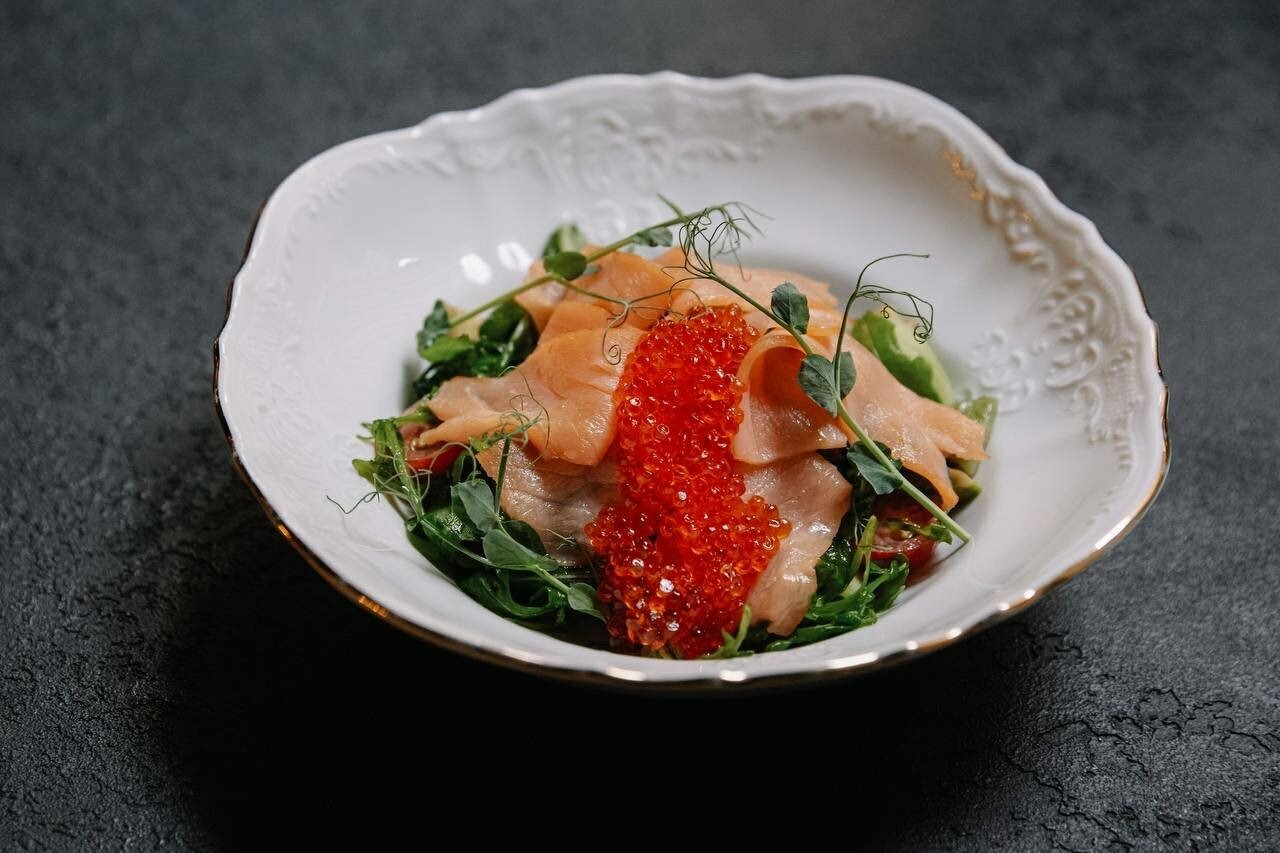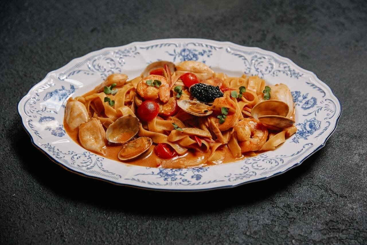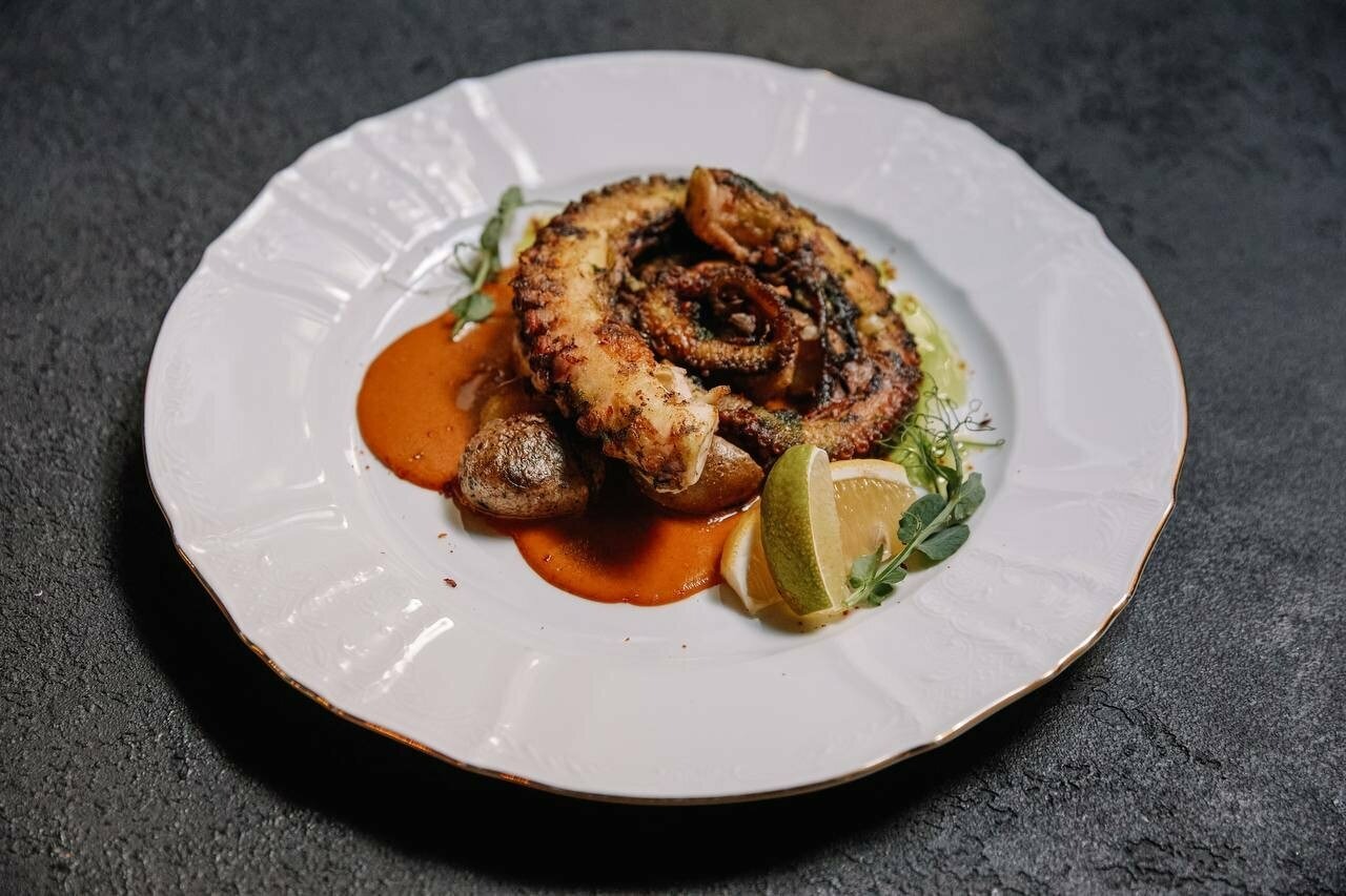 Еда и напитки. В меню — авторская кухня: пицца Маргарита с песто, утиная грудка с соусом из красного вина и инжиром, филе сибаса со спаржей в апельсиновом соусе. На десерт заказывают сирувеллу и фондан black & white.
