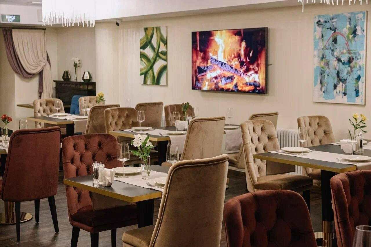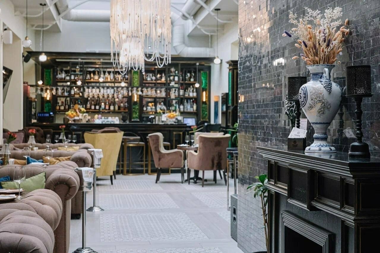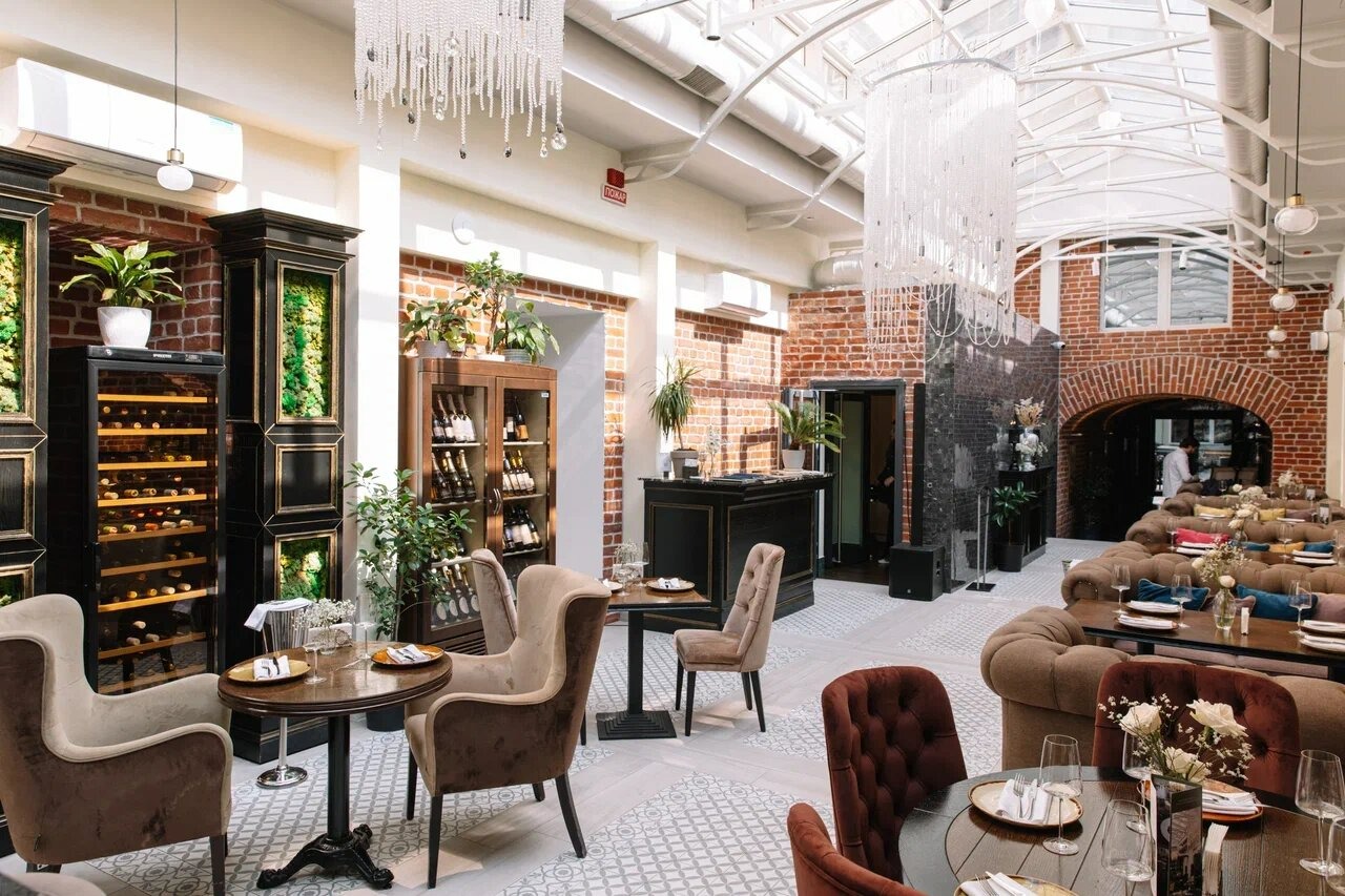 Атмосфера. Здесь несколько залов с разными характерами. «Дворик» под стеклянной крышей с кирпичными стенами, деревянными шкафами для вина и жемчужными люстрами, в зале «Бордо» гостей ждут караоке и живая музыка, а в «Шампань» — мебель в стиле ампир. Также есть отдельный камерный кабинет для небольших компаний.
