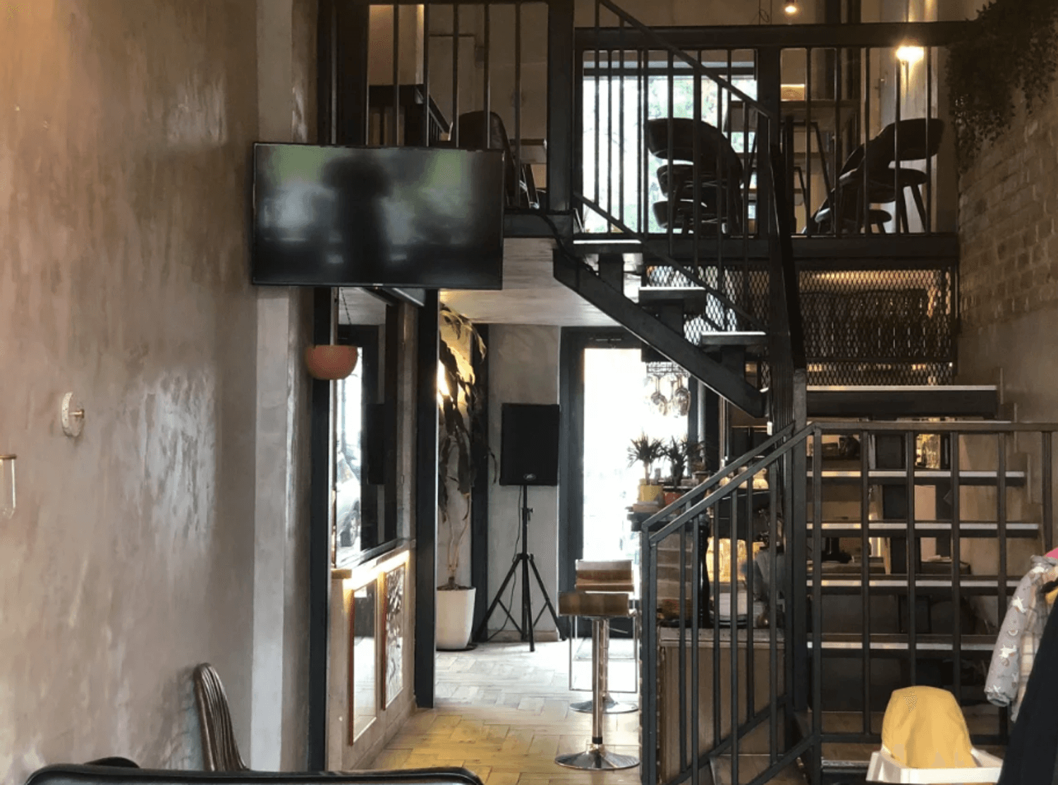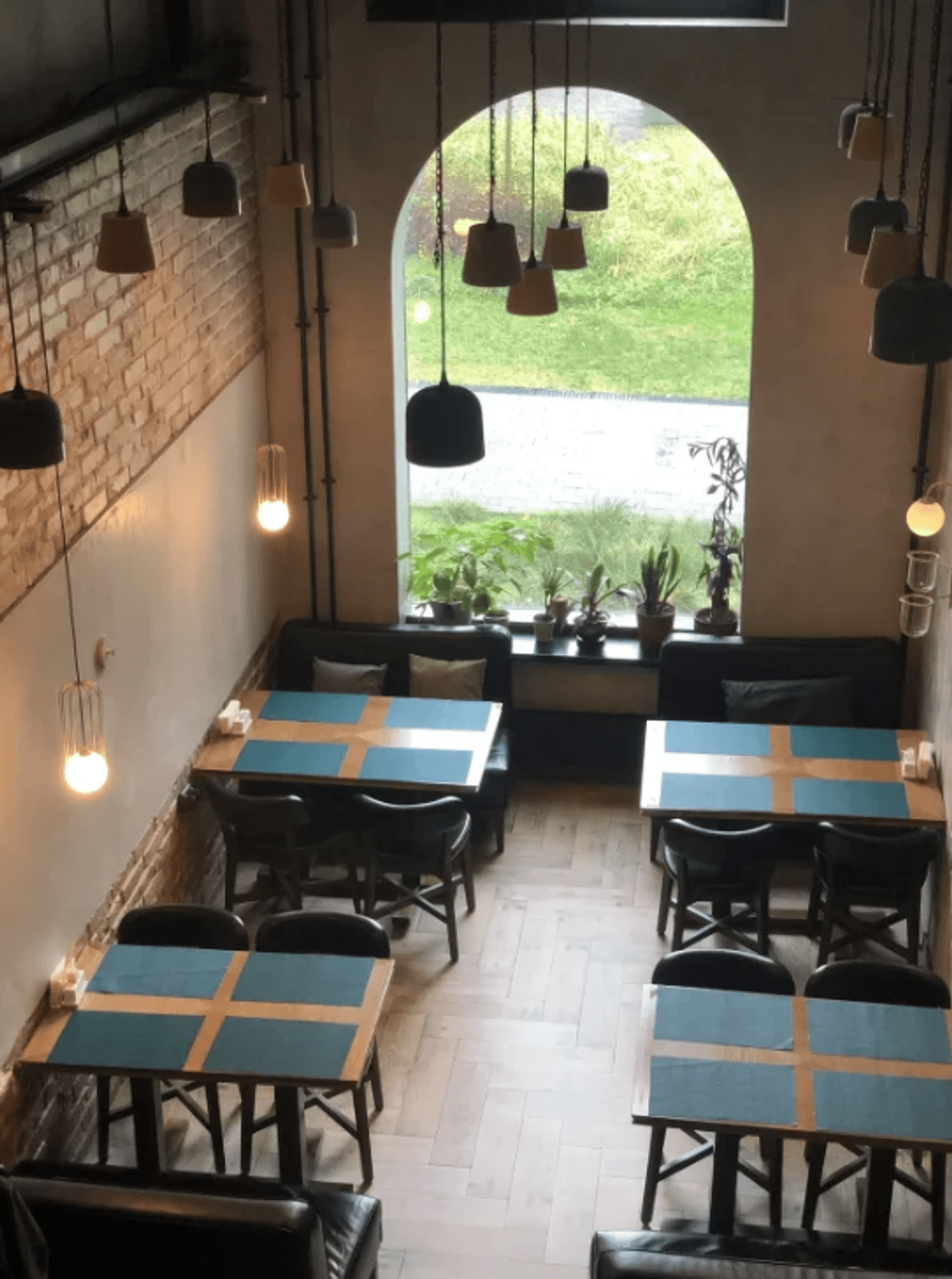 Атмосфера. Пространство оформлено в индустриальной эстетике: кирпичные стены, фактурная штукатурка, кожаные кресла и сдержанная цветовая гамма. Но в то же время здесь нашлось место милым вещицам, отсылающим к Грузии: небольшим картинам с надпиясями на грузинскои или старым игрушкам. Мягкое освещение создает камерную обстановку, а два этажа позволяют зонировать пространство для разных мероприятий. По вечерам здесь играют музыканты или диджеи.