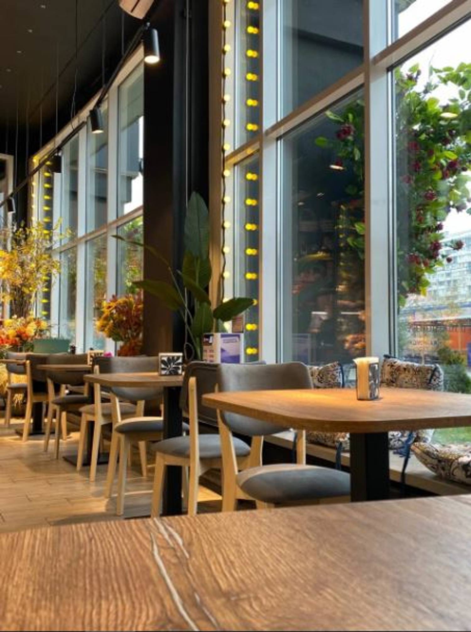 Интерьер оформлен в современном стиле: небольшие деревянные столики, мягкие стулья, панорамные окна.