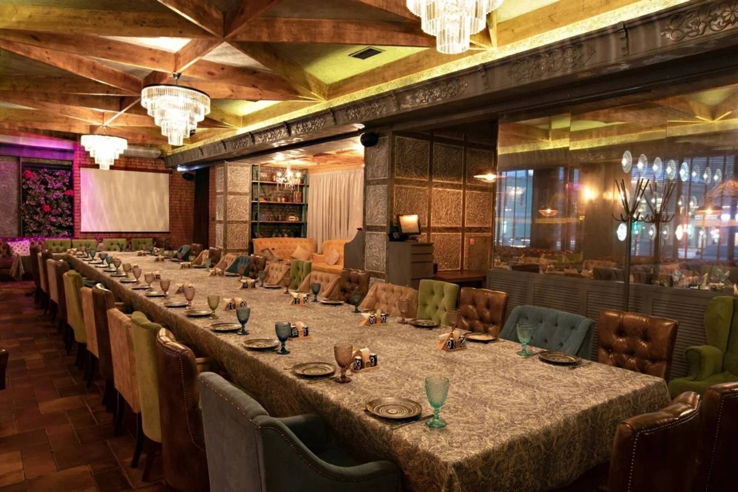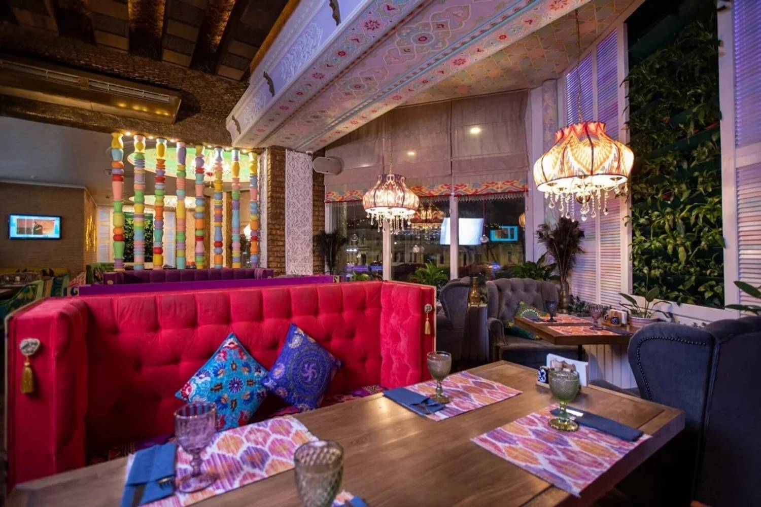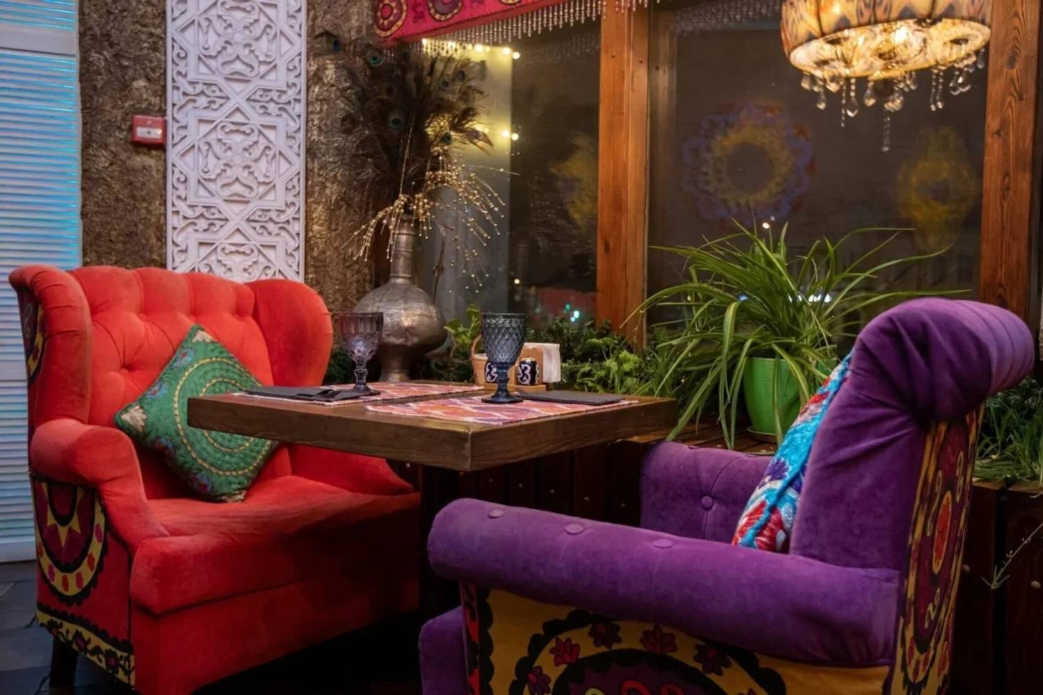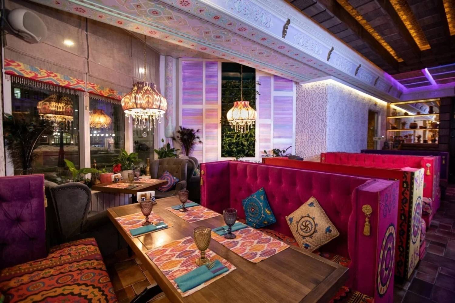 Атмосфера. В заведении три уникальных зала, каждый из которых запланирован под разные сценарии отдыха: есть светлый банкетный зал с панорамными окнами, камерный зал с камином и главный зал со сценой и профессиональным оборудованием. Здесь изящная мебель ярких цветов, восточные акценты в декоре и яркие люстры: все это создает праздничную и уютную обстановку.