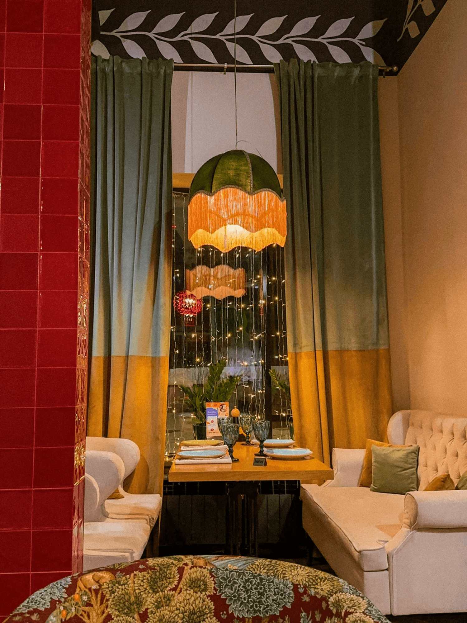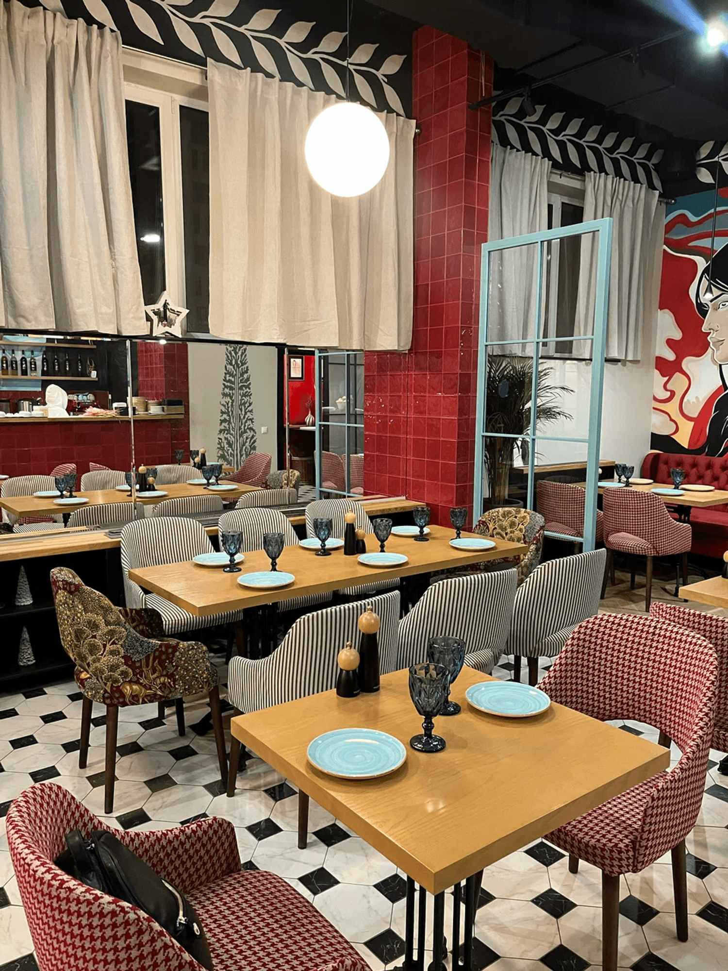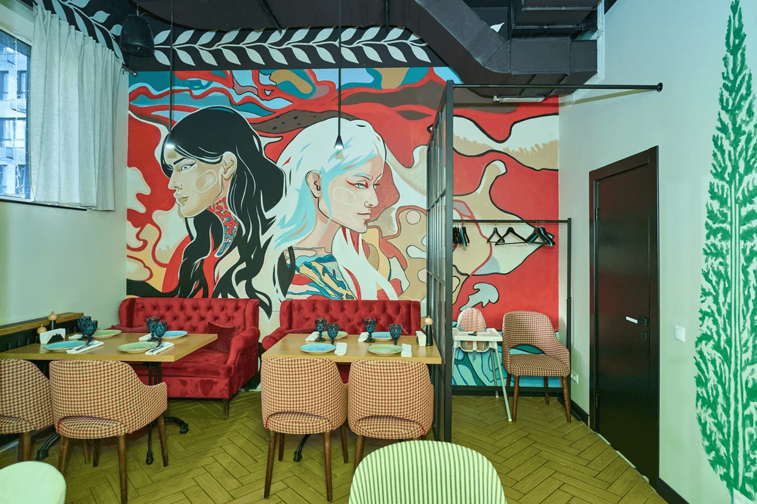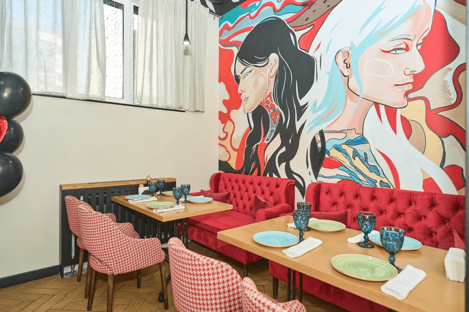 Атмосфера. Пространство с красочной плиткой, авторскими граффити и деревянной мебелью создает жизнерадостную и душевную обстановку. А текстиль с грузинскими орнаментами, мягкие диваны и живые растения добавляют уюта, напоминая о гостеприимстве кавказского дома.