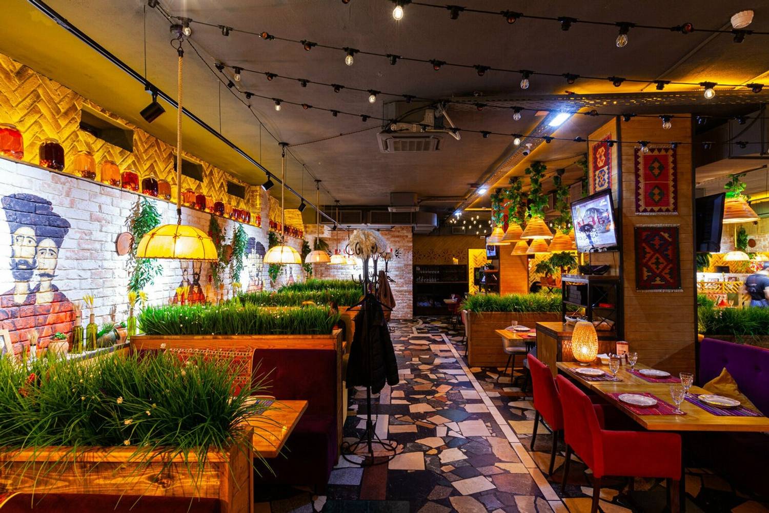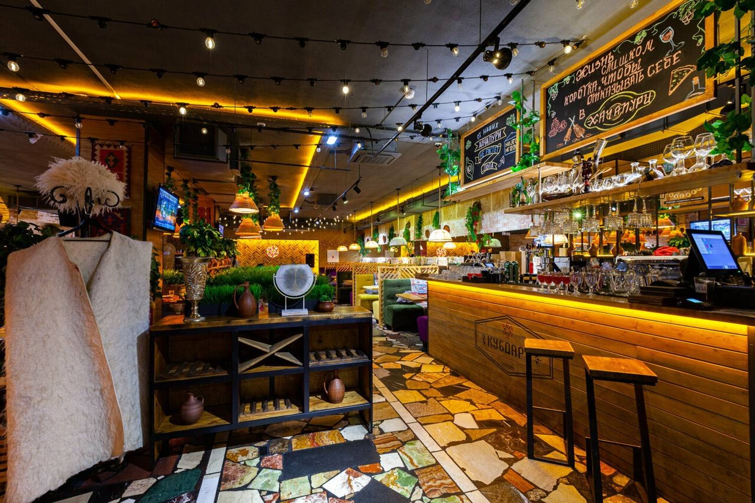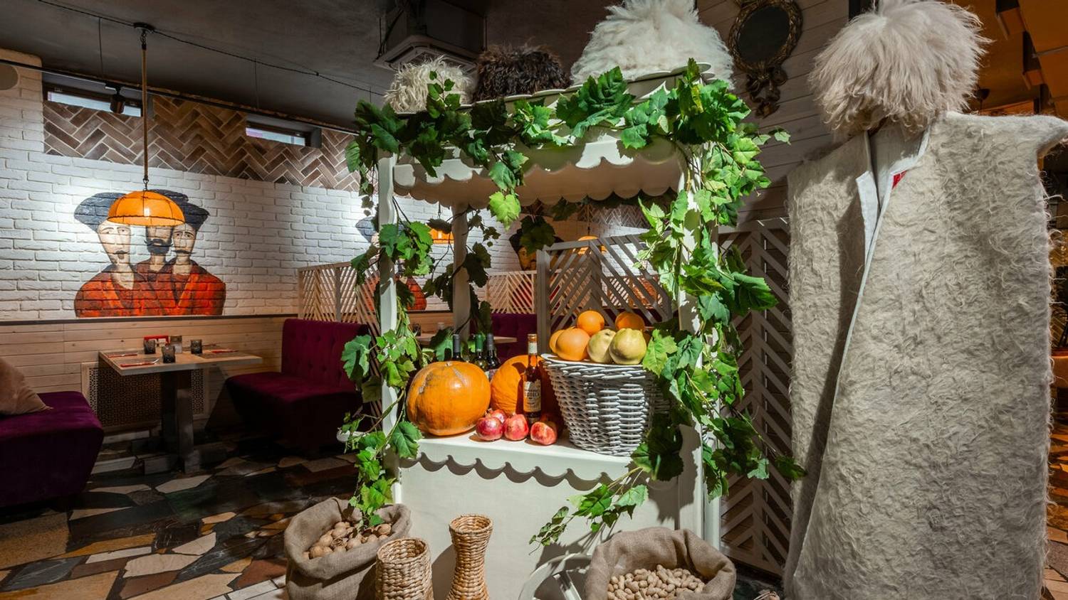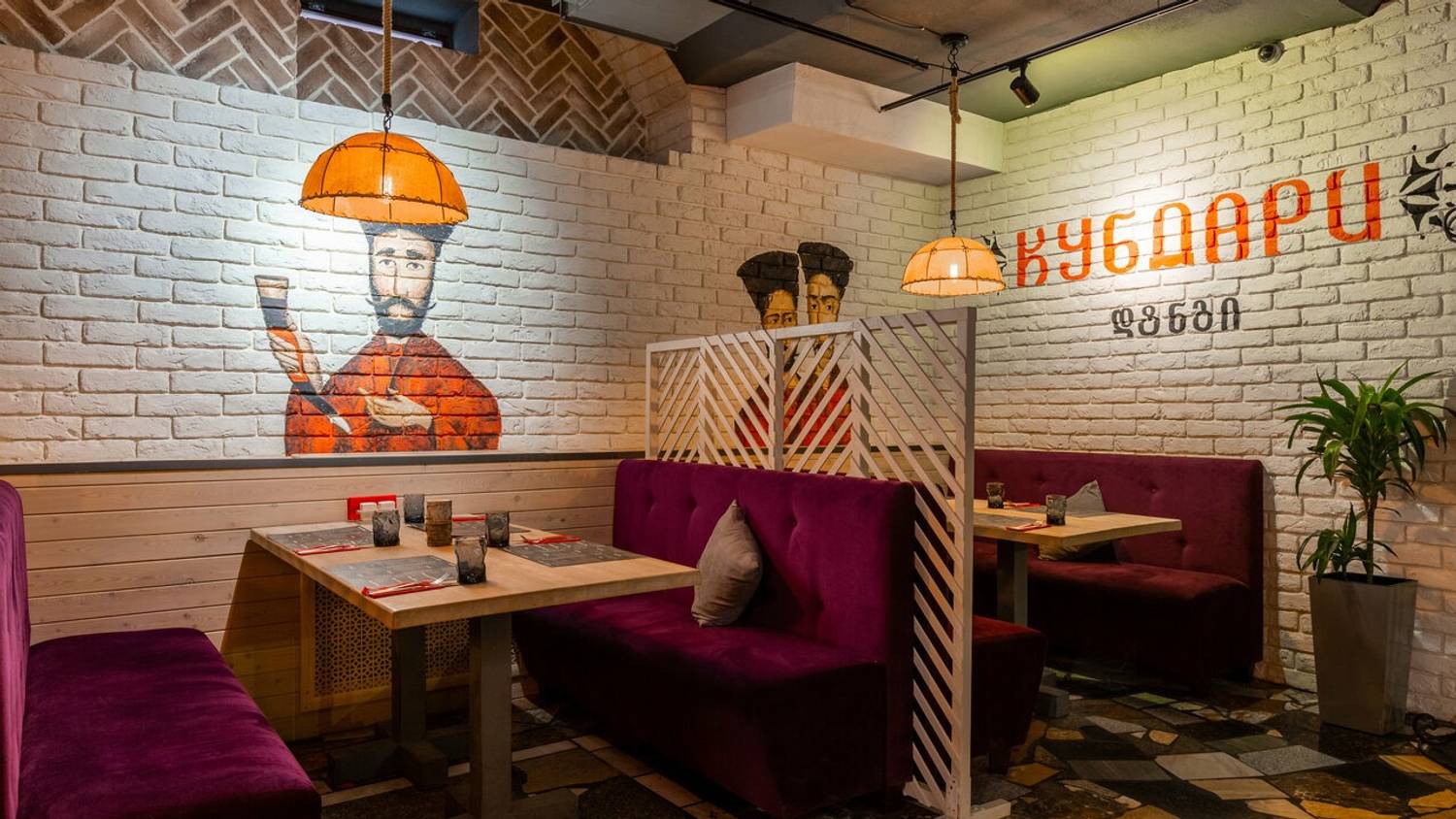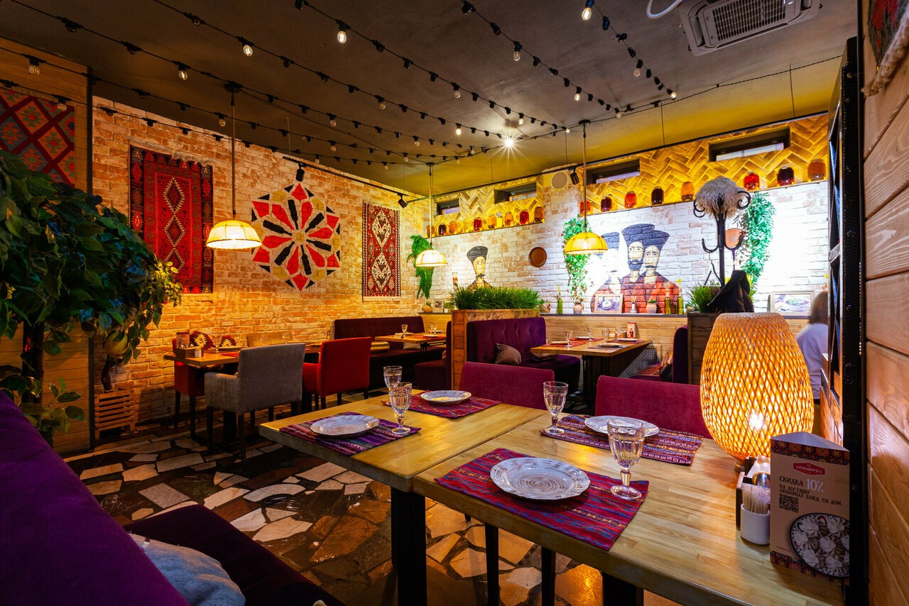 Атмосфера. Здесь словно художественная реконструкция грузинского колорита: расписанные вручную кирпичные стены с граффити по мотивам картины «Поющие грузины», пол из натурального камня и деревянные столы. Детали дополняют образ: традиционные ковры с орнаментами на стенах, грузинские папахи, банки с соленьями на полках.