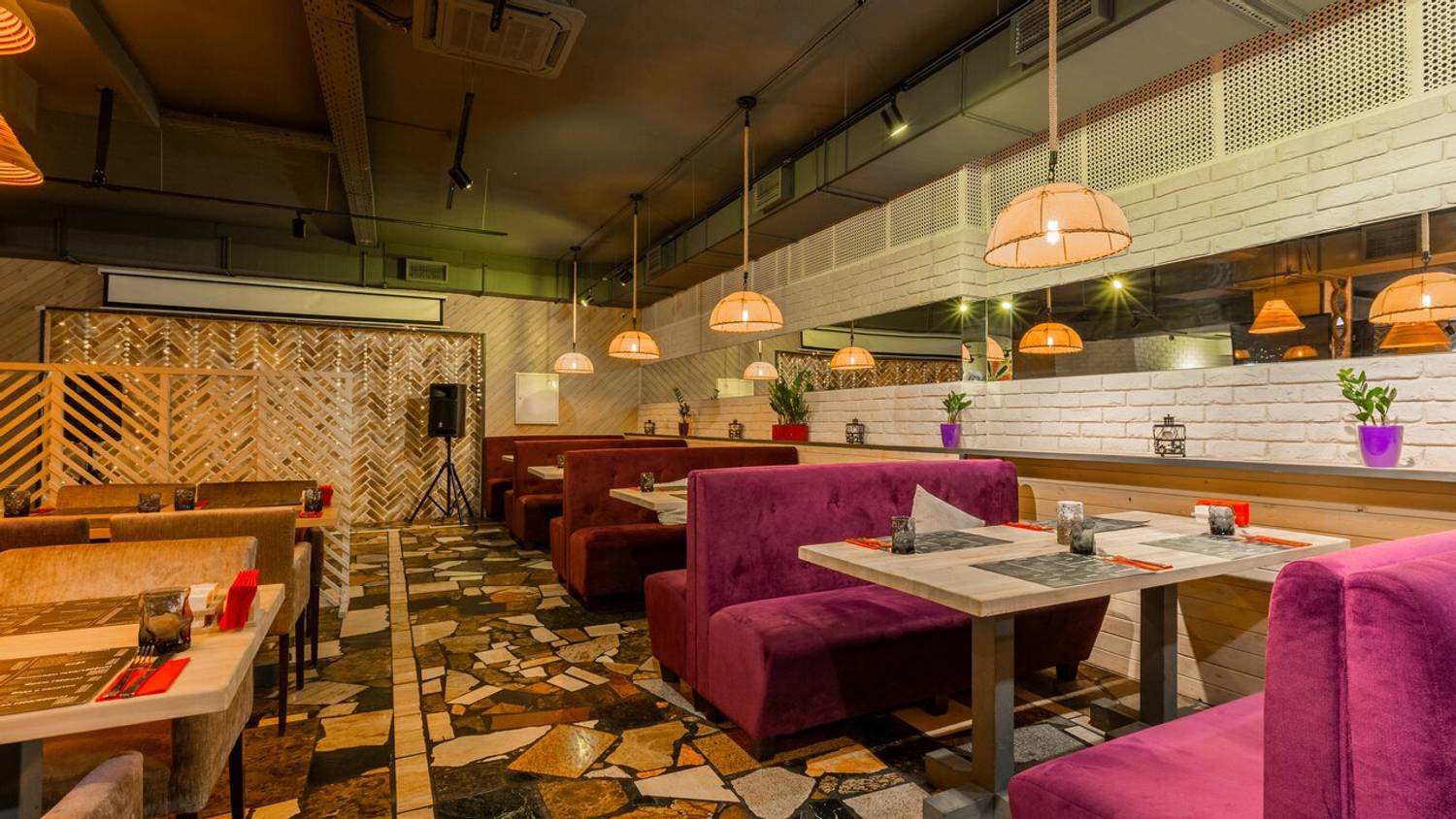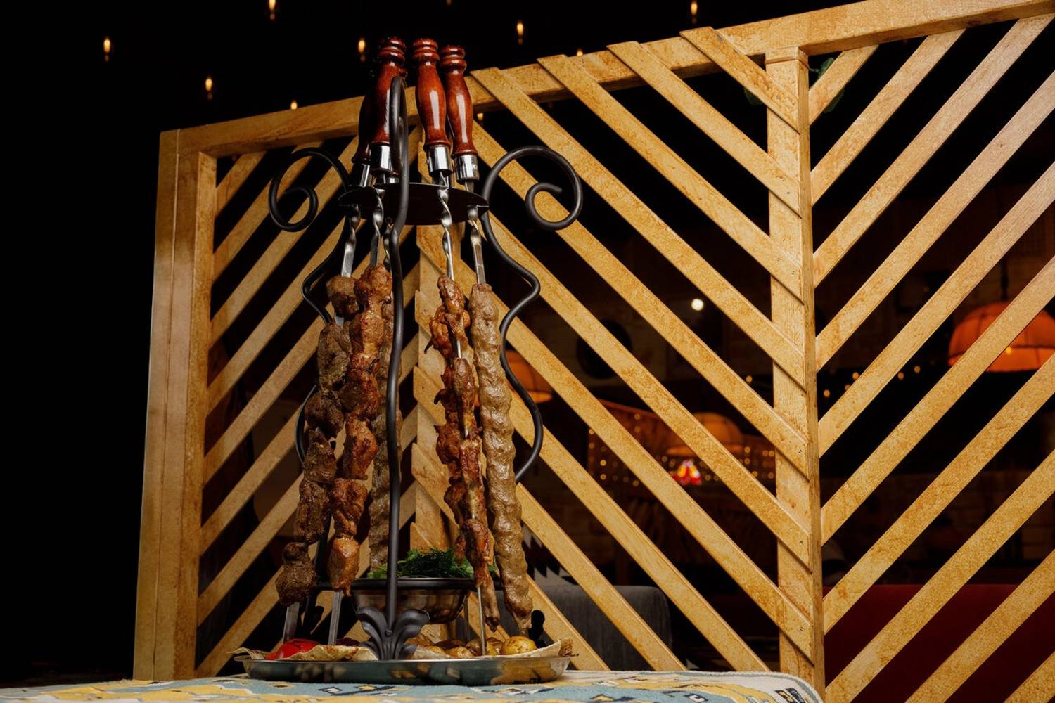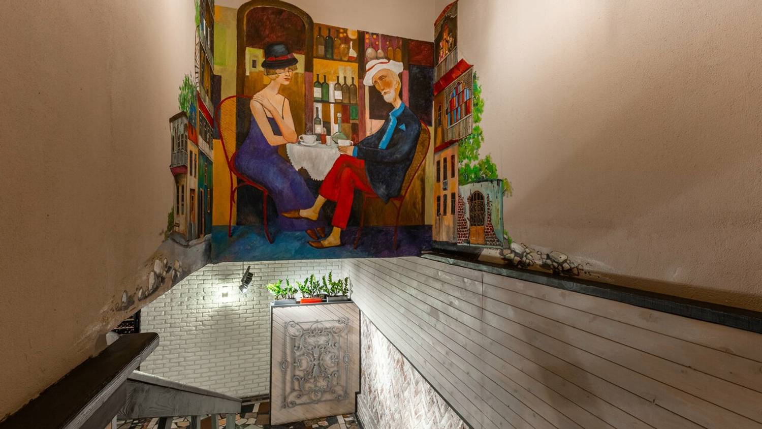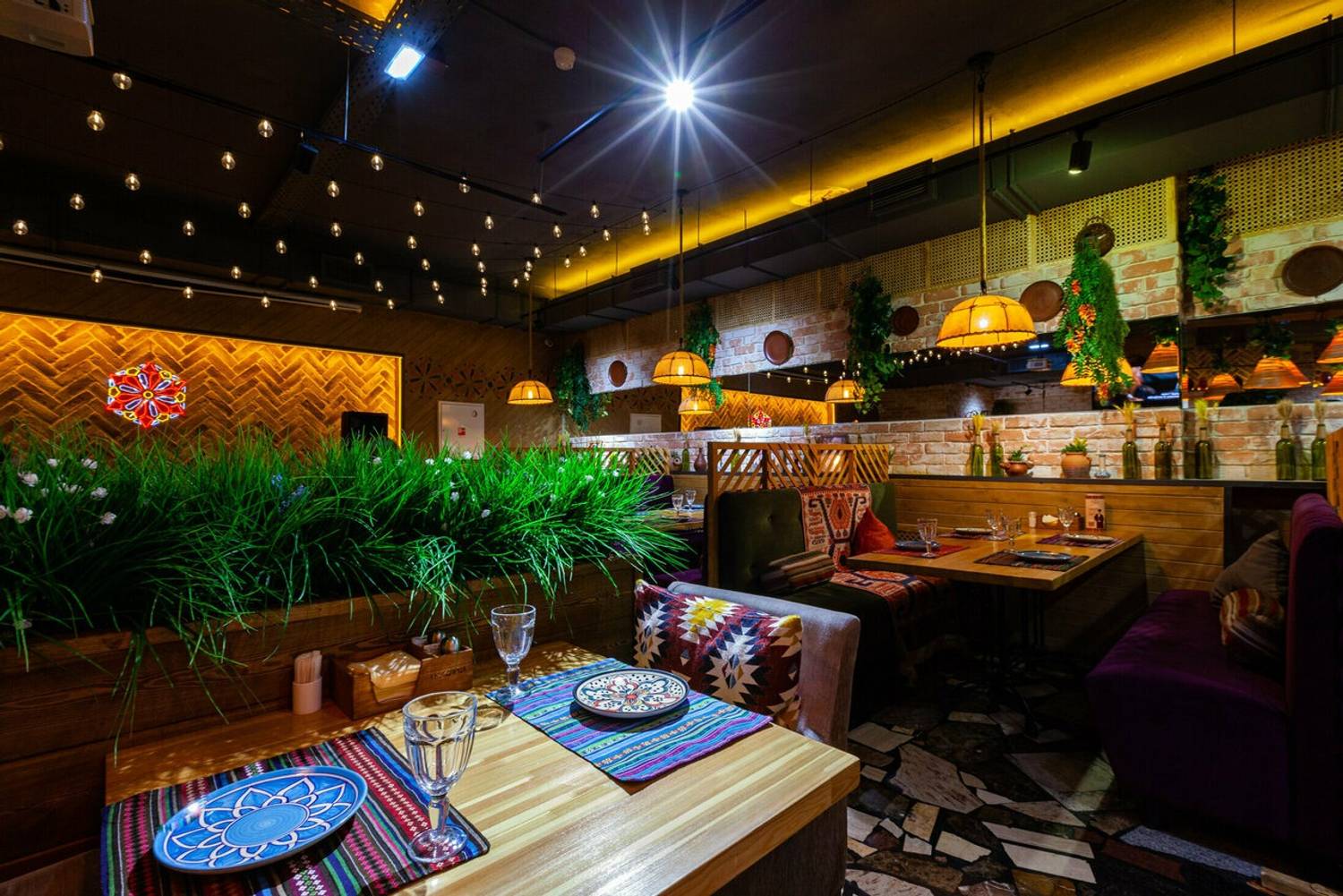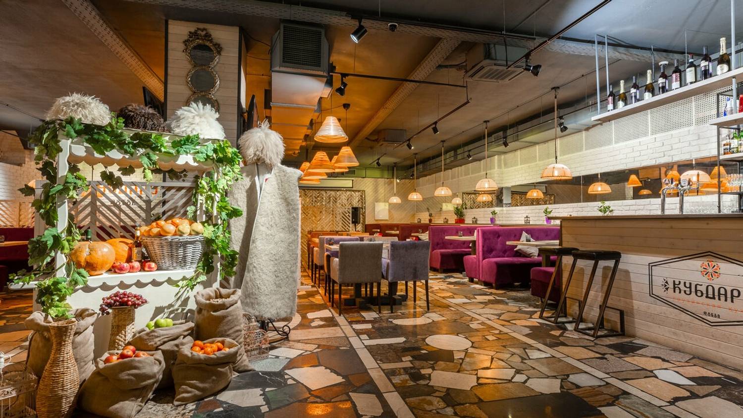 Атмосфера. Здесь словно художественная реконструкция грузинского колорита: расписанные вручную кирпичные стены с граффити по мотивам картины «Поющие грузины», пол из натурального камня и деревянные столы. Детали дополняют образ: традиционные ковры с орнаментами на стенах, грузинские папахи, банки с соленьями на полках.