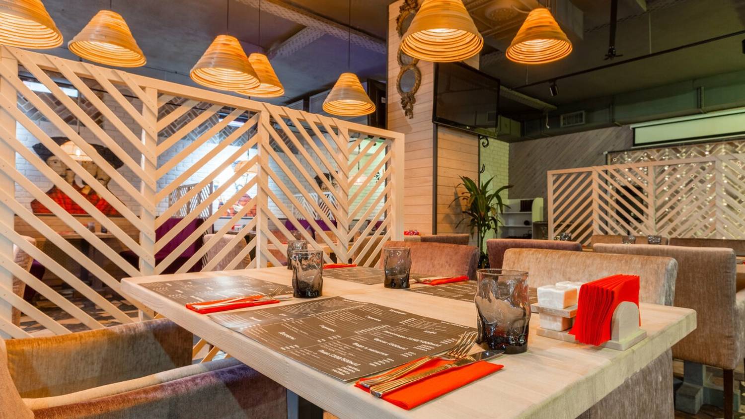 Еда и напитки. В меню — грузинская кухня: бараньи семечки, шашлык из телятины, гранд-чебурек с бараниной, оджахури из индейки. Есть и авторские интерпетации: хачабургер с говядиной, бараниной. Из сладкого готовят панакоту из мацони и чизкейк с киселем из черники.