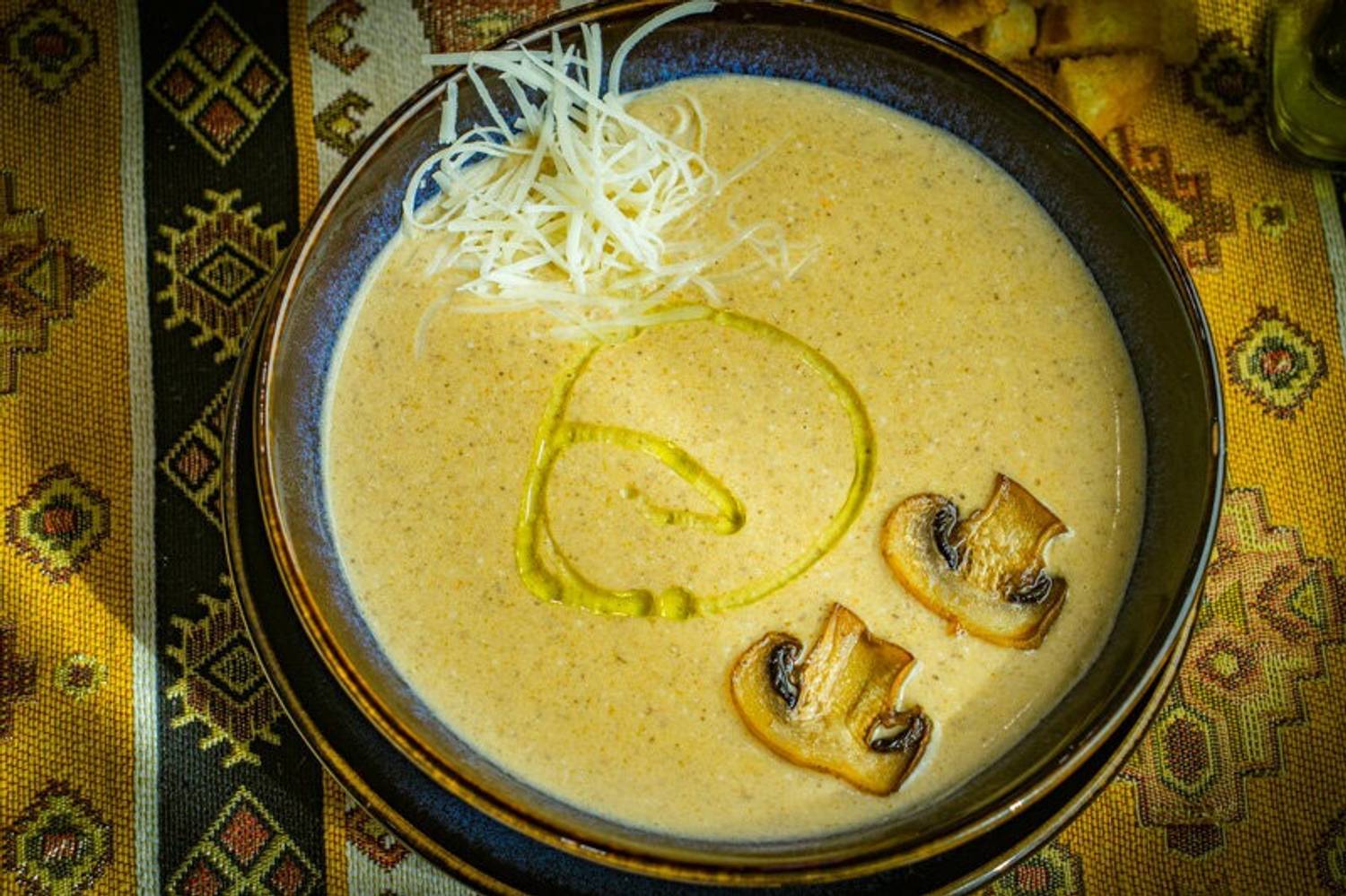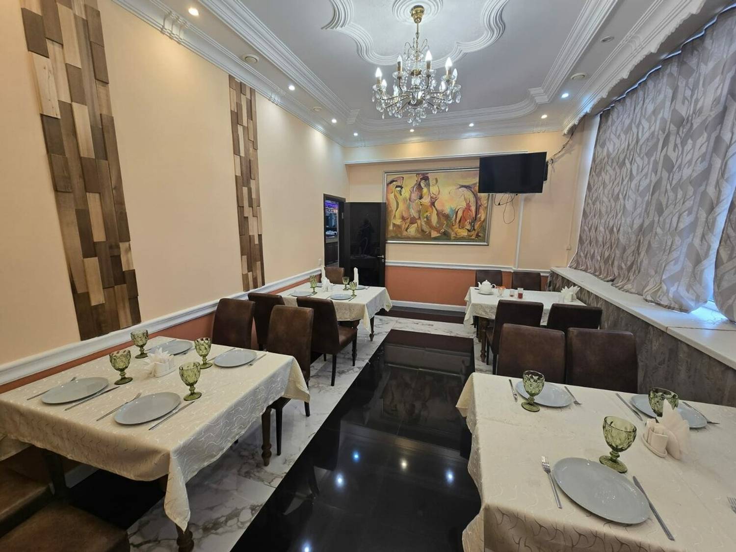 Еда и напитки. В меню — жареная телятина, плов по-азербайджански, семга под сливочным соусом, кутабы с мясом, язык говяжий с хреном. Также тут готовят шашлык на углях: из бараньей корейки, куриного бедра, свиных ребер.