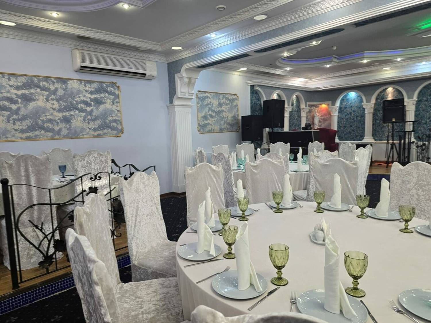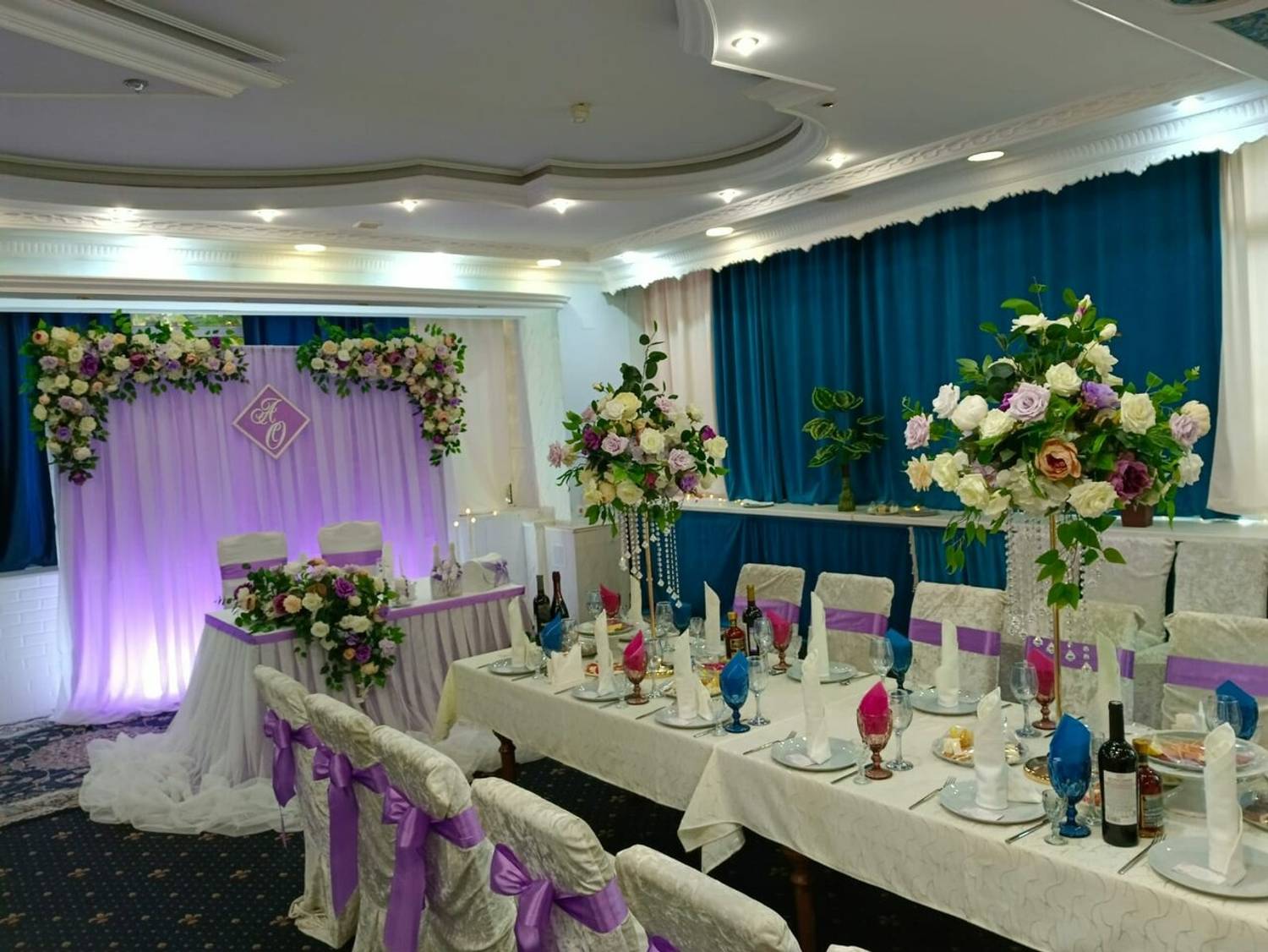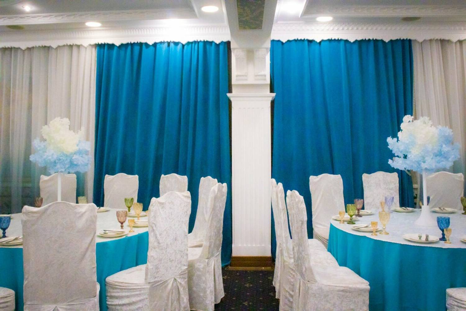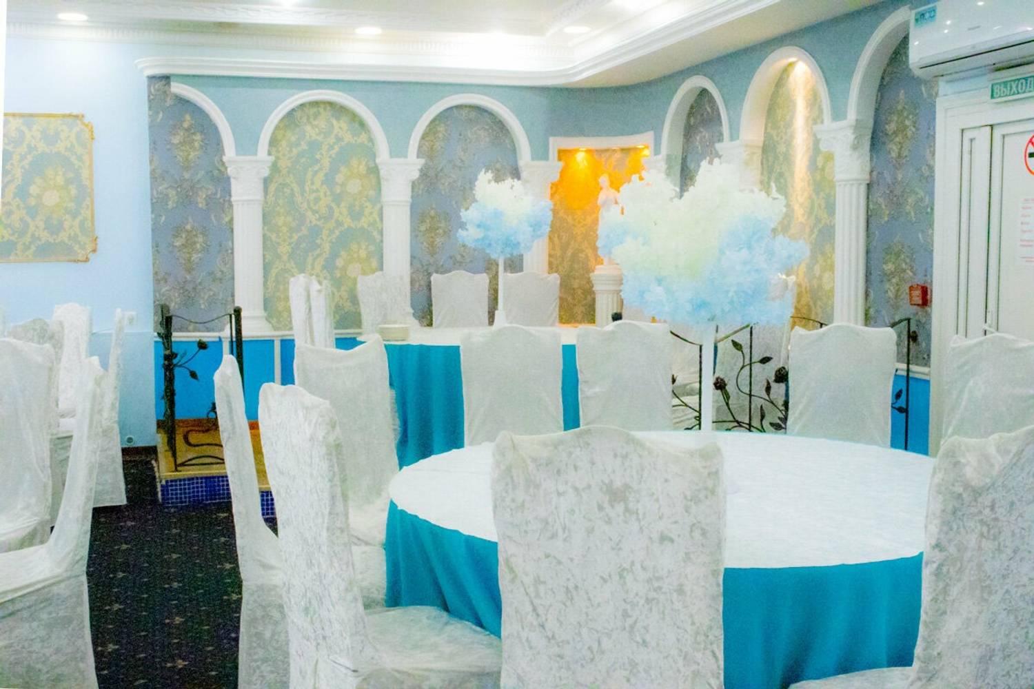 Атмосфера. Внутри залы в торжественной гамме с ярко выраженными восточными мотивами. Пространство украшают белые колонны, стены со встроенными арочными нишами с восточными орнаментами. Синие шторы добавляют цветовой контраст, а зал дополнен потолочной подсветкой и цветочным декором создает праздничную атмосферу. Здесь организовывают праздники до 150 гостей.