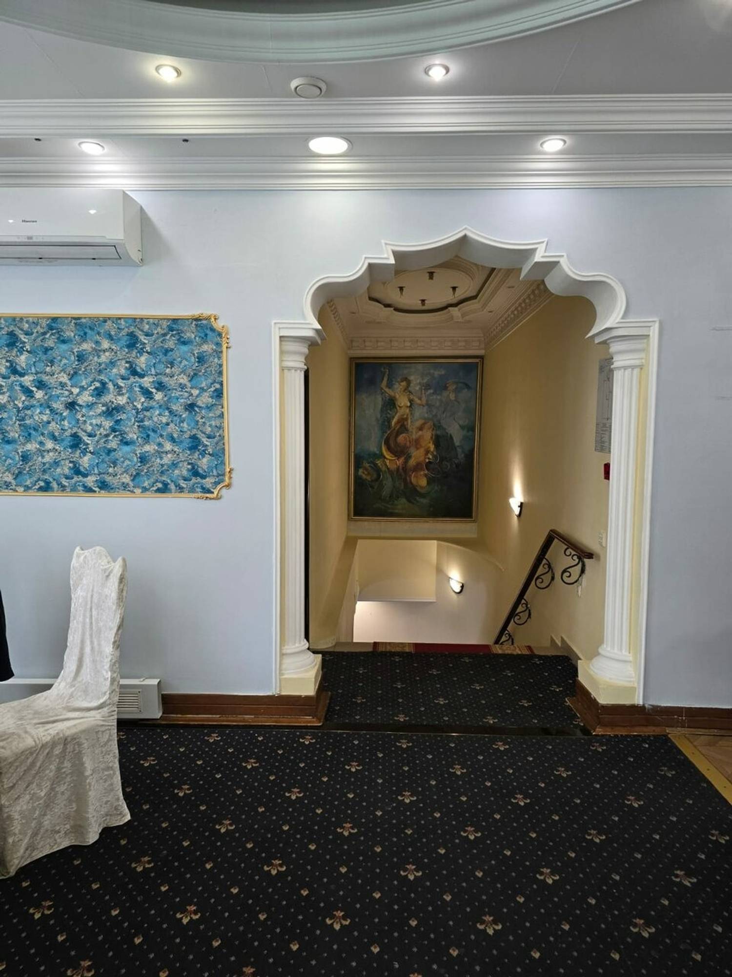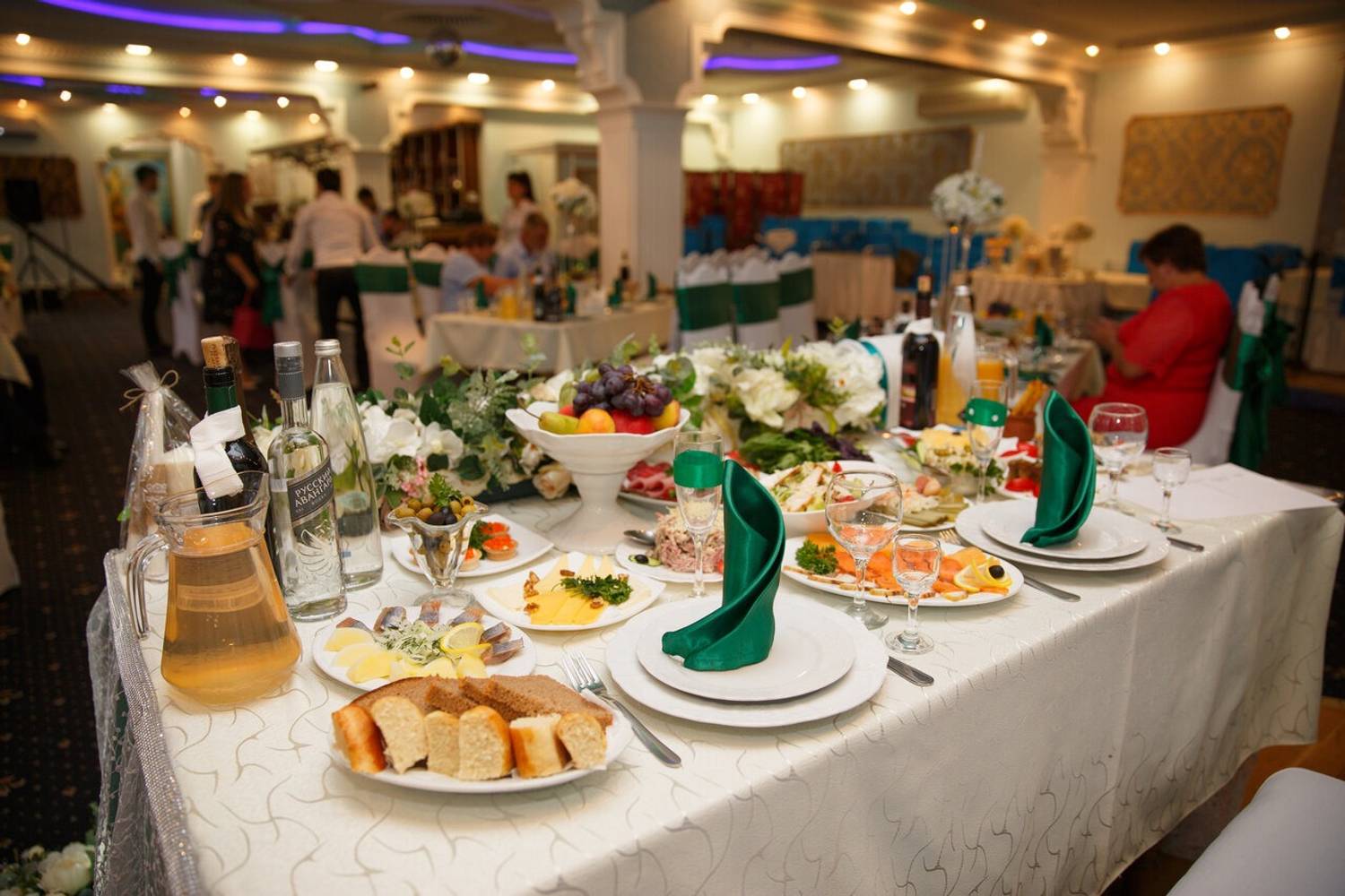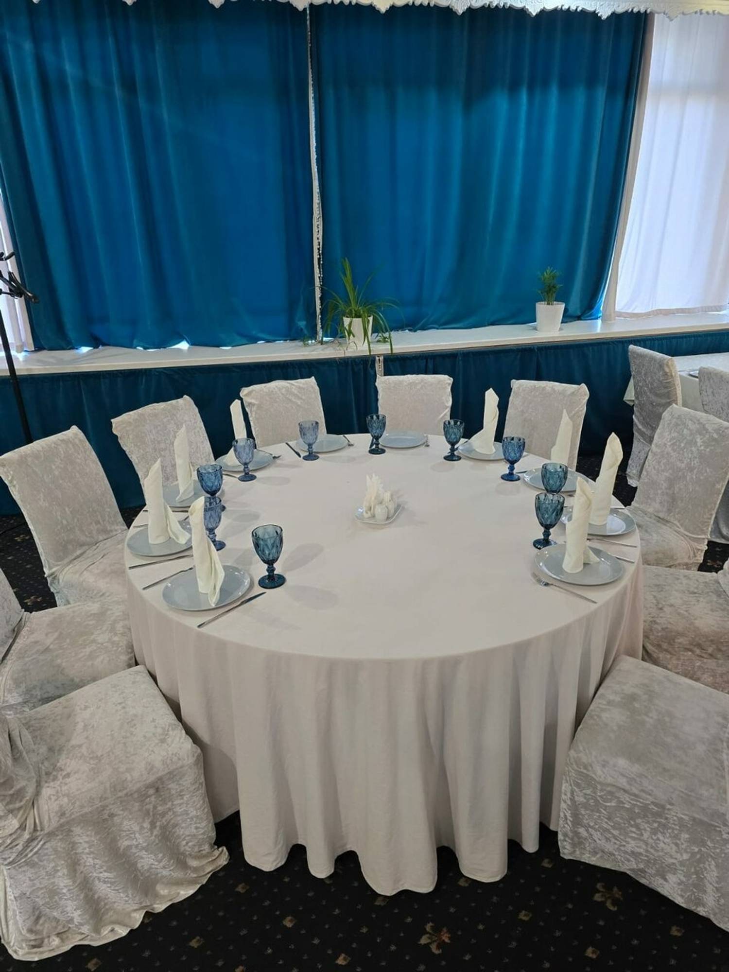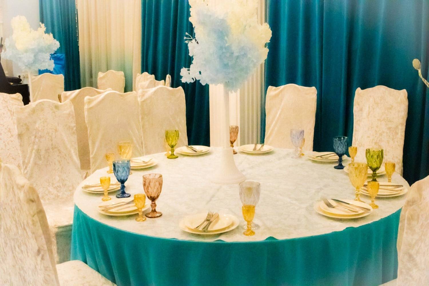 Атмосфера. Внутри залы в торжественной гамме с ярко выраженными восточными мотивами. Пространство украшают белые колонны, стены со встроенными арочными нишами с восточными орнаментами. Синие шторы добавляют цветовой контраст, а зал дополнен потолочной подсветкой и цветочным декором создает праздничную атмосферу. Здесь организовывают праздники до 150 гостей.
