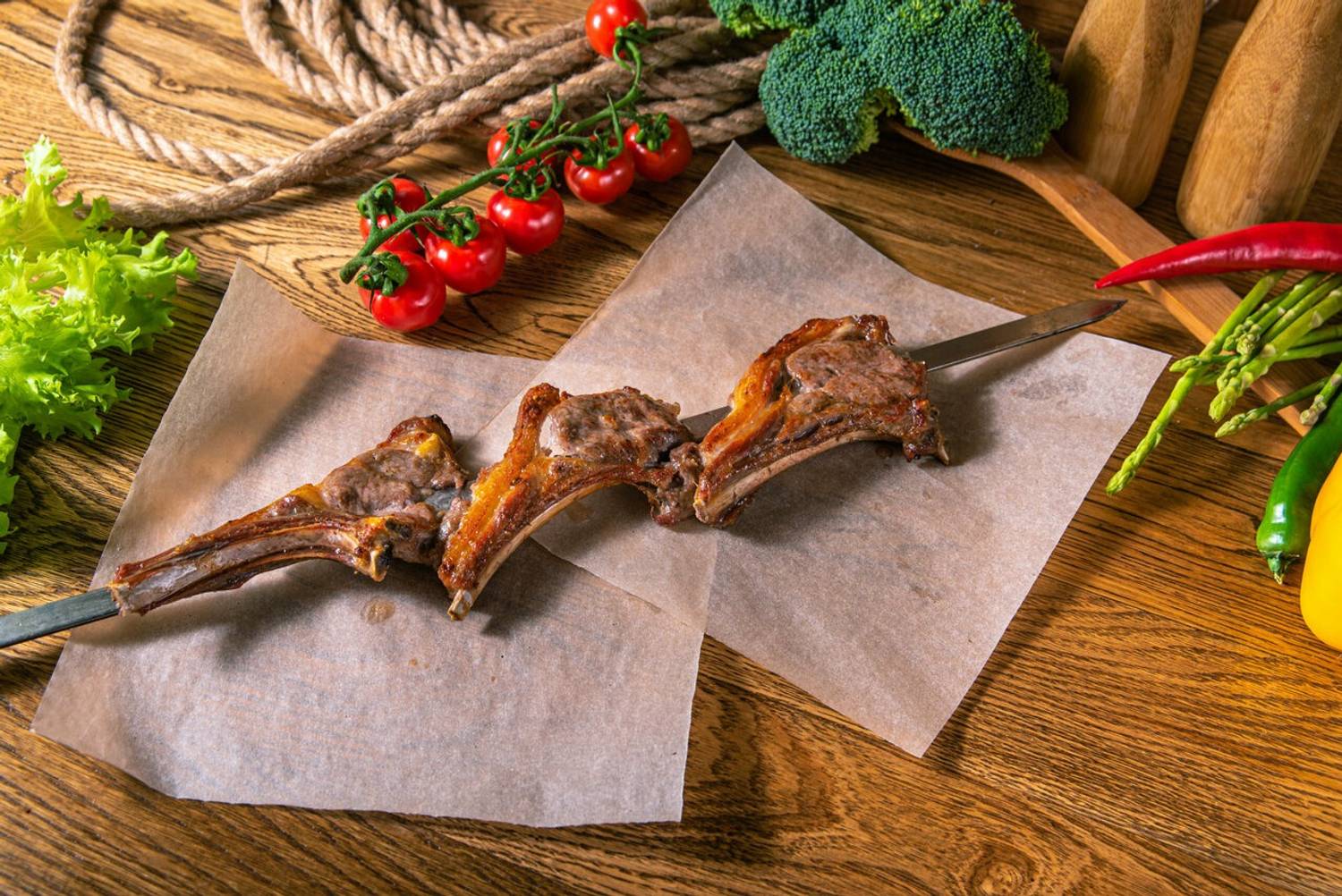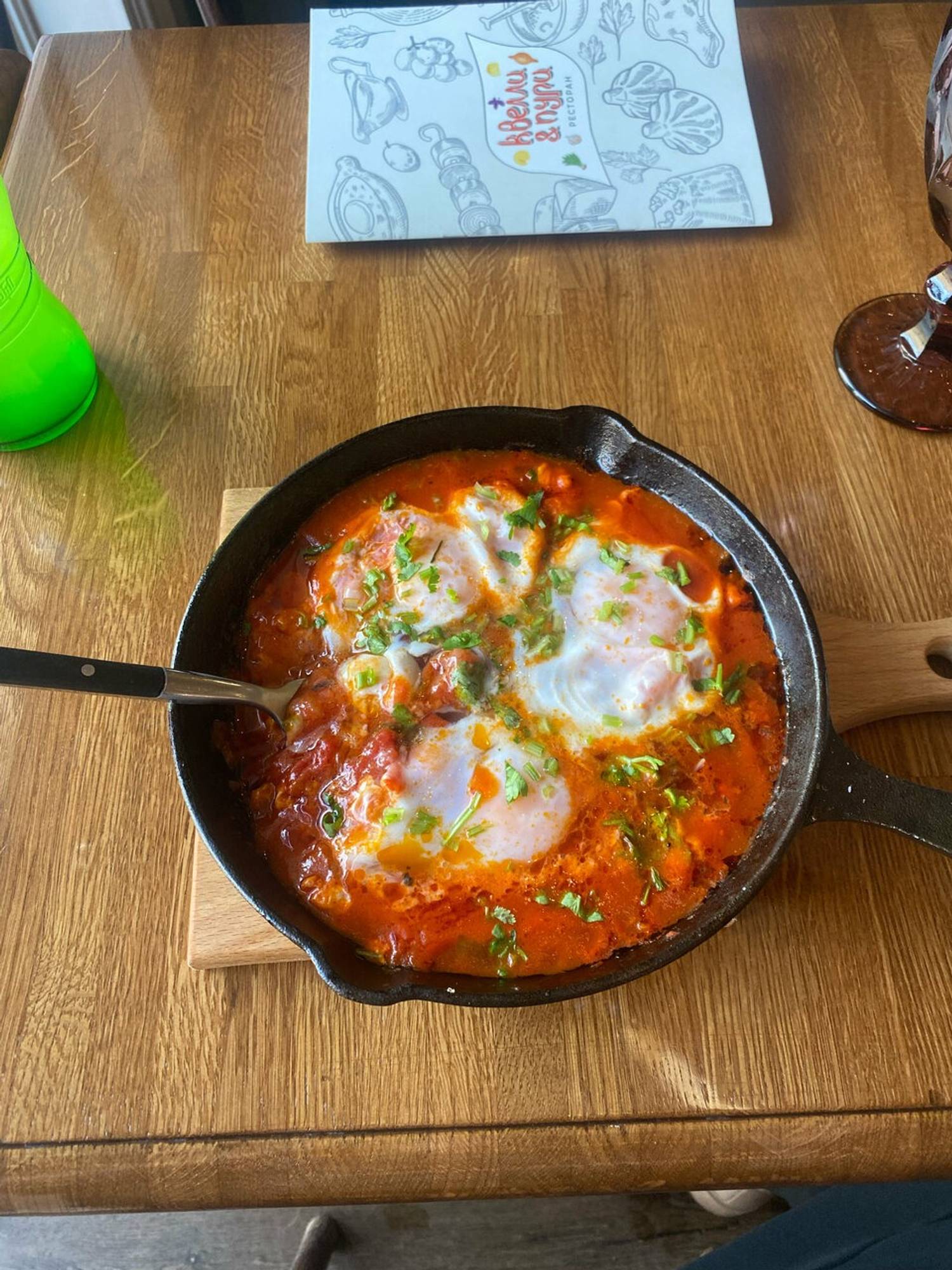 Еда и напитки. В меню — традиционные грузинские блюда: шашлык из свиной шейки, микс хинкали, овощной салат по-грузински с орехами, эларджи с филе цыпленка и сациви.
