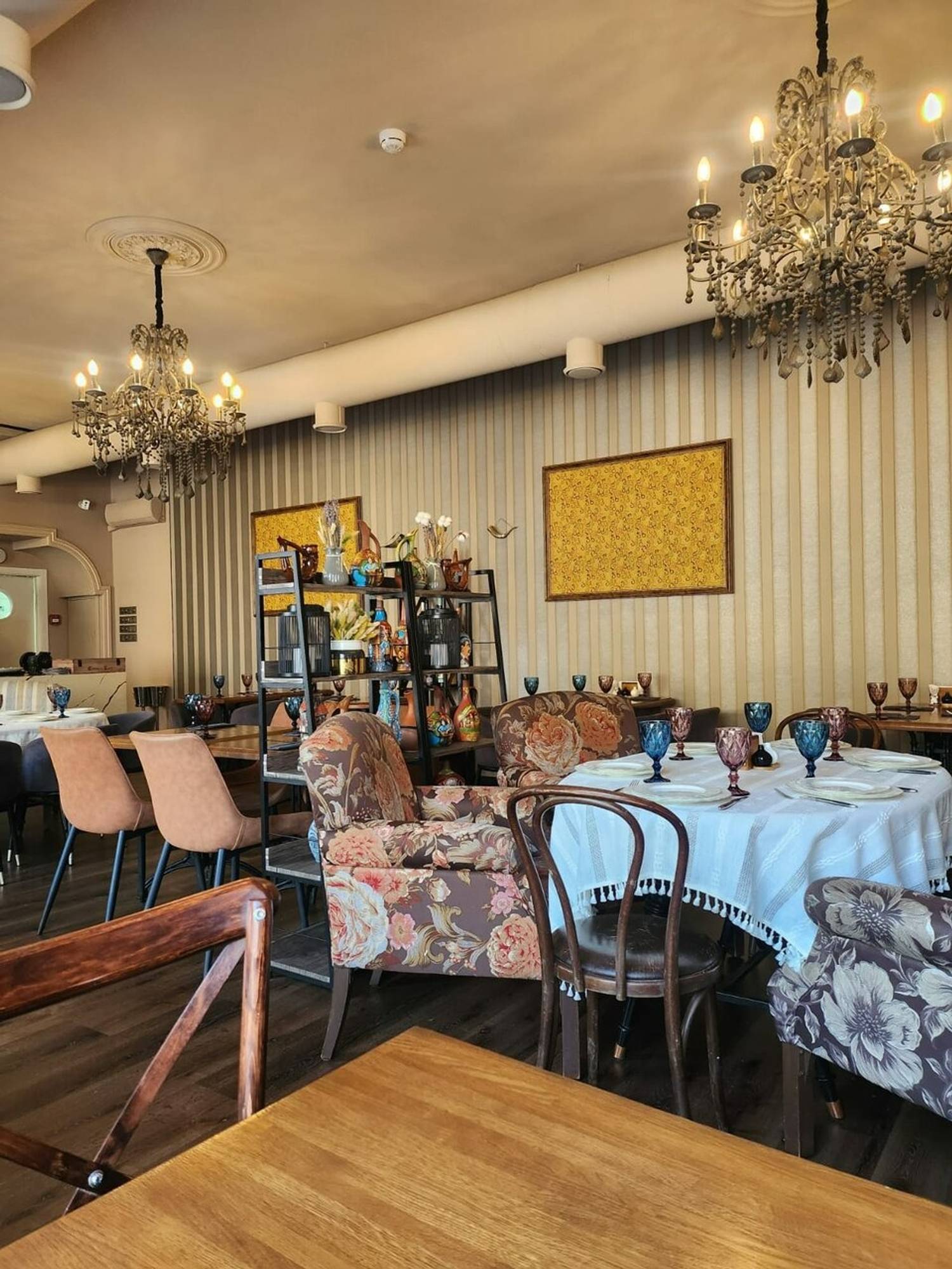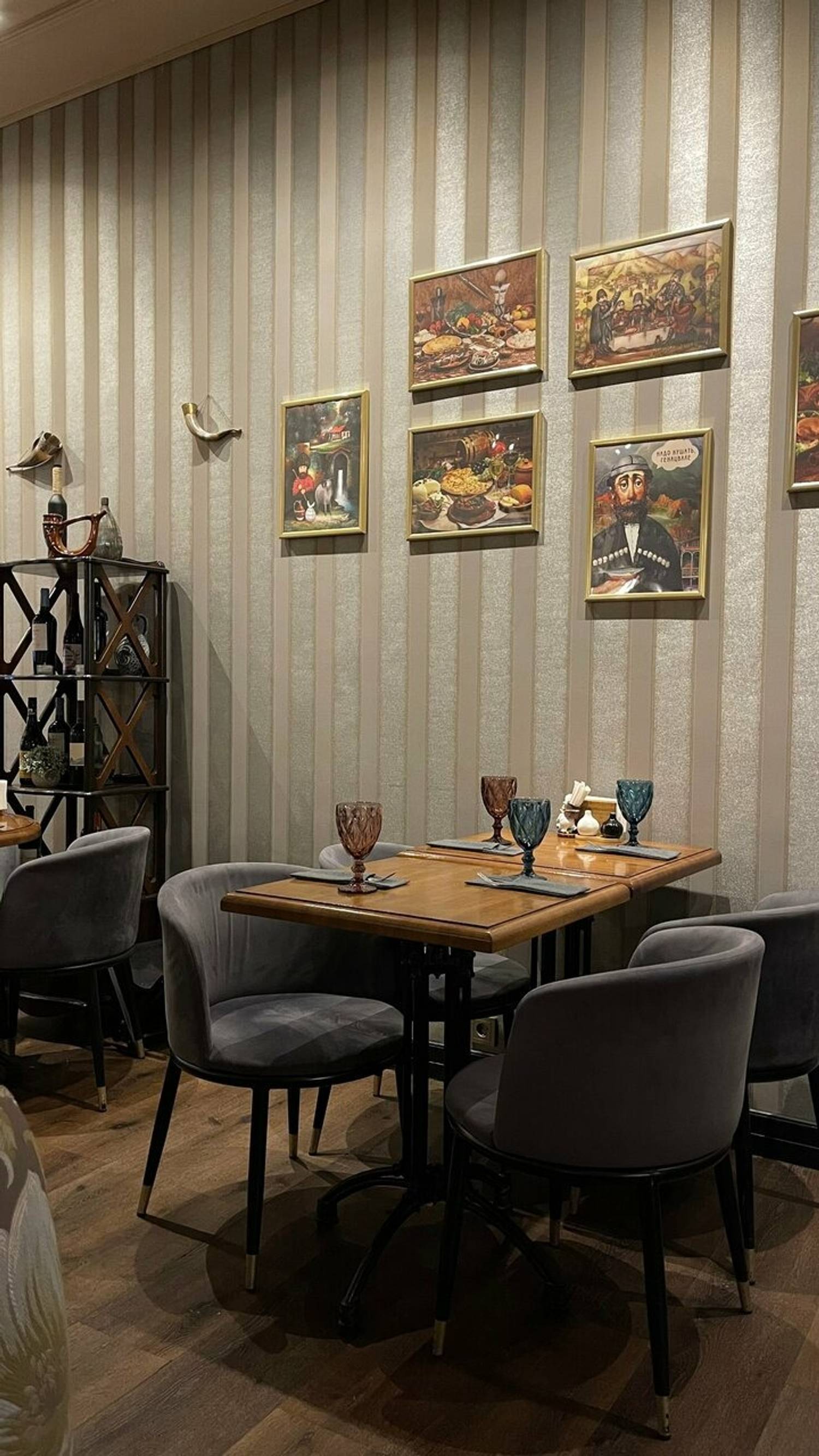 Атмосфера. Заведение с темной деревянной мебелью, барочными люстрами с абажурами и декоративными рамами, а также полками, на которых расставили национальные глиняные кувшины.