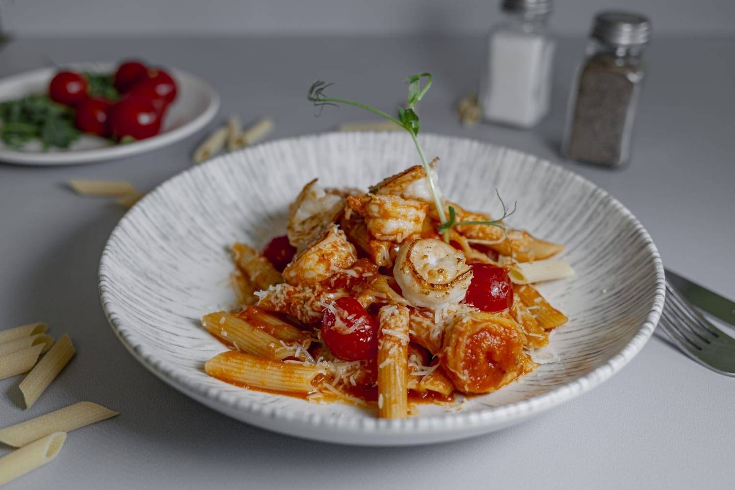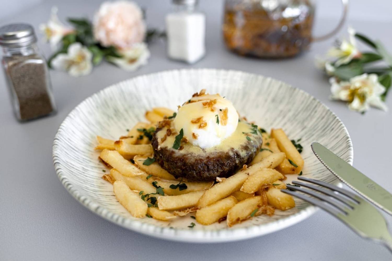 Меню включает завтраки, которые подают весь день, а также закуски и горячие блюда. Попробуйте миндальный круассан, овсянку с голубикой, кростини пепперони и салат со страчателлой. В горячем меню — паста, котлеты из индейки, бифштекс с овощами и пельмени с курицей. На десерт — меренговый рулет с клубникой.