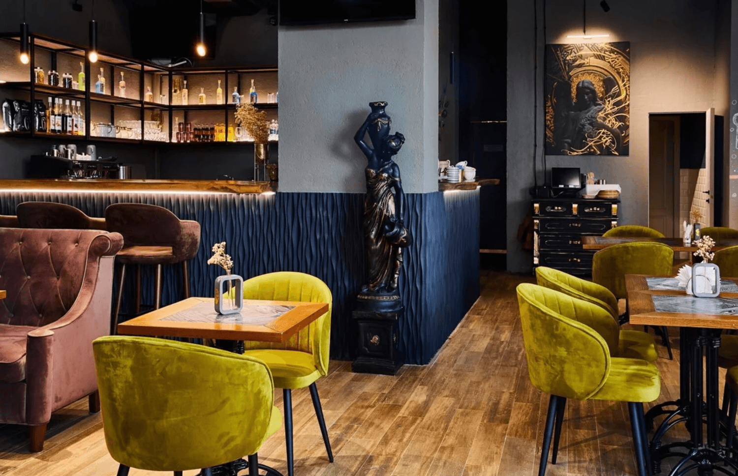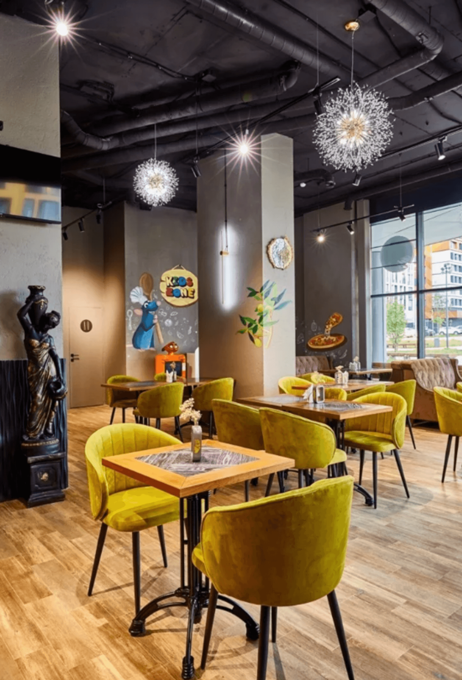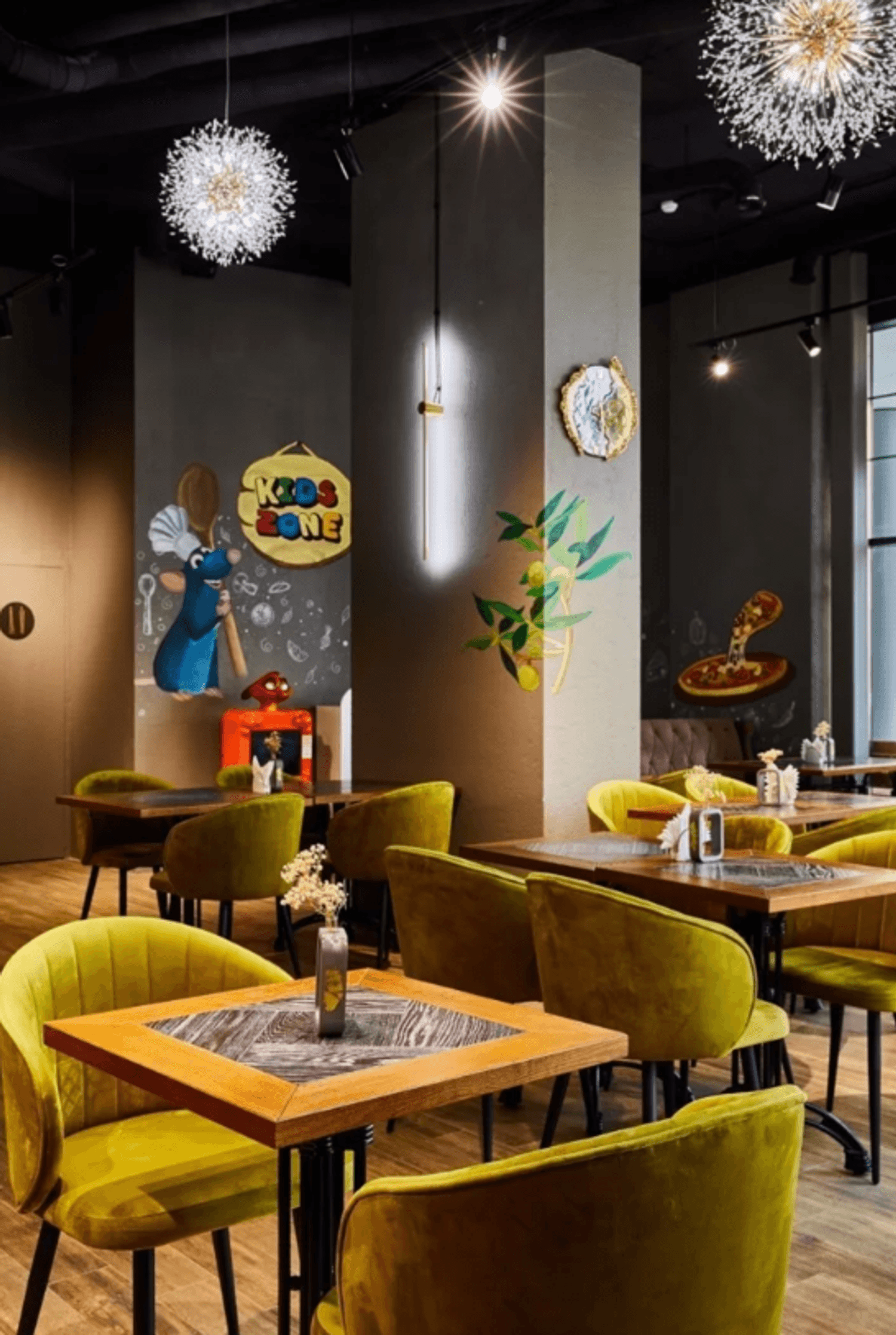 Атмосфера. Пространство наполнено светом благодаря панорамным окнам, а сочные оттенки мягкой мебели и декор с античными мотивами создают элегантную обстановку. Люстры здесь напоминают пушистые одуванчики, а на стенах нарисовали улыбчивого главного героя мультфильма «Рататуй».