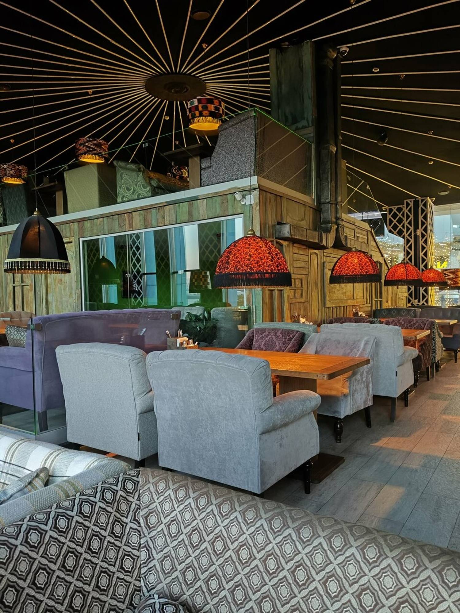 Атмосфера. Зал словно освещает солнце — лучеобразная форма люстры напоминает именно это. Также из красивых деталей — люстры над столами, похожие на торшеры. По пятницам и субботам проводят вечеринки с диджеями и живой музыкой.