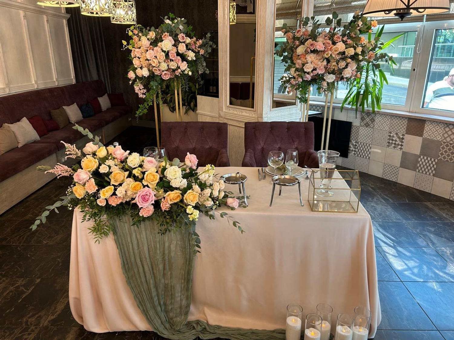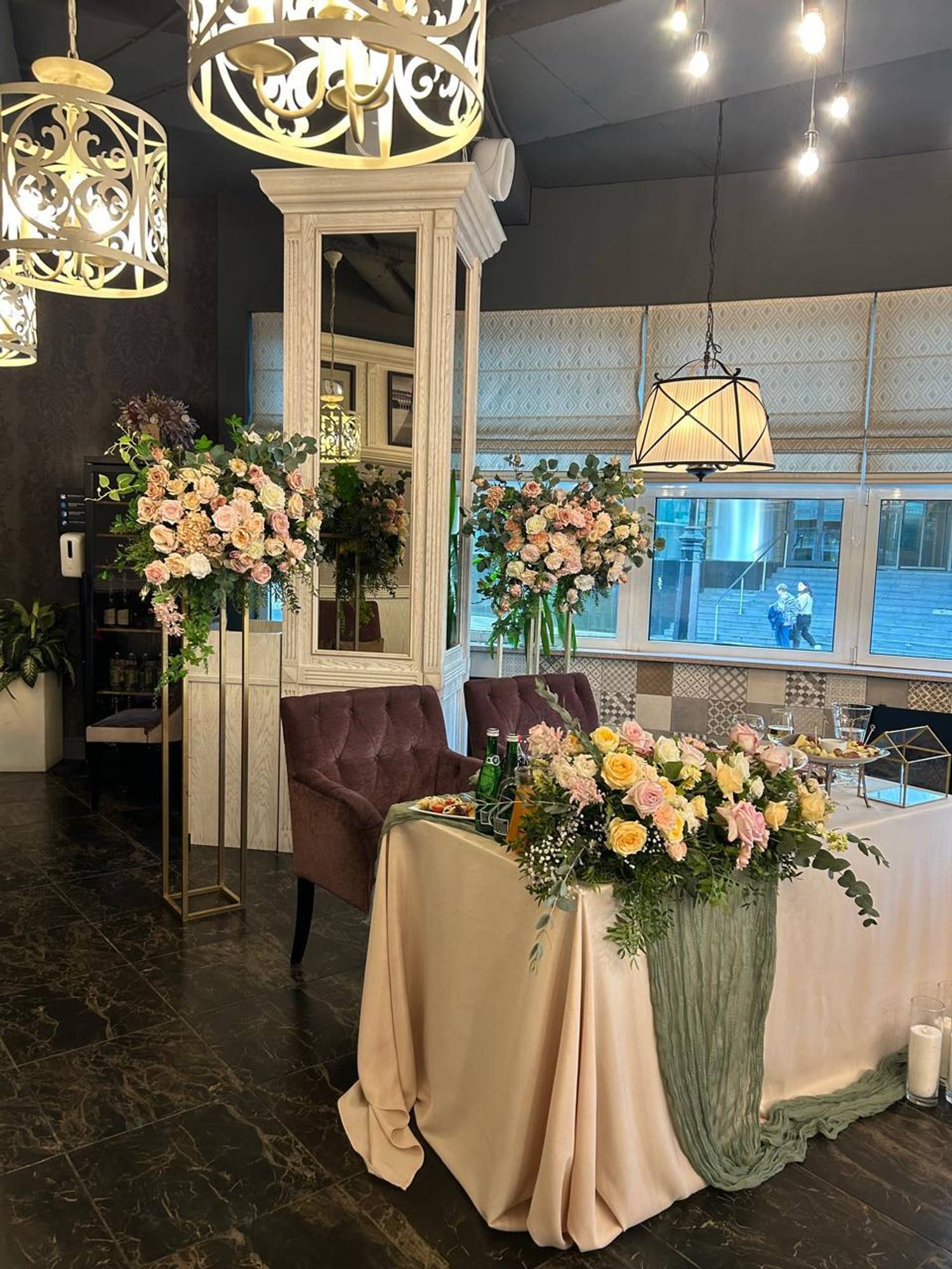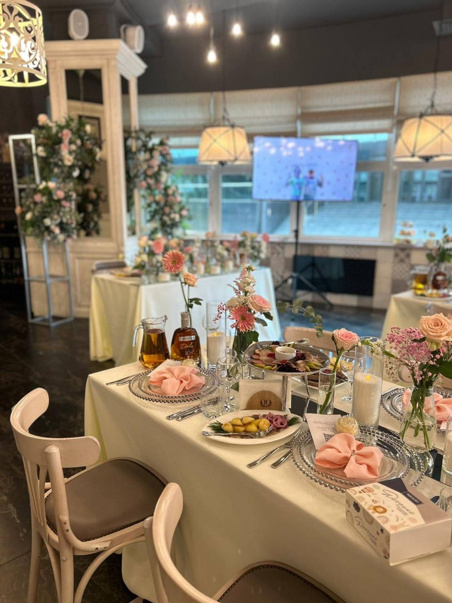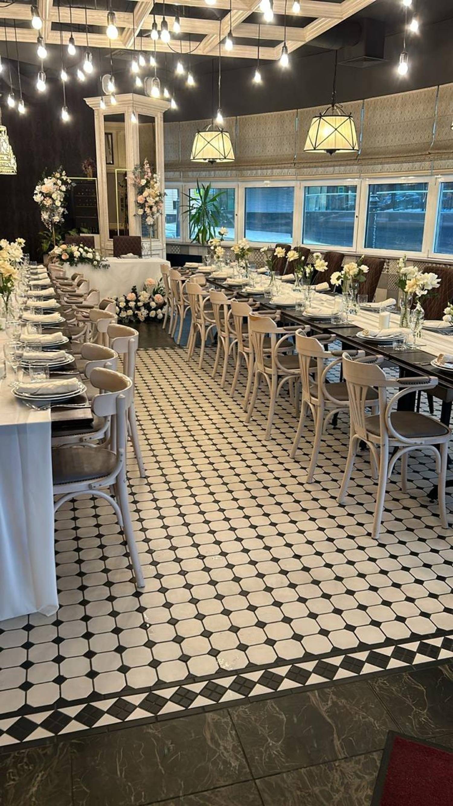 Атмосфера. Светлое пространство с панорамными окнами, деревянной мебелью и зеркальными колоннами создает ощущение французской усадьбы. Молочные тона, подвесные светильники и камерная VIP-зона у входа формируют элегантную и камерную обстановку для праздников и встреч.