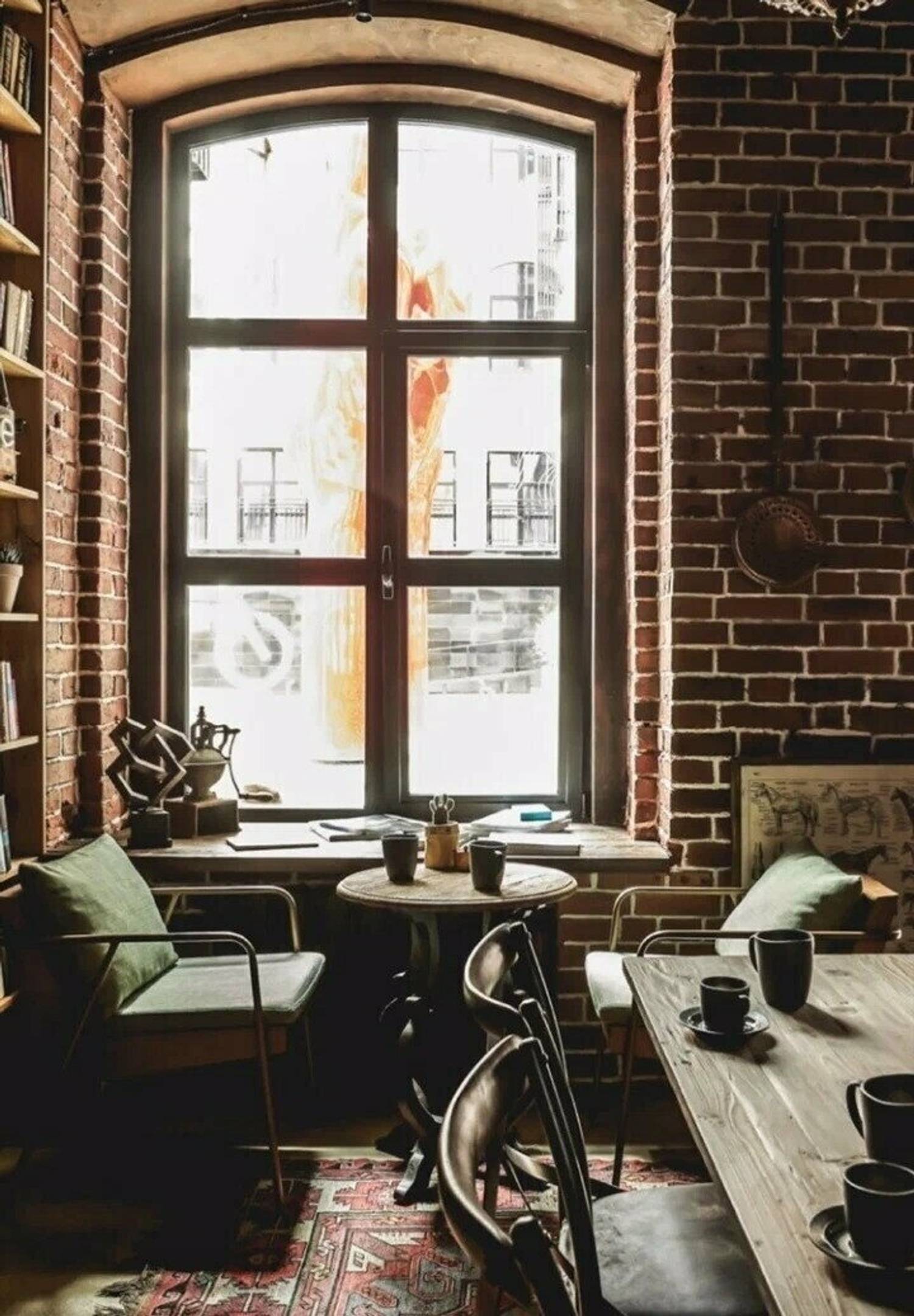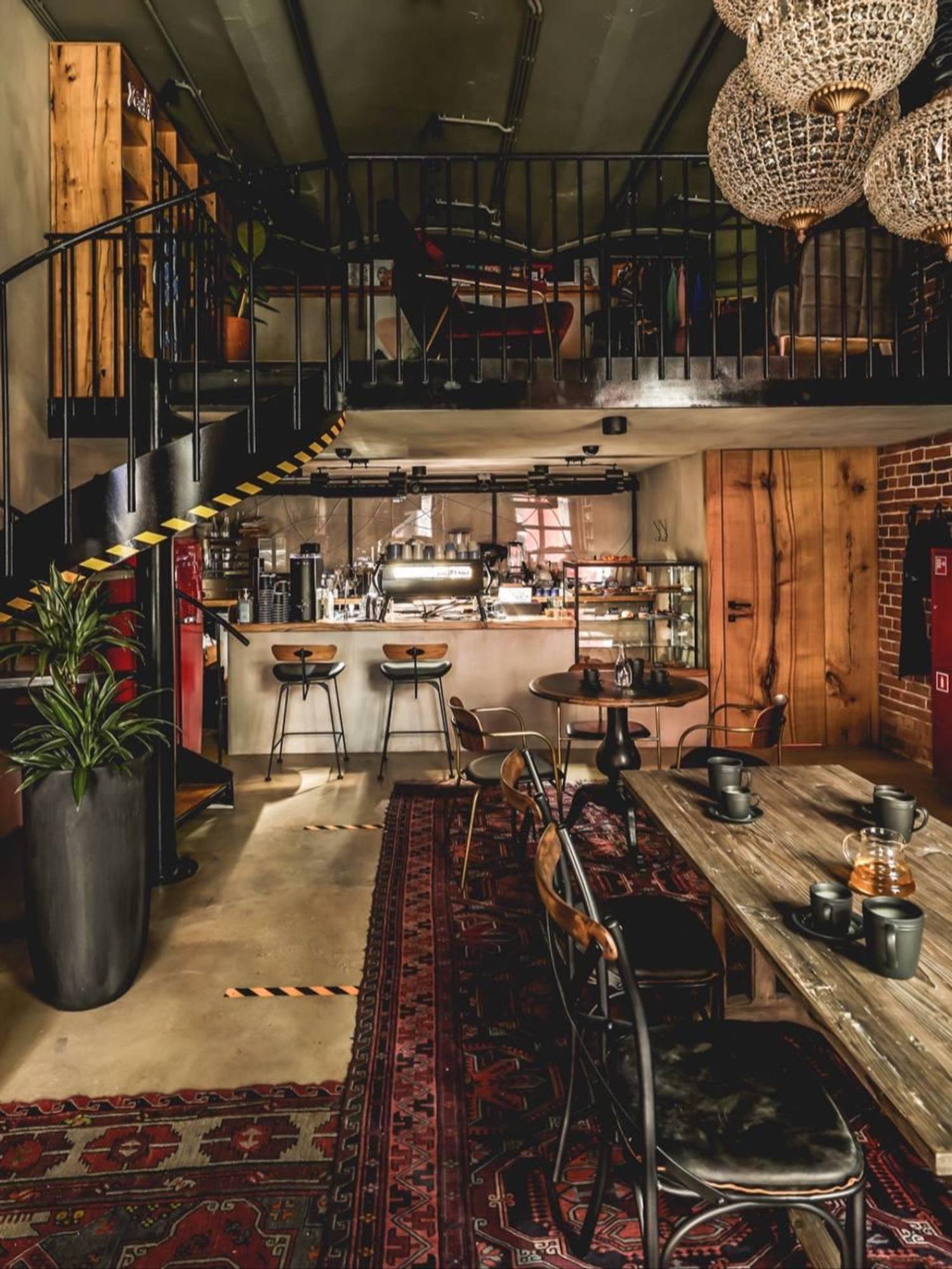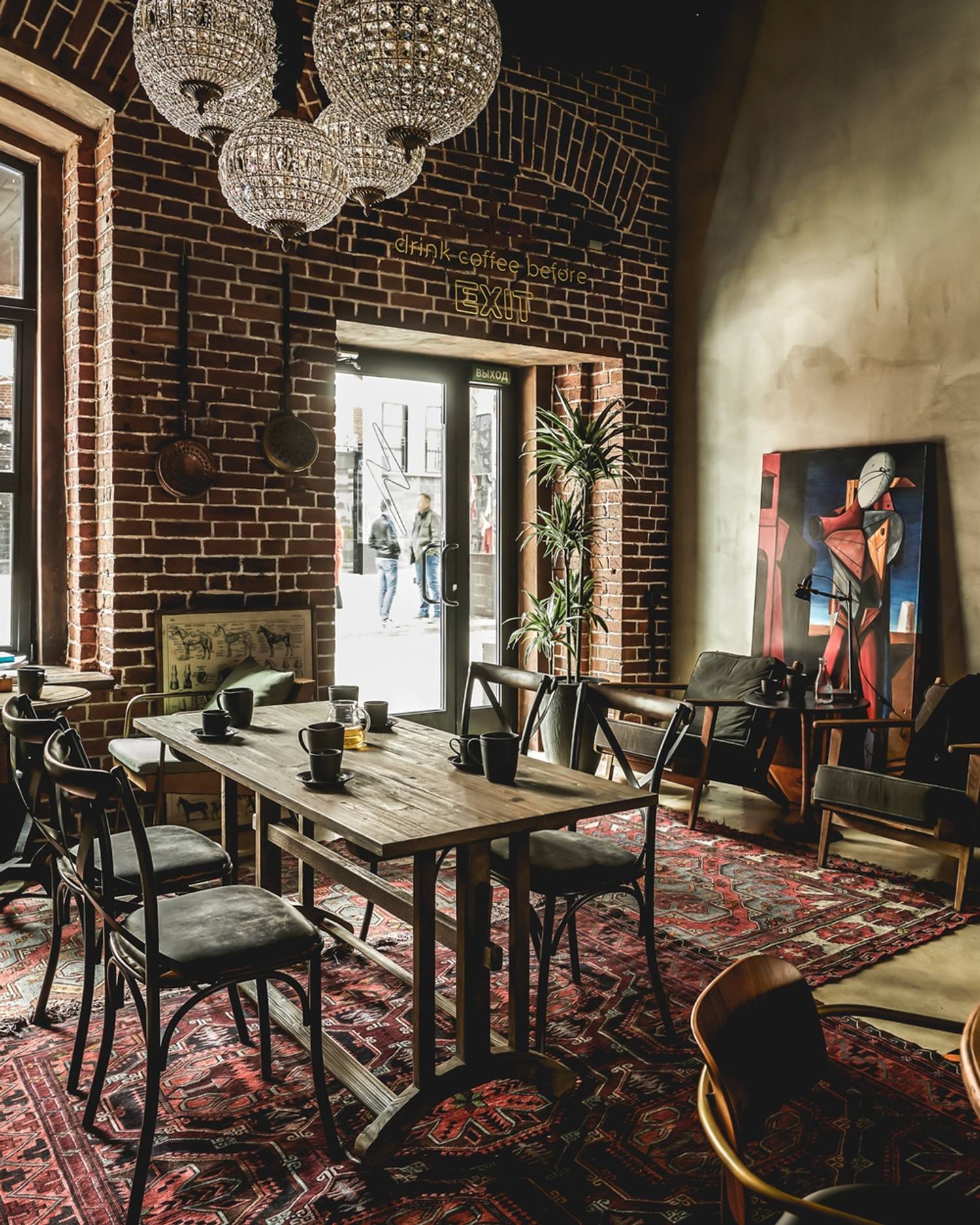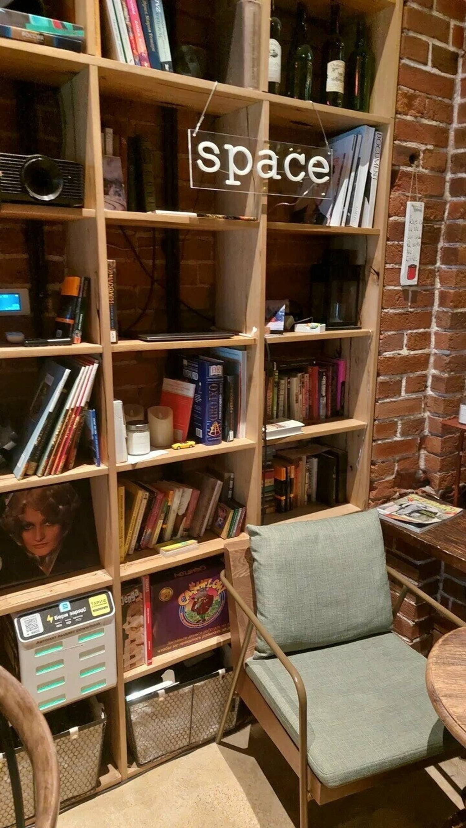 Атмосфера. Интерьер выполнен в стиле лофт с элементами гранжа: кирпичные стены, неоновые вставки, советские кресла и книжные полки, деревянная мебель и детали из грубого металла. ПЗдесь проходят кинопоказы, лекции, выставки, клубы по интересам, мастер-классы и вечеринки. На втором этаже — шоурум дизайнерской одежды I’MM.