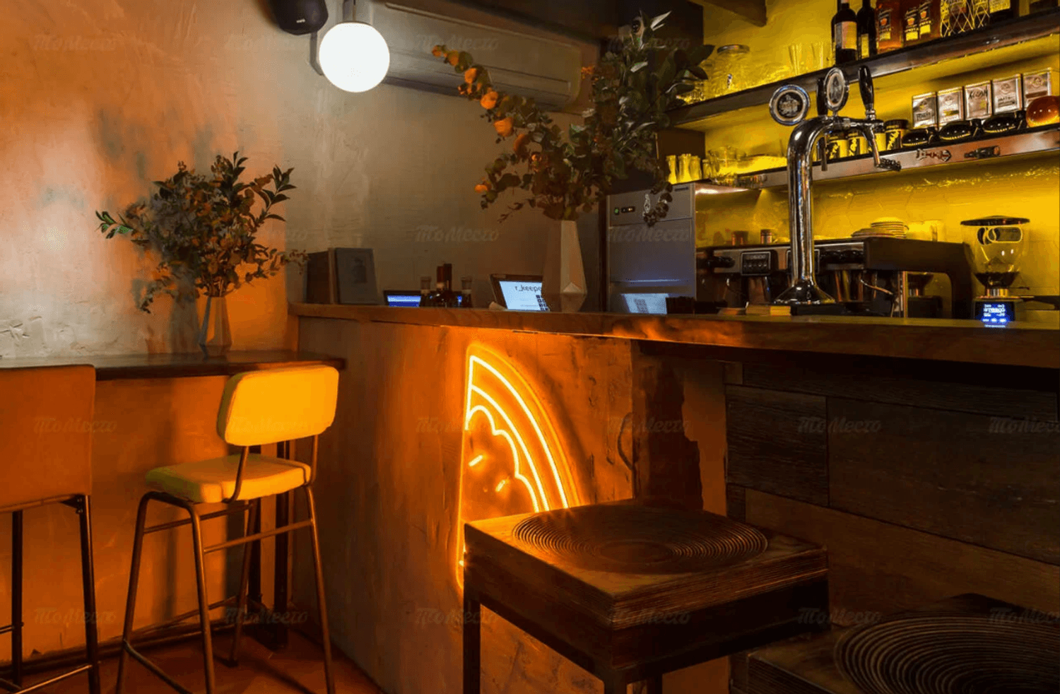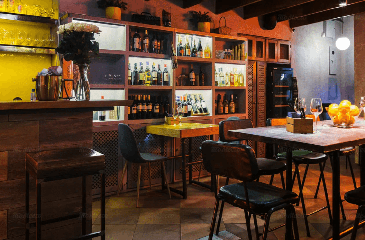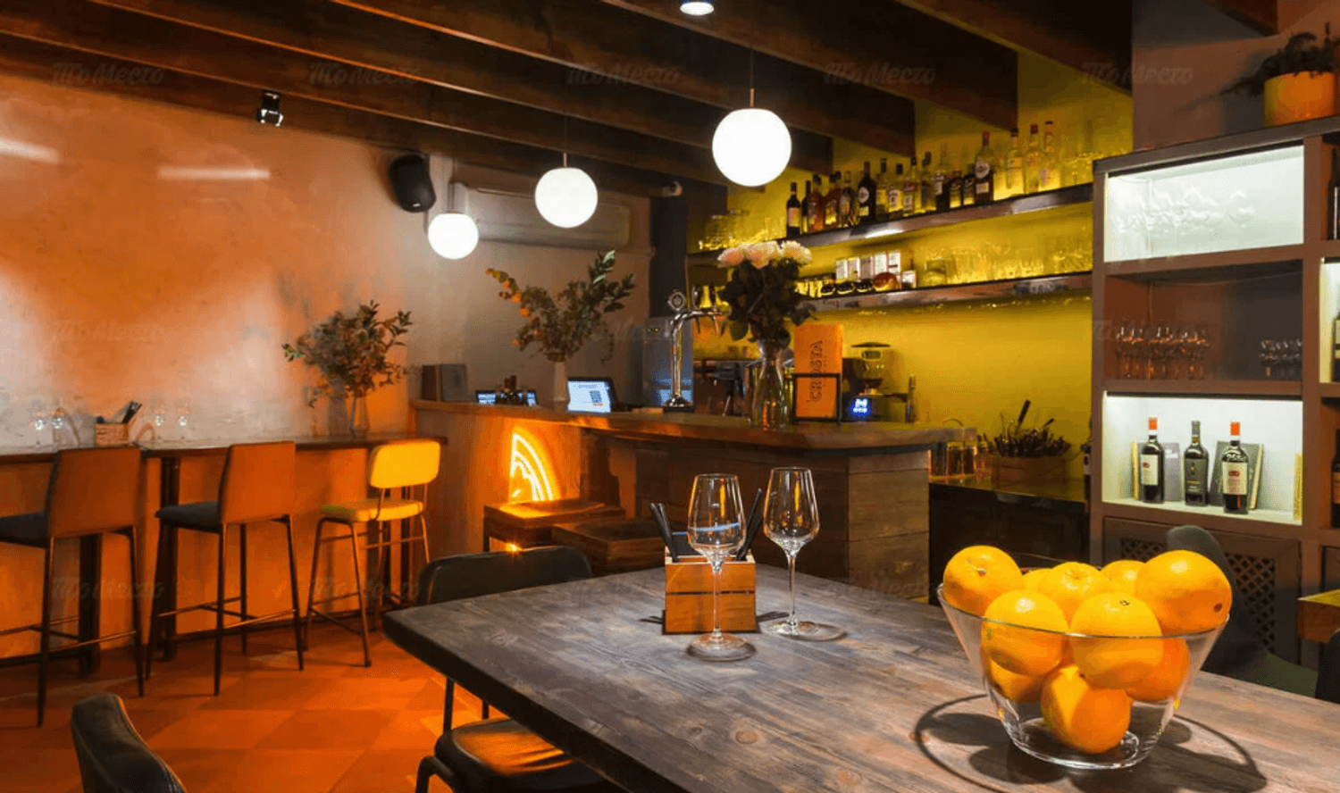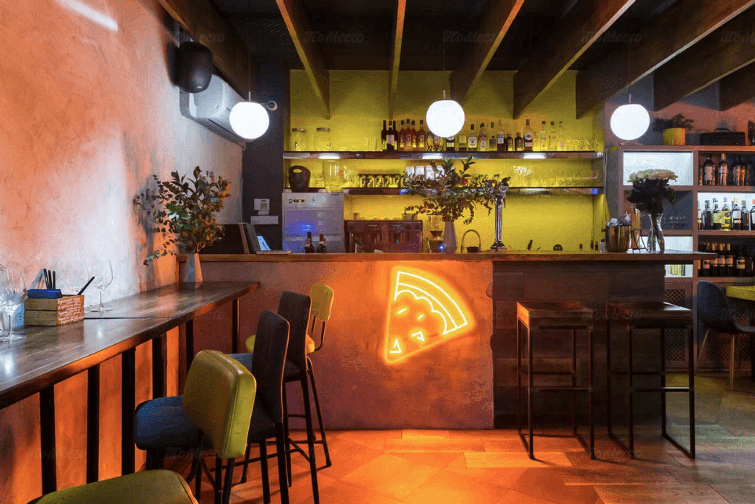 Еда и напитки. В меню — пицца с мортаделлой и страчателлой, паста Карбонара и фетуччини с лососем, а также закуски: тартар из говядины, сырное плато и хумус. На горячее подают филе миньон и дорадо. К блюдам можно заказать вина или авторские коктейли.