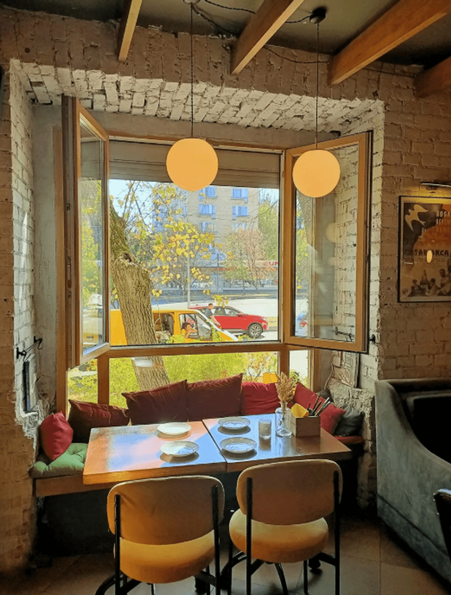 Атмосфера. Пространство с бетонными стенами, деревянной мебелью и мягким светом создает расслабленную обстановку для вечерних встреч. Центром внимания становится проектор, на котором транслируют фильмы, превращающие обычный ужин в кинопросмотр.