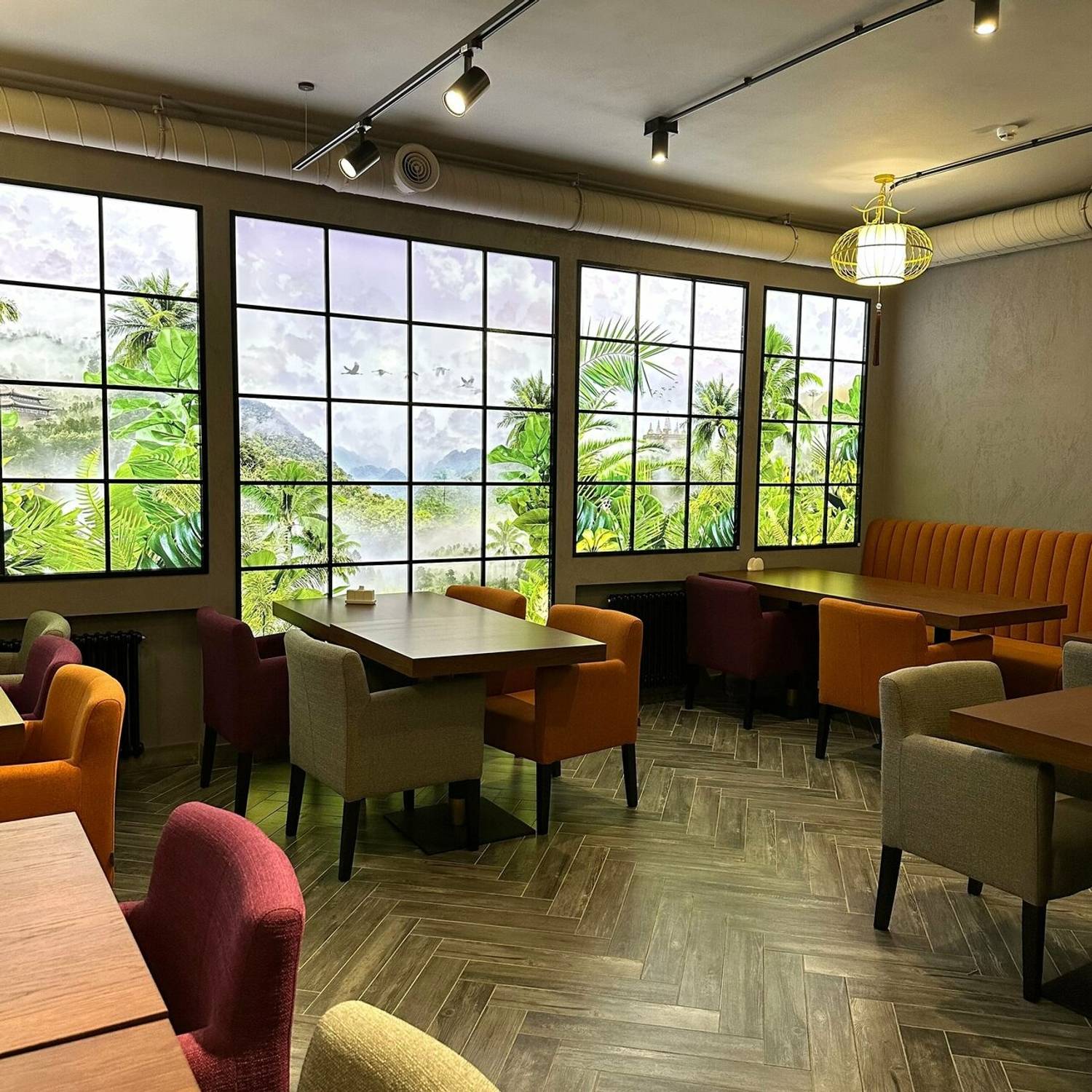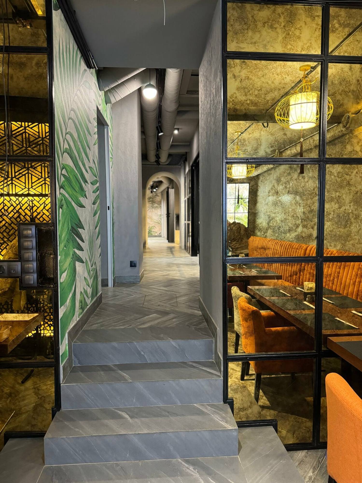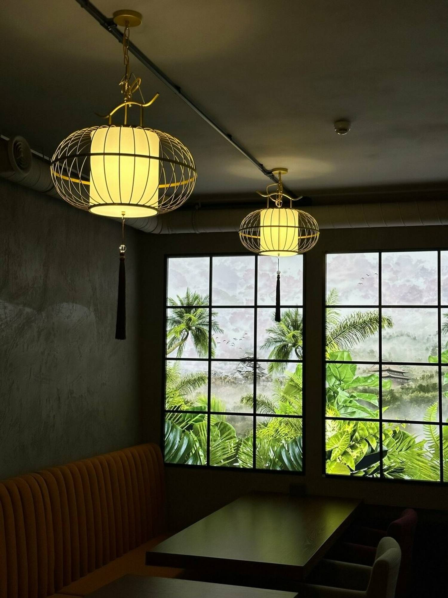Атмосфера. Темная цветовая гамма служит фоном для декоративных панно с пейзажами Азии, металлических колонн с резьбой с внутренней подсветкой. Растения и фотообои создают ощущение, что вы уже путешествуете по Азии.