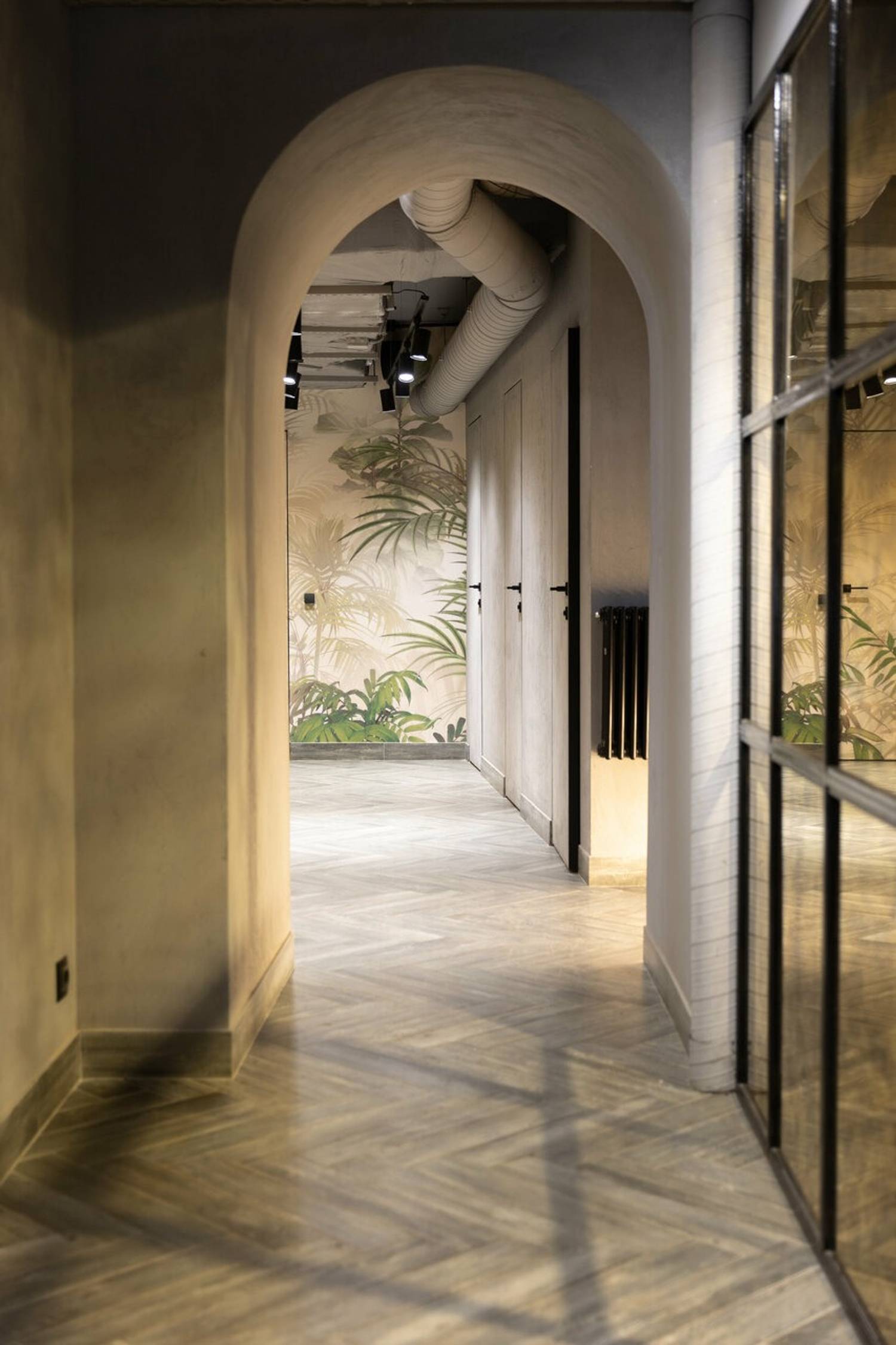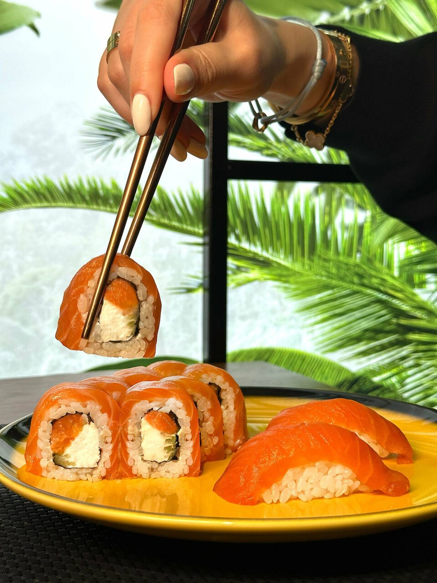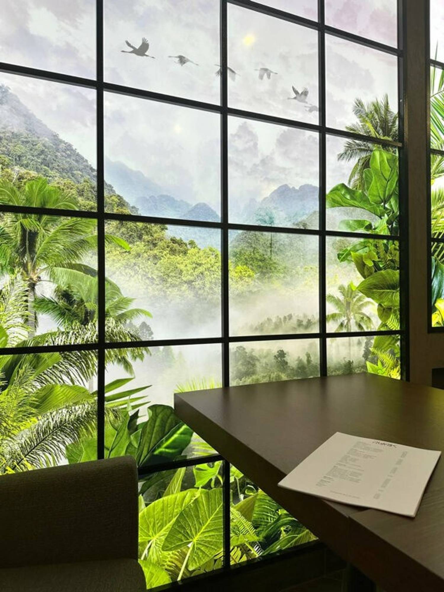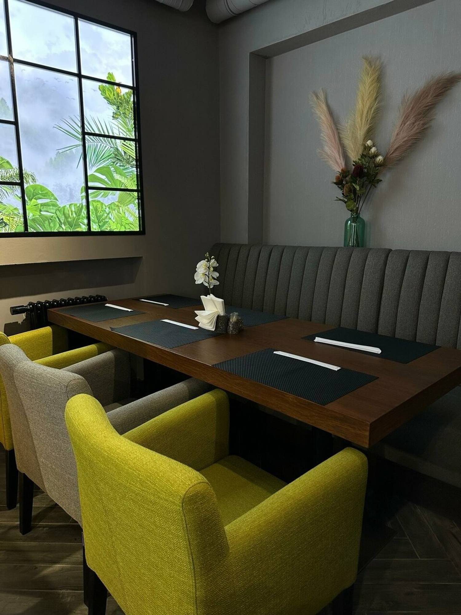 Атмосфера. Темная цветовая гамма служит фоном для декоративных панно с пейзажами Азии, металлических колонн с резьбой с внутренней подсветкой. Растения и фотообои создают ощущение, что вы уже путешествуете по Азии.