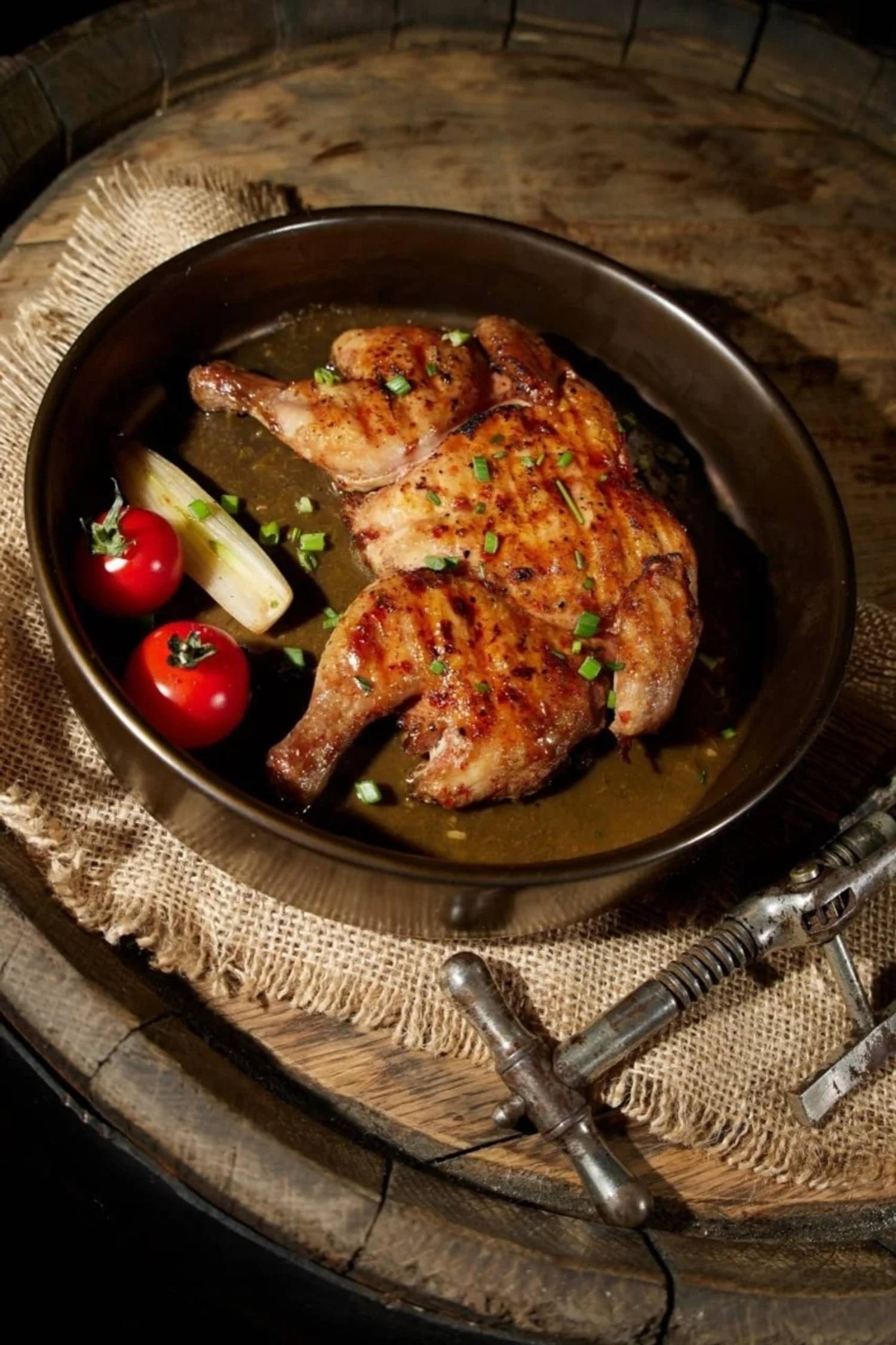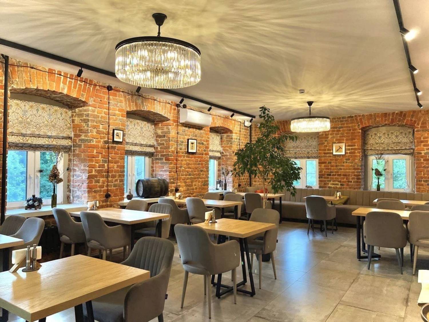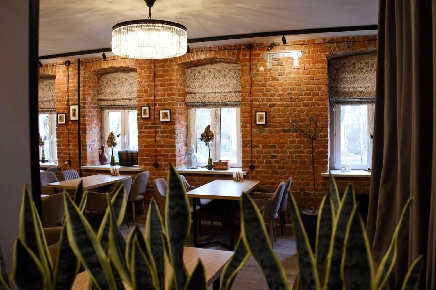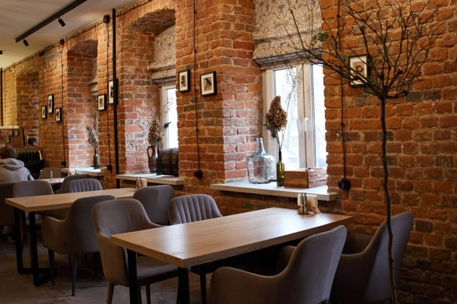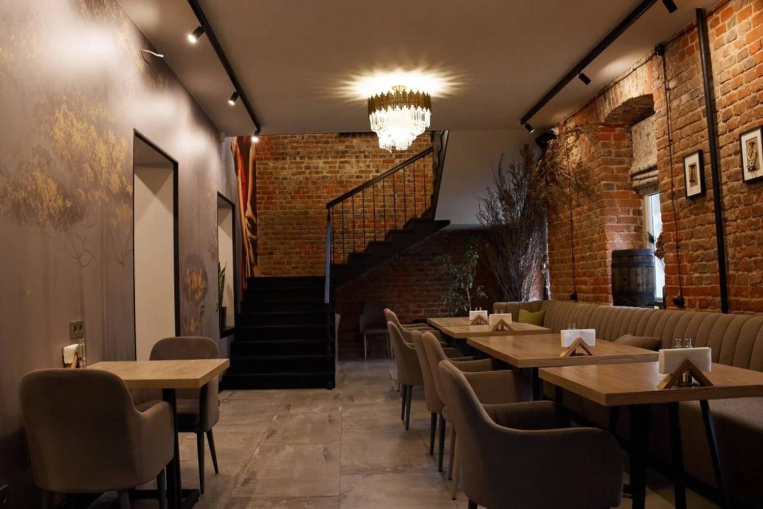 Атмосфера. Здесь создано двухэтажное пространство с лофтовой кирпичной кладкой, винтажной мебелью, картинами и висячими люстрами. В заведении царит спокойная обстановка с негромкой музыкой, а к богатой винной карте отсылает как декор (например, винные бочки и глиняные кувшины), так и прозрачная комната-холодильник, где хранится коллекция бутылок.