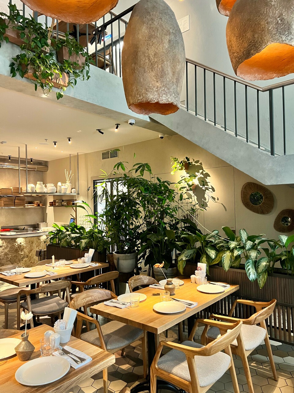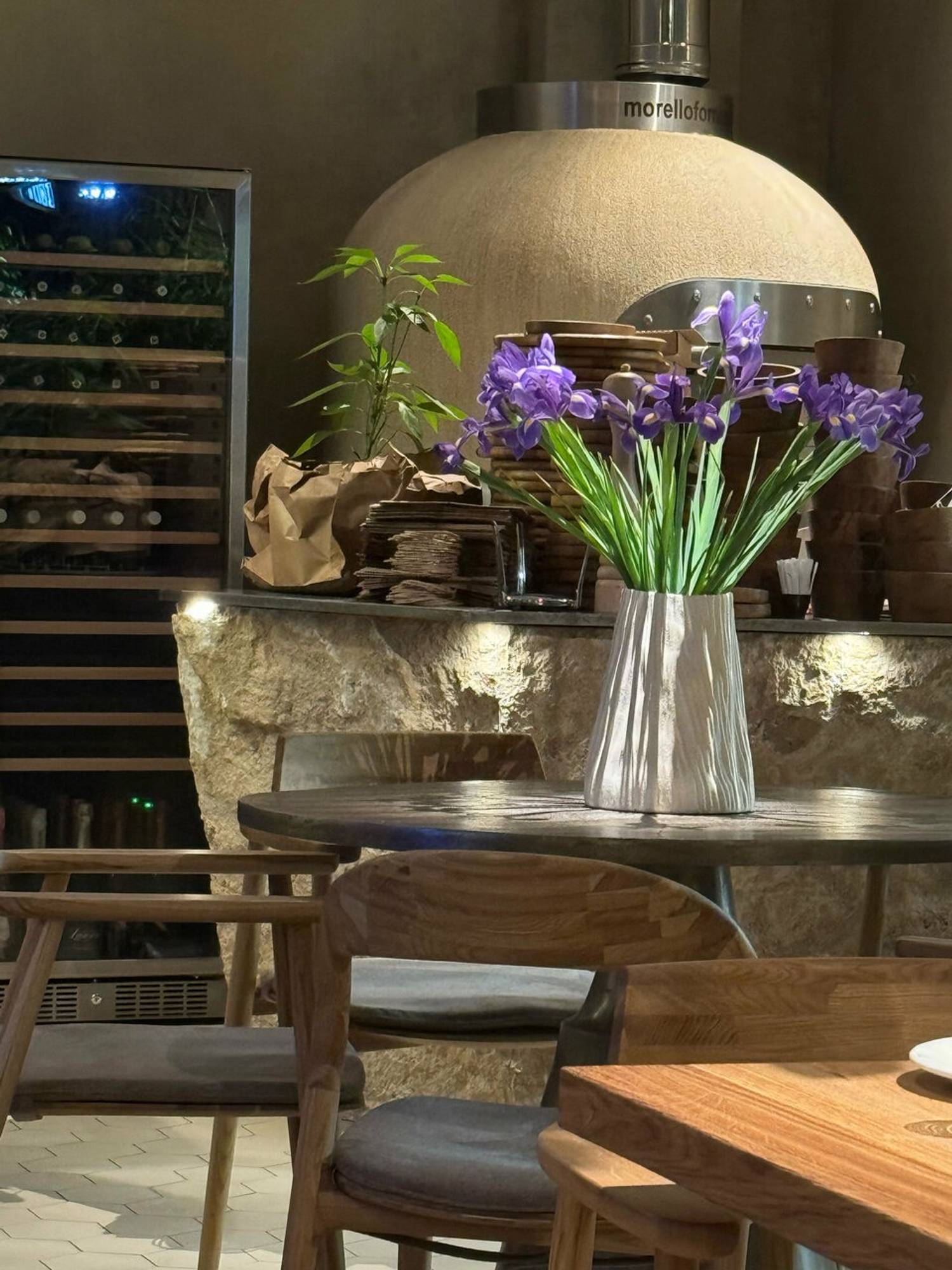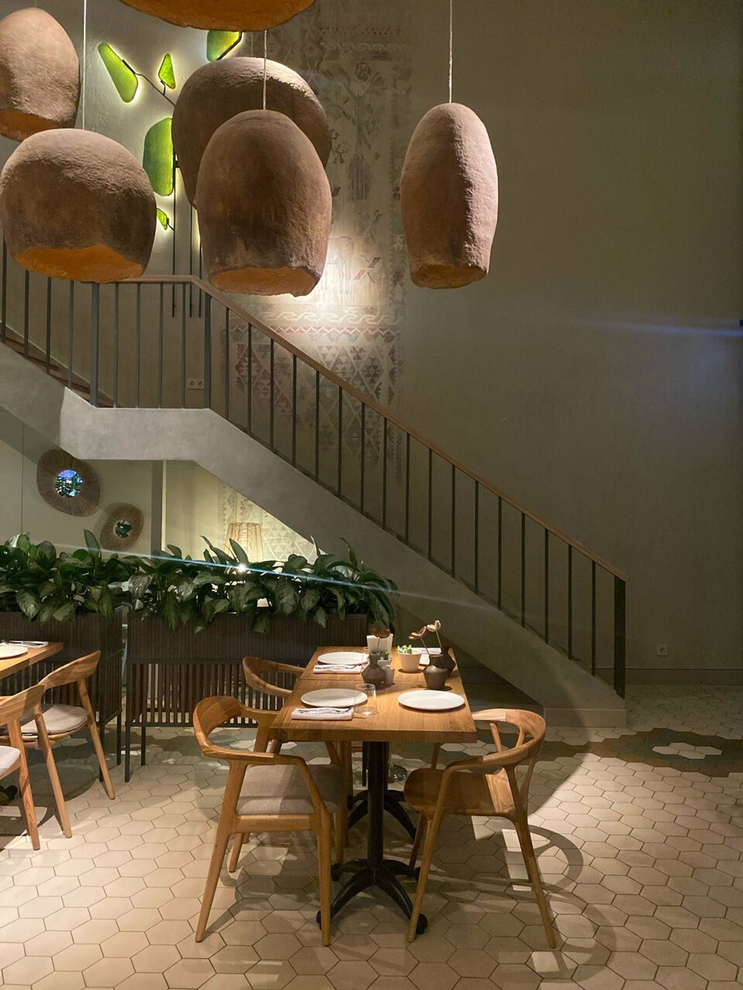 Атмосфера. Первое, что привлекает внимание — глиняные люстры, напоминающие шапки, а следом — витражная подсветка в форме дерева. Традиционный орнамент на полу перекликается с выставленной глиняной посудой. Открытая белая печь, плетеные кресла на летней террасе и теплое освещение создают атмосферу уютного грузинского дома.