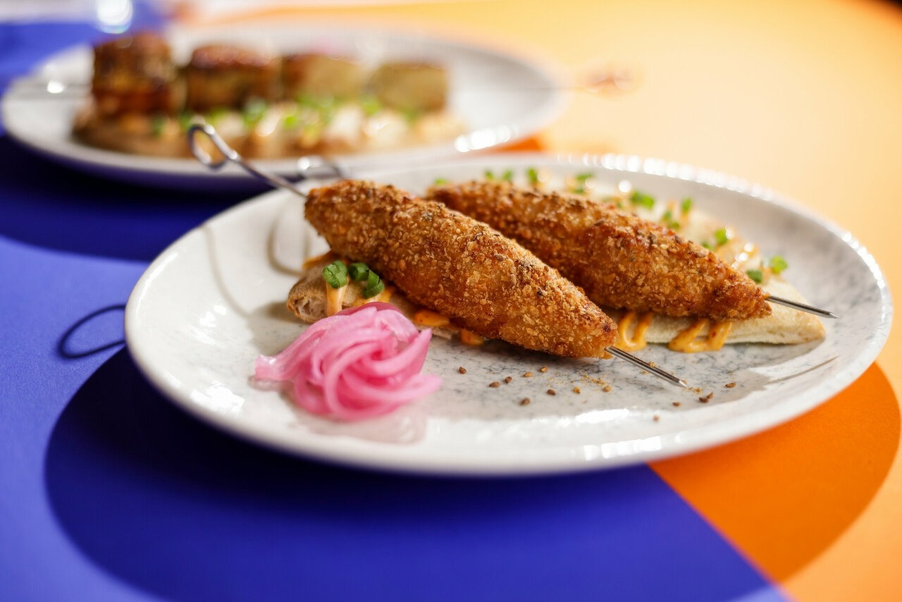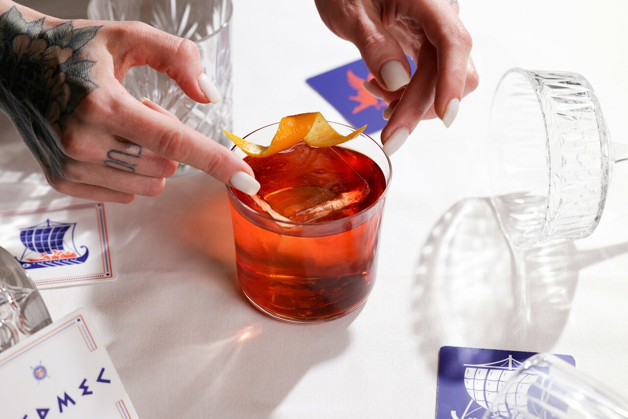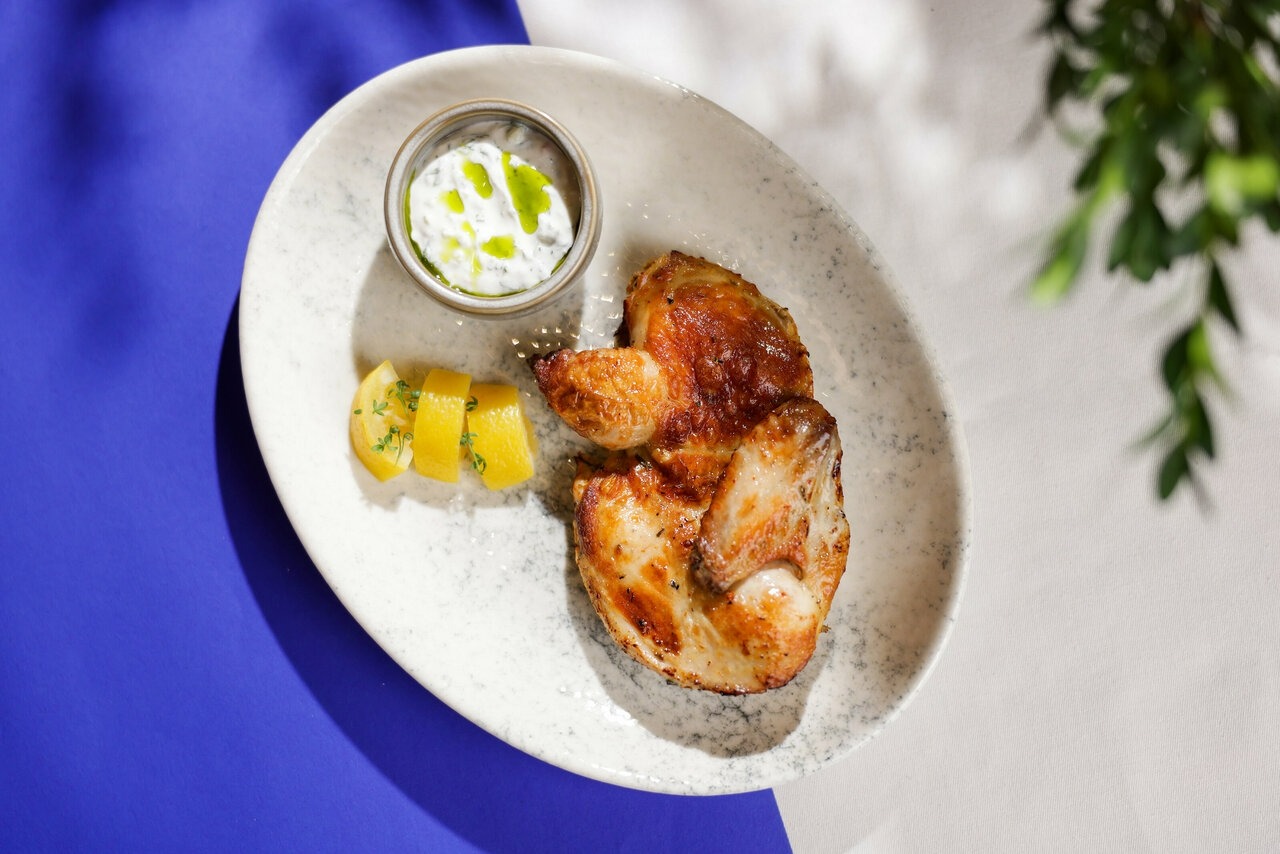 Еда и напитки. В меню сделан акцент на морепродукты: запеченная треска с вонголе, сибас с мидиями и томатным соусом, салаты из печеных овощей с греческим сыром. Есть и мясные блюда: бургер, салат с цыпленком, томленые телячьи щеки. Для любителей овощей — запеченный батат с сыром и миндалем. К каждому блюду можно подобрать напитки из винной карты или классические коктейли.