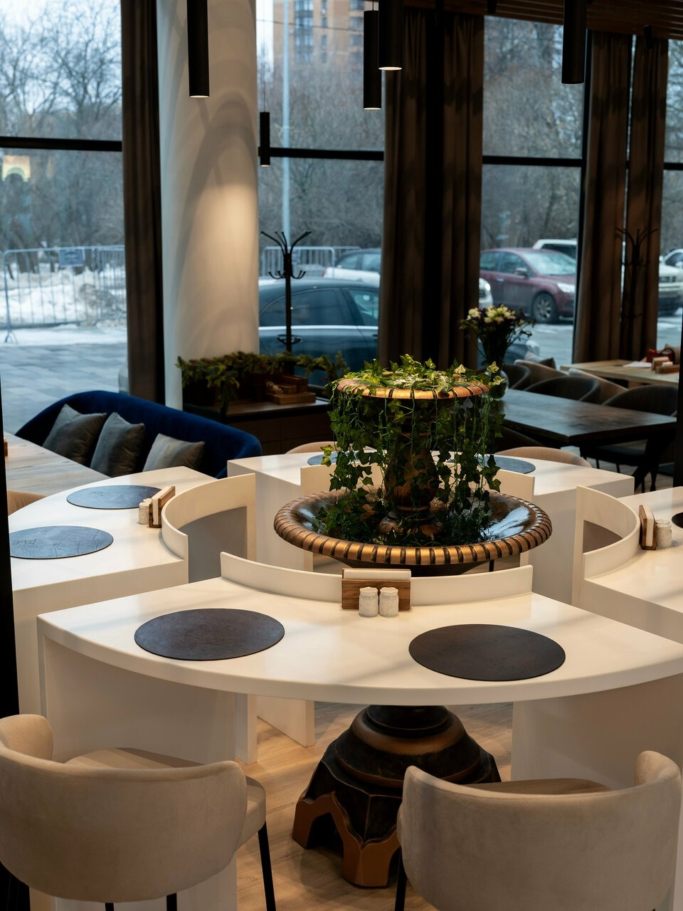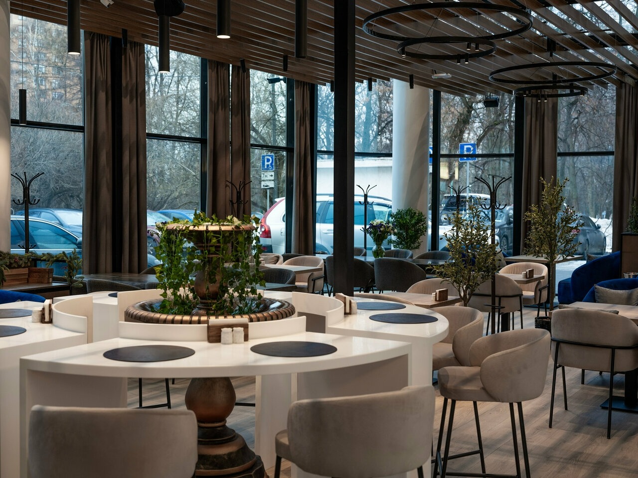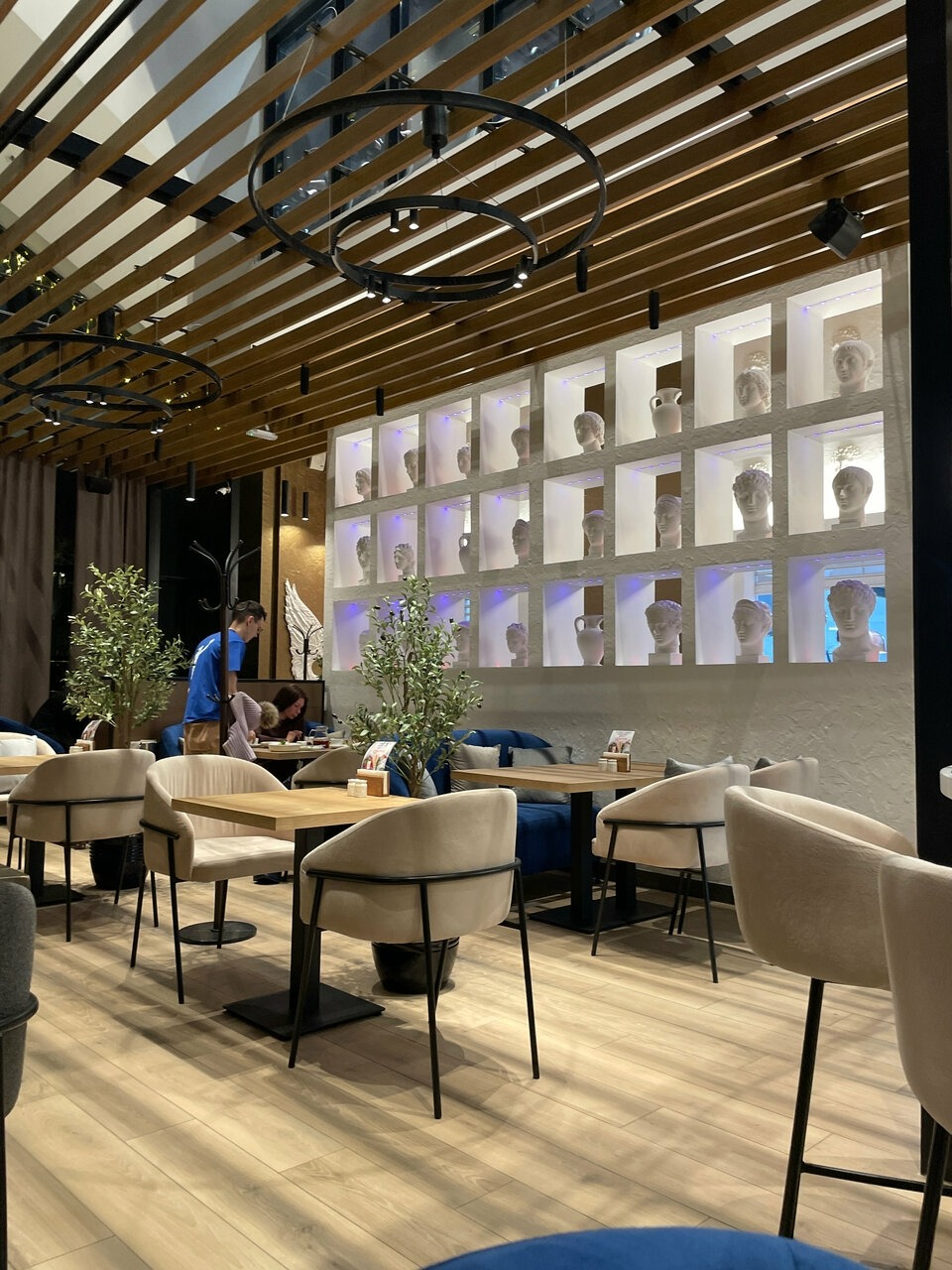Атмосфера. По периметру зала идут панорамные окна, благодаря чему пространство наполнено светом. Те, кто был в другом ресторане сети на Лесной, наверняка узнают отличительную особенность заведения: подсвеченный стеллаж с гипсовыми скульптурами древнегреческих богов.