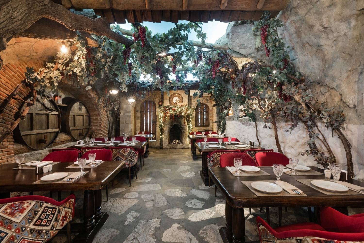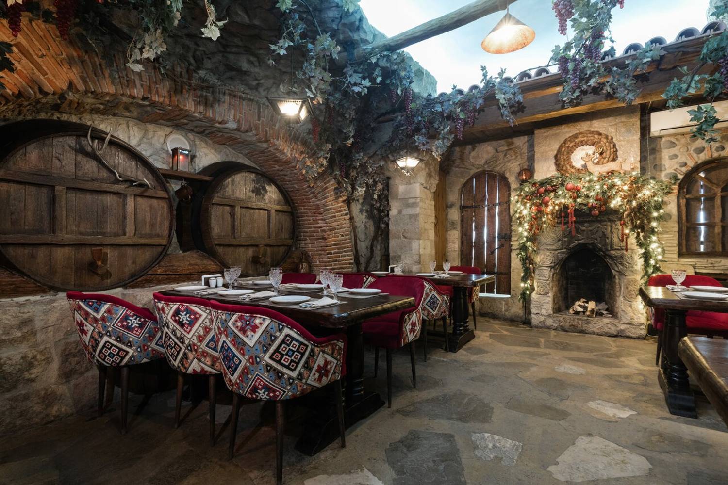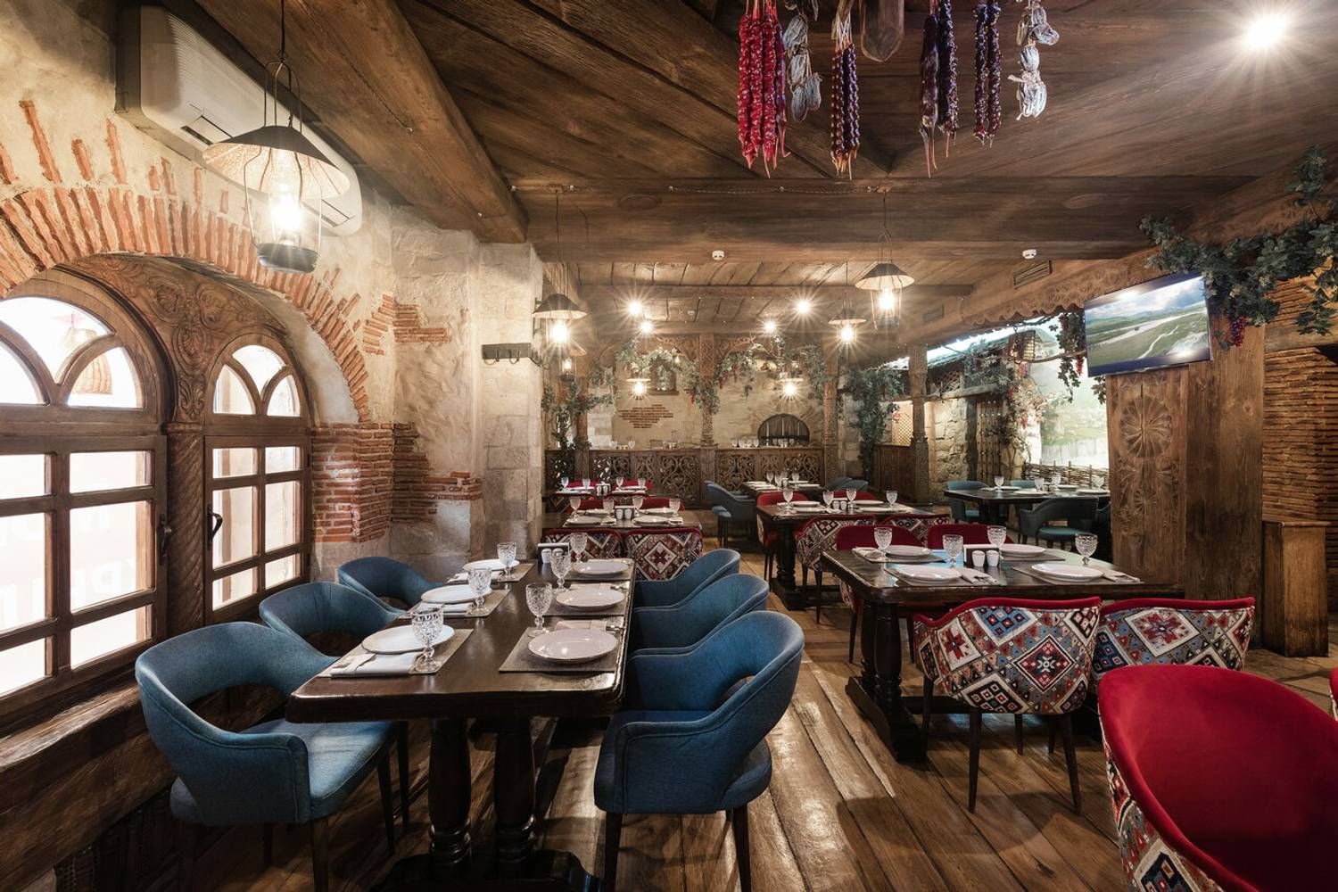 Атмосфера. Интерьер в стиле грузинского дома: деревянная отделка, национальные орнаменты, открытый мангал на виду у гостей и камин. По пятницам и субботам — живая музыка. Также есть VIP-зал для тех, кто хочет побыть наедине.