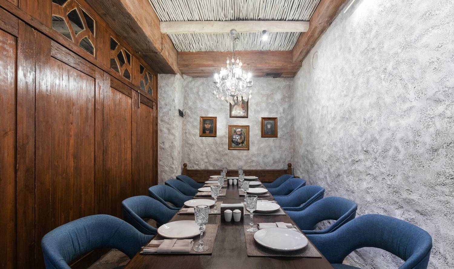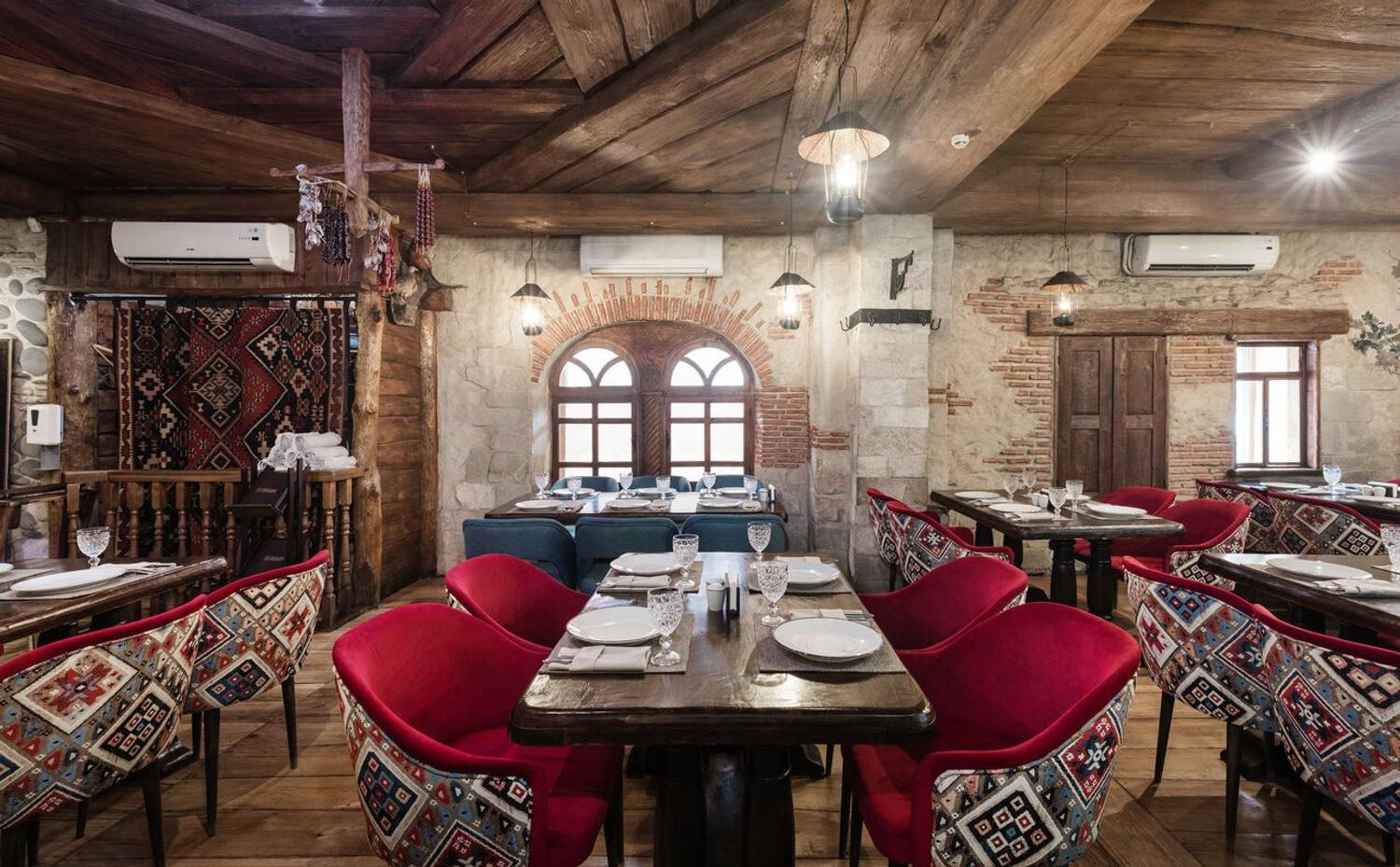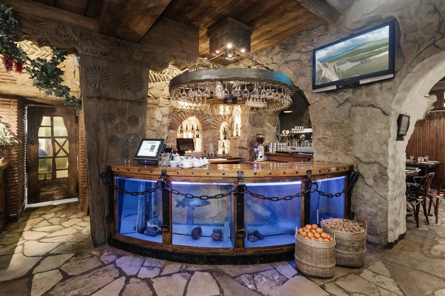 Атмосфера. Интерьер в стиле грузинского дома: деревянная отделка, национальные орнаменты, открытый мангал на виду у гостей и камин. По пятницам и субботам — живая музыка. Также есть VIP-зал для тех, кто хочет побыть наедине.