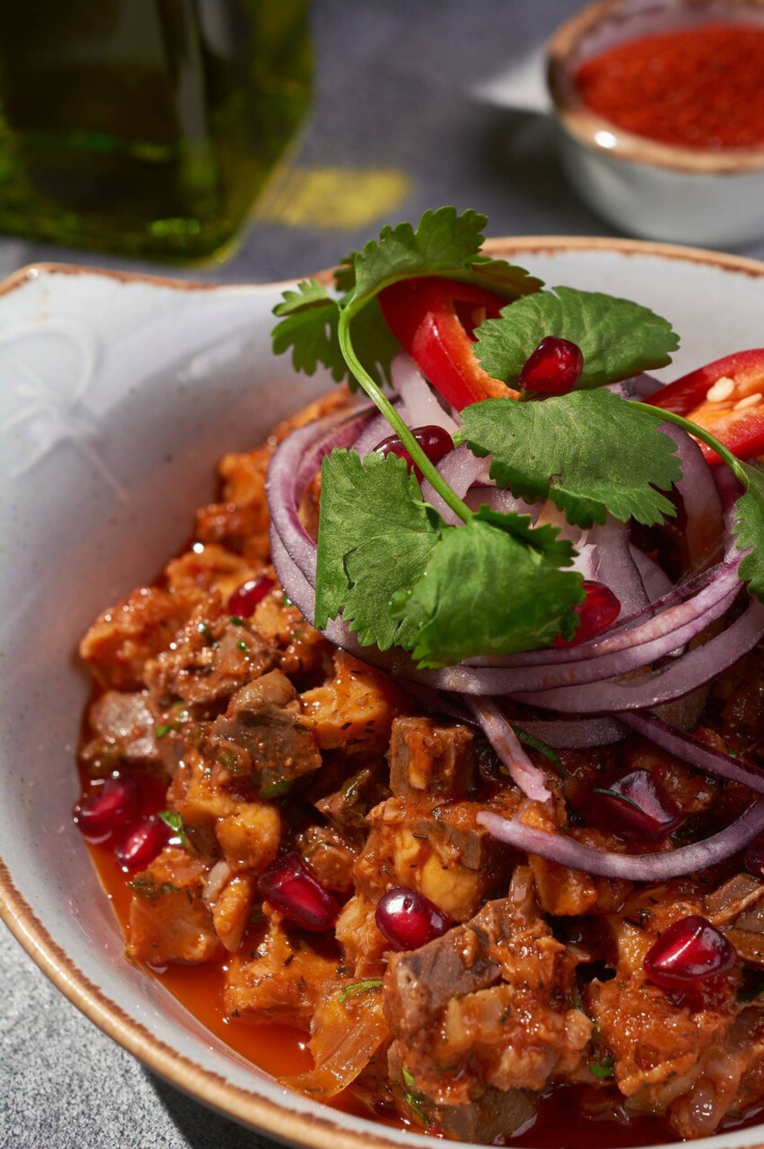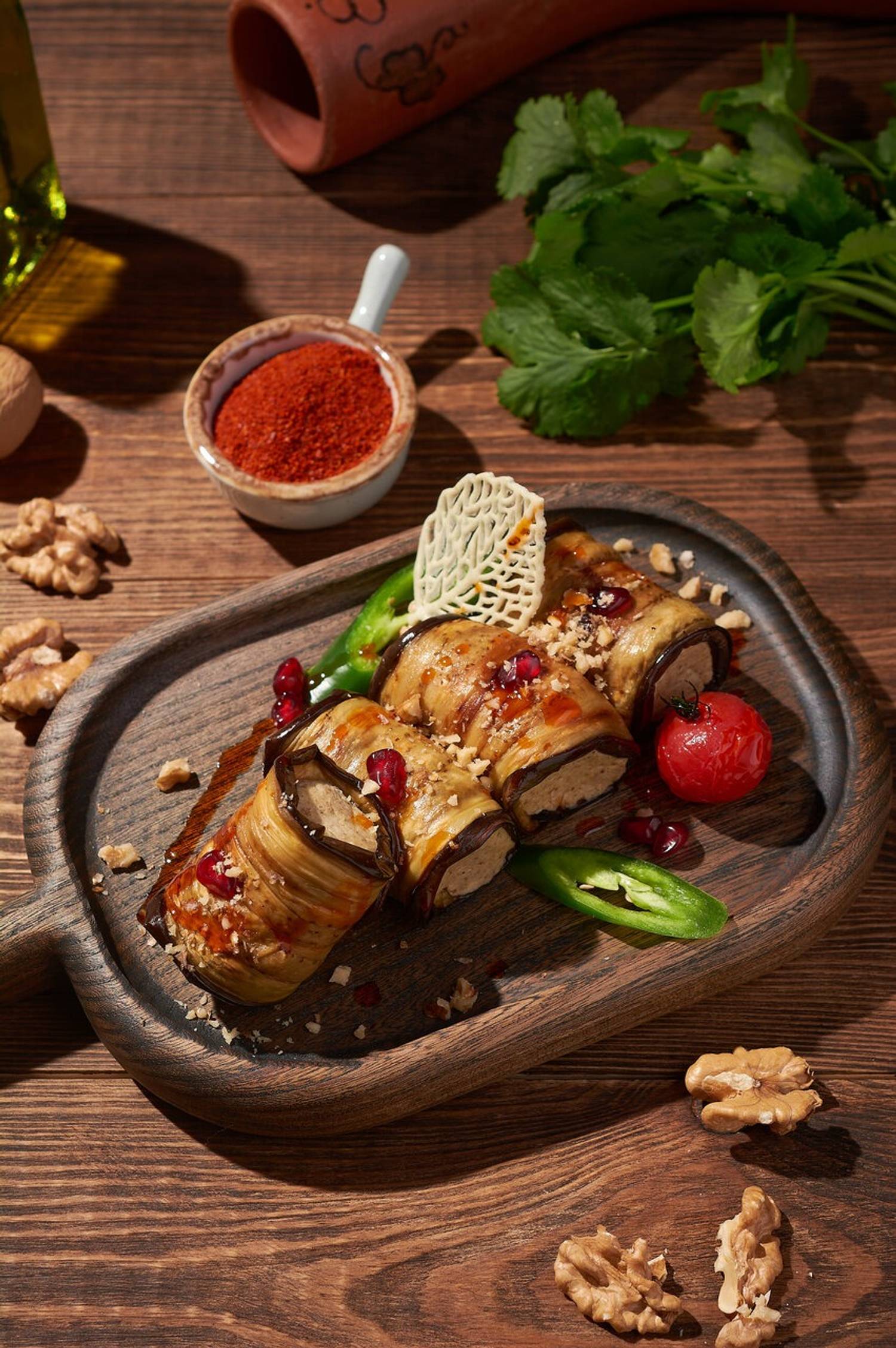 Еда и напитки. В меню — хачапури с грушей и голубым сыром, беконом и овощами, хинкали с индейкой, грибами в сливочном соусе, мясной начинкой и перечным соусом и жареные варианты. Также готовят жареную барабульку по-домашнему, мидии в соусе чашушули и чахохбили из курицы с яйцом пашот. Напитки: вина из Алазанской долины, домашние лимонады из айвы, кизила, фейхоа.